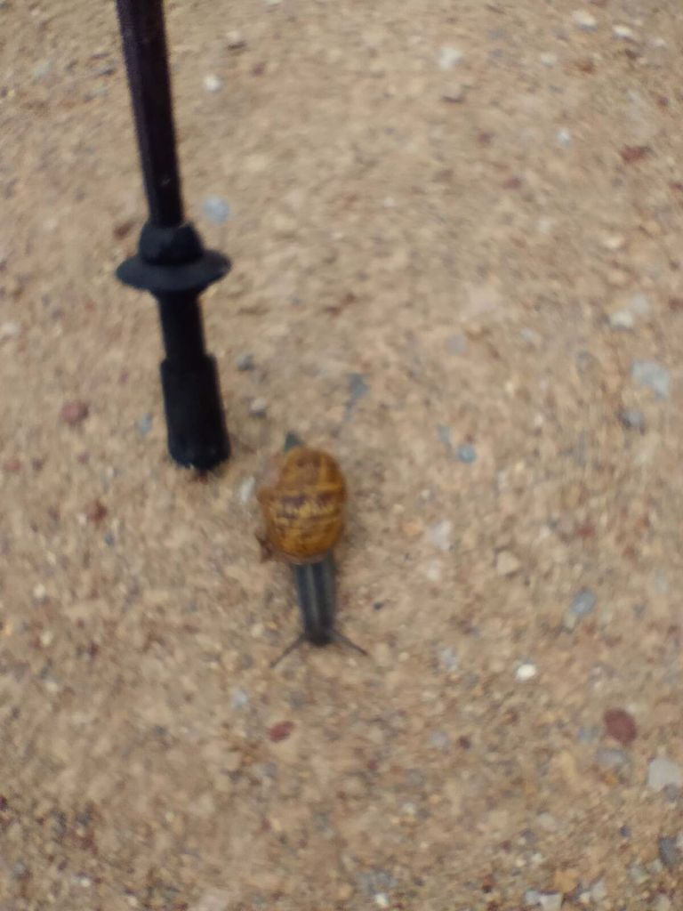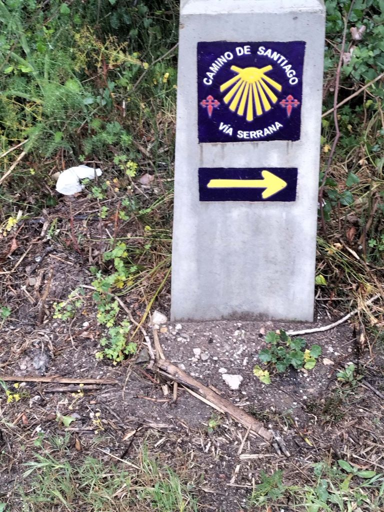 Empezamos por carretera para continuar por pistas de tierra, muy cómodas La lluvia se va acumulando en las hojas.Este es el único mojón de señalización que hemos encontrado, el resto eran flechas pintadas; pocas y confusas.Seguimos caminando por una pista de tierra que da servicio al área de aerogeneradores hacia la que nos dirigimos.La pista de los aerogeneradoresEstaba plagada de caracoles de todos los tamaños. Porque no llevábamos cazuela, que si no…En medio de una zona de comederos para el ganado vacuno hemos visto este artefacto. Arte?, utilidad ganadera?, tengo pendiente aclararlo.Seguimos andando cómodamente por la pista hasta que llegamos a la carretera por donde circulamos durante un rato, pasan pocos coches así que vamos cómodos.Pasamos por esta ganadería de toros bravos.Paramos para hacer un frugal almuerzo de «solo fruta» en Venta La Fuente. Está cerrada desde el COVID según le informa una señora a Fede.