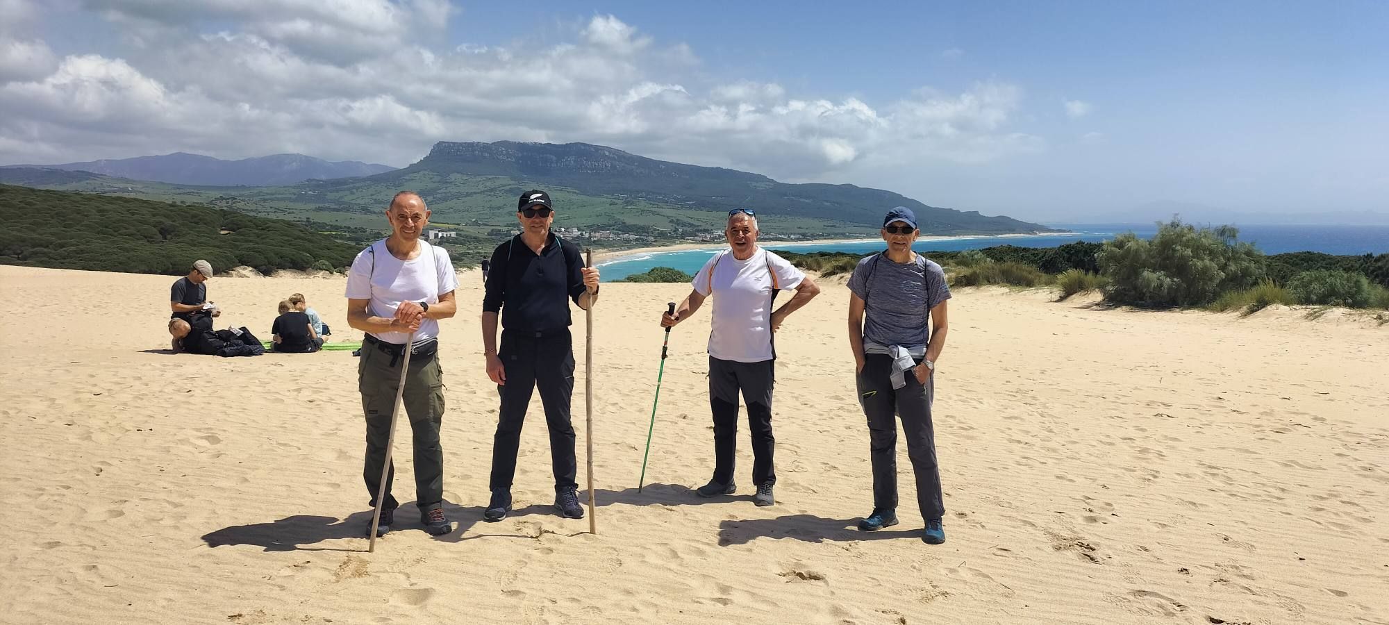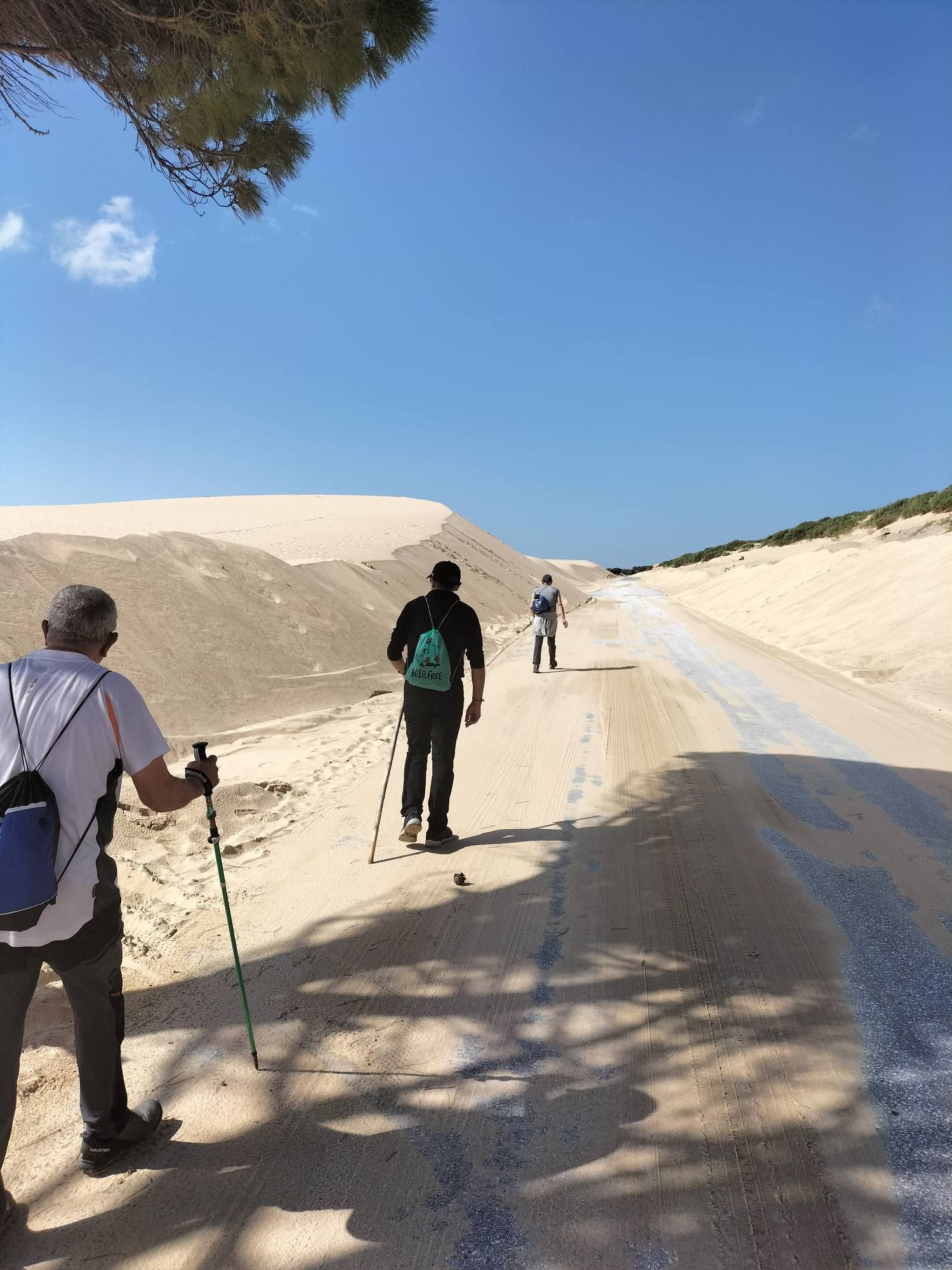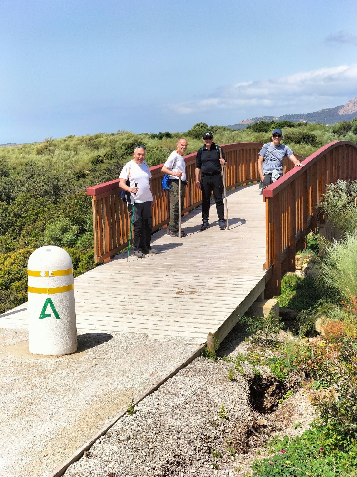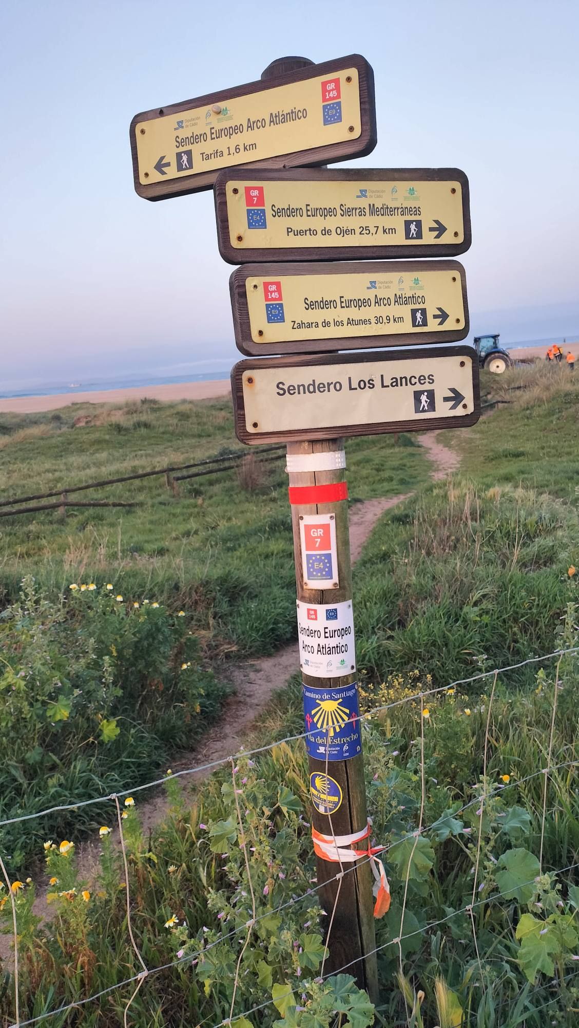 La cuadrilla a punto de iniciar la faena. Todavía hace fresquito (foto Juanjo).Durante un buen rato caminamos por pasarelas de madera que van sobre la arena o las marismas.Desembocadura de un río en Tarifa.Aquí el GR-145 que es la ruta de gran recorrido «Arco Atlantico» que estamos haciendo nosotros, coincide con un camino de Santiago «vía del Estrecho». Seguimos caminando por pasarelas.Todos los caminos que pasan por aquí, incluso la ruta europea E-9 la cual llega hasta Estonia. Hay otros tramos que van junto a la carretera, lo que los hace molestos por el ruido.En un momento dado hay que caminar por la playa, lo que resulta más cansado, pero como todavía llevamos recorrido muy poco, no nos importa.Aquí subiendo la carretera sue atraviesa la duna de Valdevaqueros. A quién se le habrá ocurrido tal cosa ya que se va cubriendo de arena y cada cierto tiempo la tienen que retirar con excavadoras.Es el primer repecho del día, pero como tambien es el primer día vamos muy animados.Marcas del camino de Santiago.Vista de la playa y ensenada de Valdevaqueros desde la duna.Posando sobre la duna de Valdevaqueros.Otra foto más.Atravesamos una zona militar en desuso, en la que había este extraño faro.Atravesamos unos pinares por una pista de tierra compactada la cual salvaba los accidentes del terreno con pasarelas y puentes. Otra construcción para salvar un barranco.Llegando a la playa de Bolonia. Al fondo se puede ver la duna de Bolonia.Antes de llegar a la duna pasamos junto a las ruinas romanas de Baelo Claudia.Más ruinas en Baelo Claudia.Nos dirigimos hacia la duna de Bolonia.Subiendo por la duna de Bolonia. Es un caminar pesado porque la arena es blanda (foto Segun)Ya hemos subido a la duna, al fondo la playa de Bolonia.Otra foto en la cima de la duna para que se vea que yo también estaba.Vista lateral de la duna de Bolonia.Atravesamos una zona de ganado suelto, no sabemos si sera bravo. Hay quien ha pasado nervioso por el lugar (foto Felipe)Playa y urbanizaciones de Atlanterra ¡Menudos casoplones!. Y poco después llegamos a Zahara de los Atunes donde ponemos fin a la etapa.