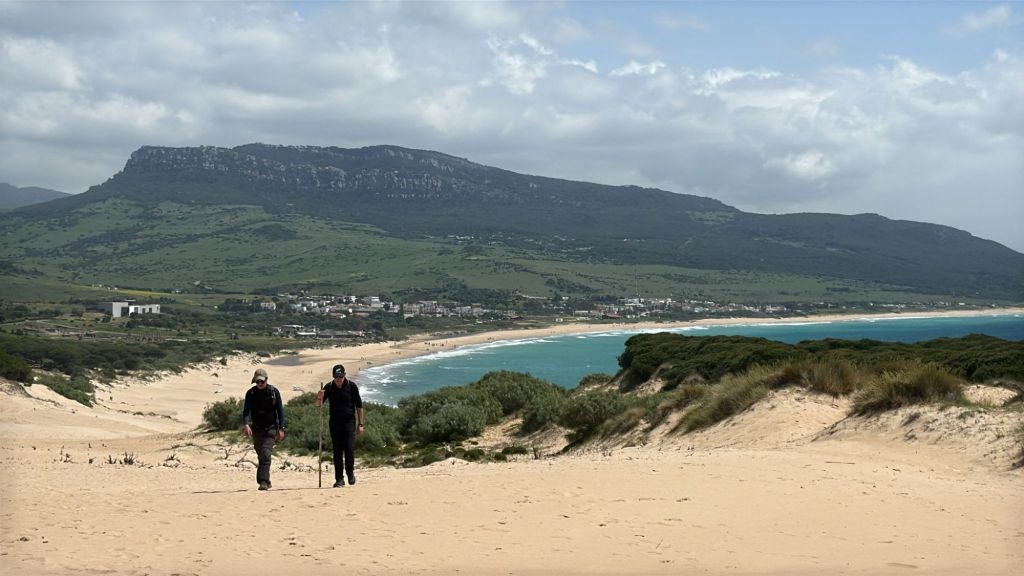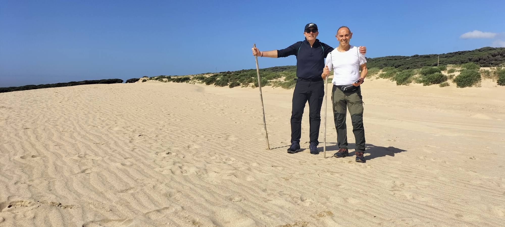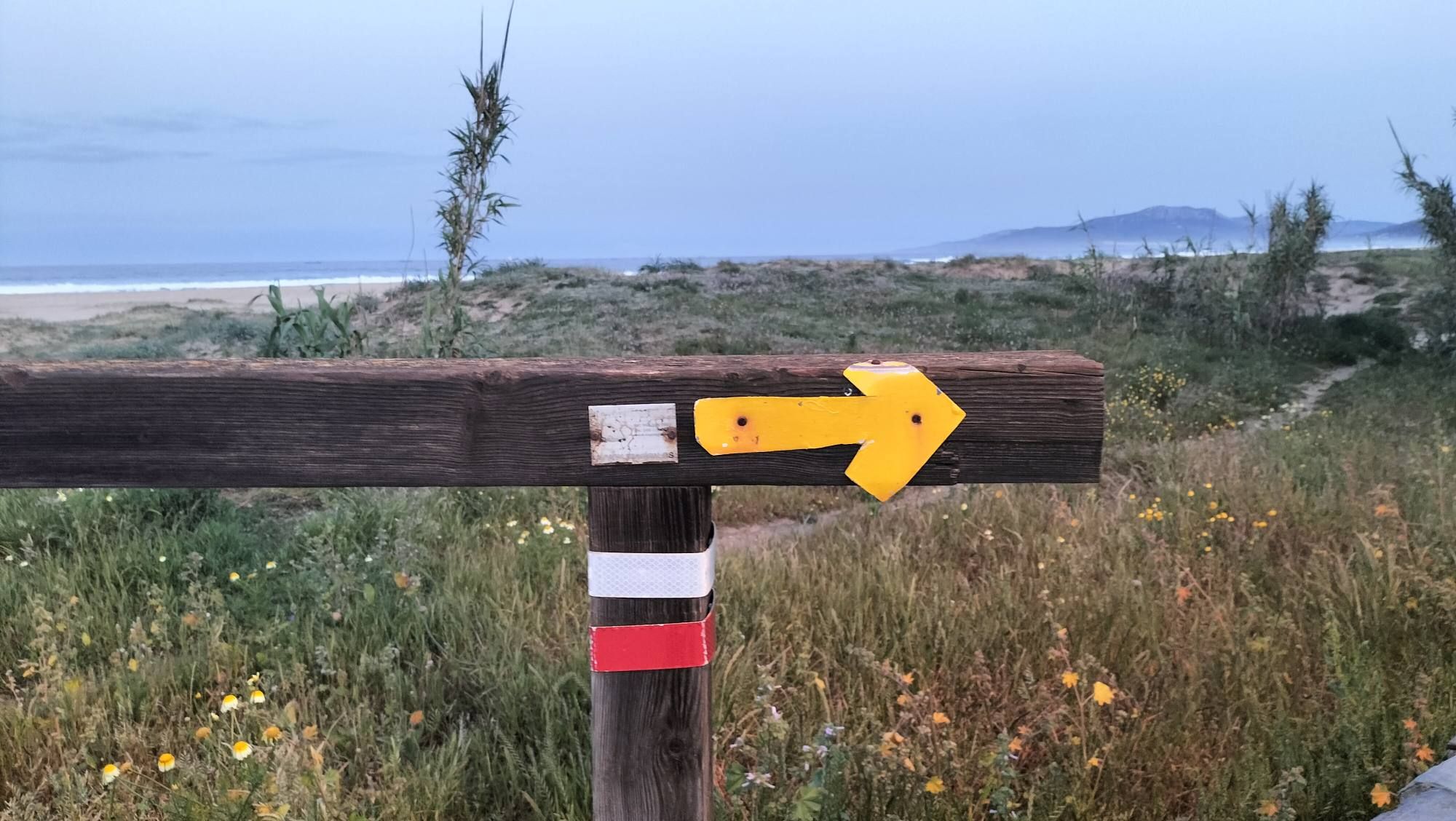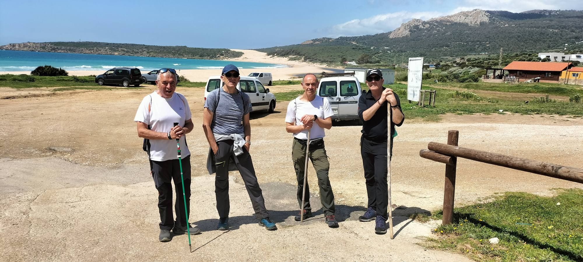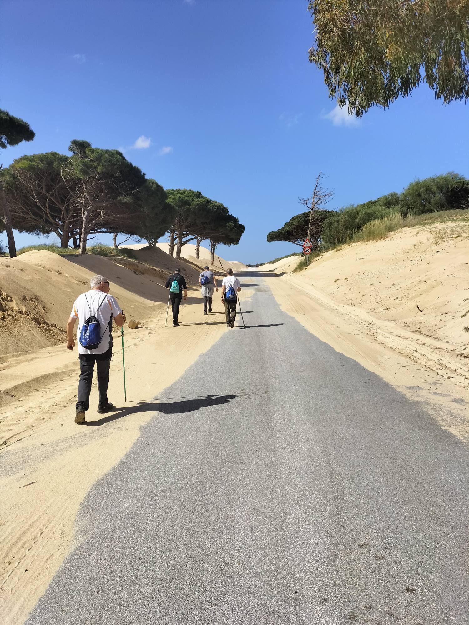 La cuadrilla a punto de iniciar la faena. Todavía hace fresquito (foto Juanjo).Durante un buen rato caminamos por pasarelas de madera que van sobre la arena o las marismas.Desembocadura de un río en Tarifa.Aquí el GR-145 que es la ruta de gran recorrido «Arco Atlantico» que estamos haciendo nosotros, coincide con un camino de Santiago «vía del Estrecho». Seguimos caminando por pasarelas.Todos los caminos que pasan por aquí, incluso la ruta europea E-9 la cual llega hasta Estonia. Hay otros tramos que van junto a la carretera, lo que los hace molestos por el ruido.En un momento dado hay que caminar por la playa, lo que resulta más cansado, pero como todavía llevamos recorrido muy poco, no nos importa.Aquí subiendo la carretera sue atraviesa la duna de Valdevaqueros. A quién se le habrá ocurrido tal cosa ya que se va cubriendo de arena y cada cierto tiempo la tienen que retirar con excavadoras.Es el primer repecho del día, pero como tambien es el primer día vamos muy animados.Marcas del camino de Santiago.Vista de la playa y ensenada de Valdevaqueros desde la duna.Posando sobre la duna de Valdevaqueros.Otra foto más.Atravesamos una zona militar en desuso, en la que había este extraño faro.Atravesamos unos pinares por una pista de tierra compactada la cual salvaba los accidentes del terreno con pasarelas y puentes. Otra construcción para salvar un barranco.Llegando a la playa de Bolonia. Al fondo se puede ver la duna de Bolonia.Antes de llegar a la duna pasamos junto a las ruinas romanas de Baelo Claudia.Más ruinas en Baelo Claudia.Nos dirigimos hacia la duna de Bolonia.Subiendo por la duna de Bolonia. Es un caminar pesado porque la arena es blanda (foto Segun)Ya hemos subido a la duna, al fondo la playa de Bolonia.Otra foto en la cima de la duna para que se vea que yo también estaba.Vista lateral de la duna de Bolonia.Atravesamos una zona de ganado suelto, no sabemos si sera bravo. Hay quien ha pasado nervioso por el lugar (foto Felipe)Playa y urbanizaciones de Atlanterra ¡Menudos casoplones!. Y poco después llegamos a Zahara de los Atunes donde ponemos fin a la etapa.