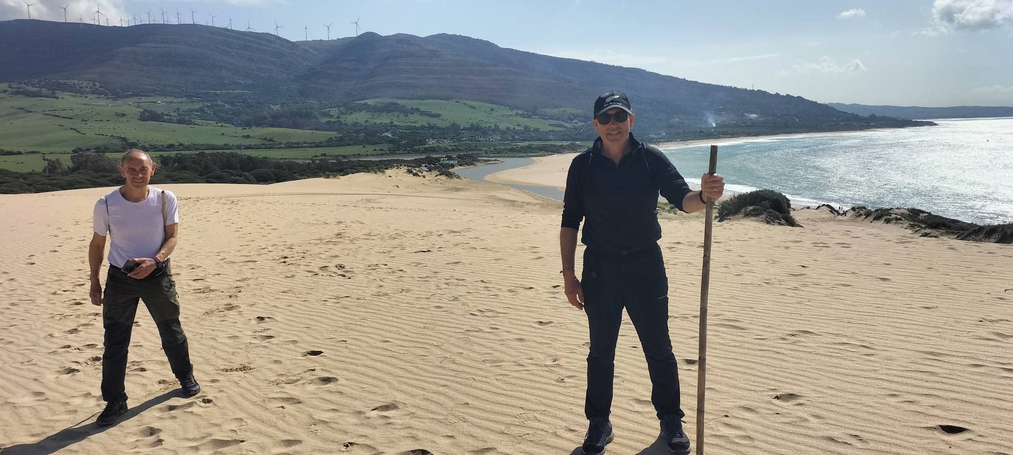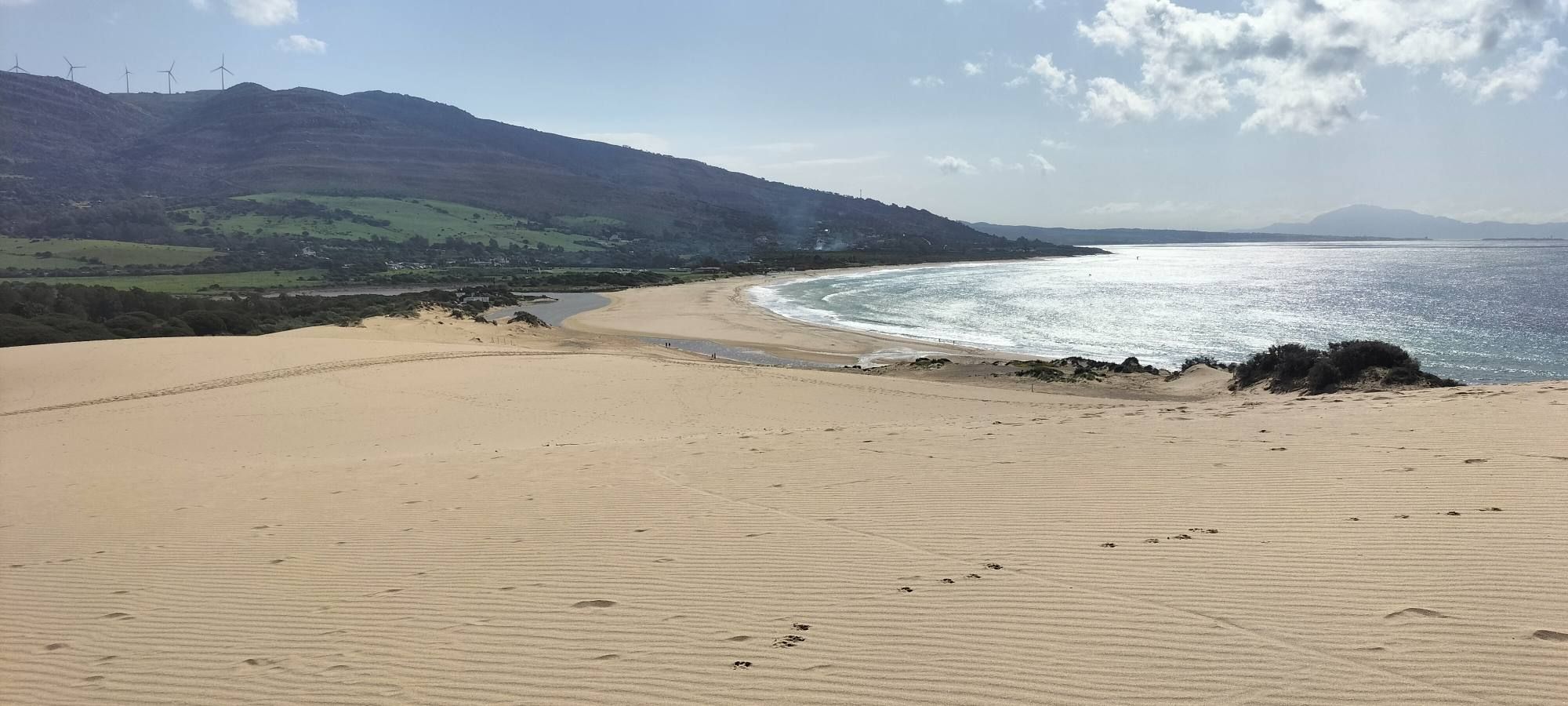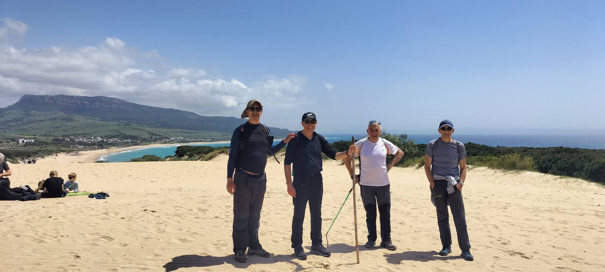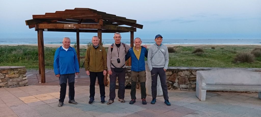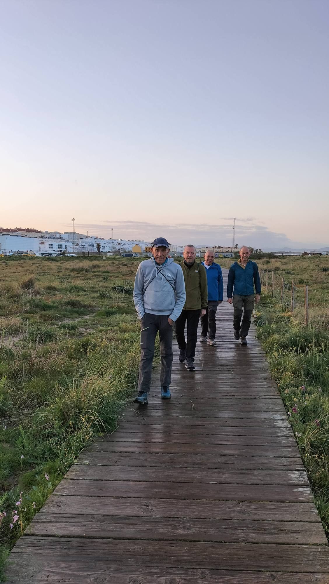 La cuadrilla a punto de iniciar la faena. Todavía hace fresquito (foto Juanjo).Durante un buen rato caminamos por pasarelas de madera que van sobre la arena o las marismas.Desembocadura de un río en Tarifa.Aquí el GR-145 que es la ruta de gran recorrido «Arco Atlantico» que estamos haciendo nosotros, coincide con un camino de Santiago «vía del Estrecho». Seguimos caminando por pasarelas.Todos los caminos que pasan por aquí, incluso la ruta europea E-9 la cual llega hasta Estonia. Hay otros tramos que van junto a la carretera, lo que los hace molestos por el ruido.En un momento dado hay que caminar por la playa, lo que resulta más cansado, pero como todavía llevamos recorrido muy poco, no nos importa.Aquí subiendo la carretera sue atraviesa la duna de Valdevaqueros. A quién se le habrá ocurrido tal cosa ya que se va cubriendo de arena y cada cierto tiempo la tienen que retirar con excavadoras.Es el primer repecho del día, pero como tambien es el primer día vamos muy animados.Marcas del camino de Santiago.Vista de la playa y ensenada de Valdevaqueros desde la duna.Posando sobre la duna de Valdevaqueros.Otra foto más.Atravesamos una zona militar en desuso, en la que había este extraño faro.Atravesamos unos pinares por una pista de tierra compactada la cual salvaba los accidentes del terreno con pasarelas y puentes. Otra construcción para salvar un barranco.Llegando a la playa de Bolonia. Al fondo se puede ver la duna de Bolonia.Antes de llegar a la duna pasamos junto a las ruinas romanas de Baelo Claudia.Más ruinas en Baelo Claudia.Nos dirigimos hacia la duna de Bolonia.Subiendo por la duna de Bolonia. Es un caminar pesado porque la arena es blanda (foto Segun)Ya hemos subido a la duna, al fondo la playa de Bolonia.Otra foto en la cima de la duna para que se vea que yo también estaba.Vista lateral de la duna de Bolonia.Atravesamos una zona de ganado suelto, no sabemos si sera bravo. Hay quien ha pasado nervioso por el lugar (foto Felipe)Playa y urbanizaciones de Atlanterra ¡Menudos casoplones!. Y poco después llegamos a Zahara de los Atunes donde ponemos fin a la etapa.