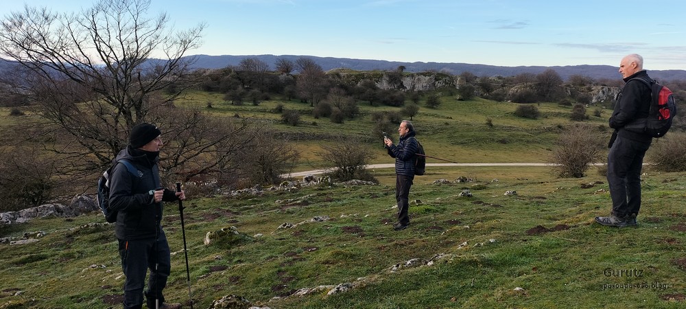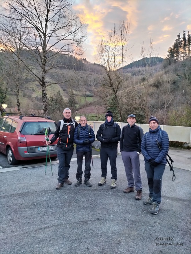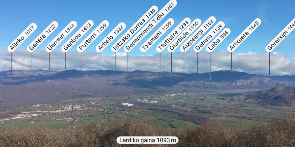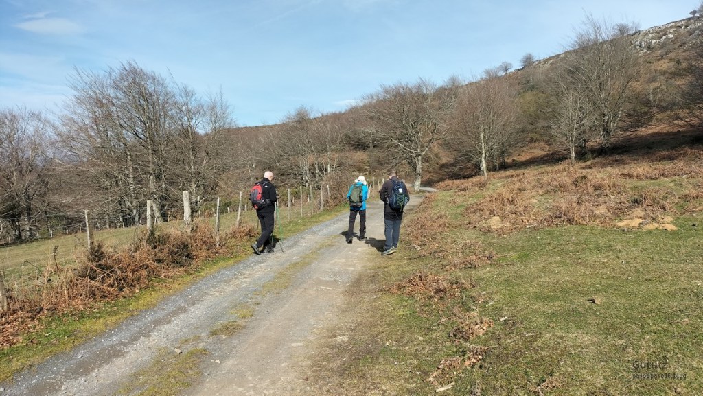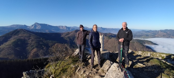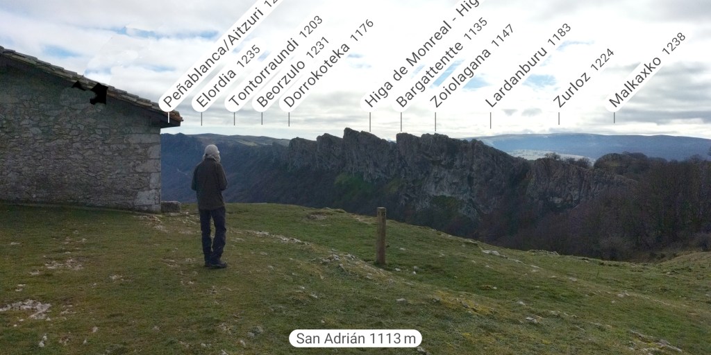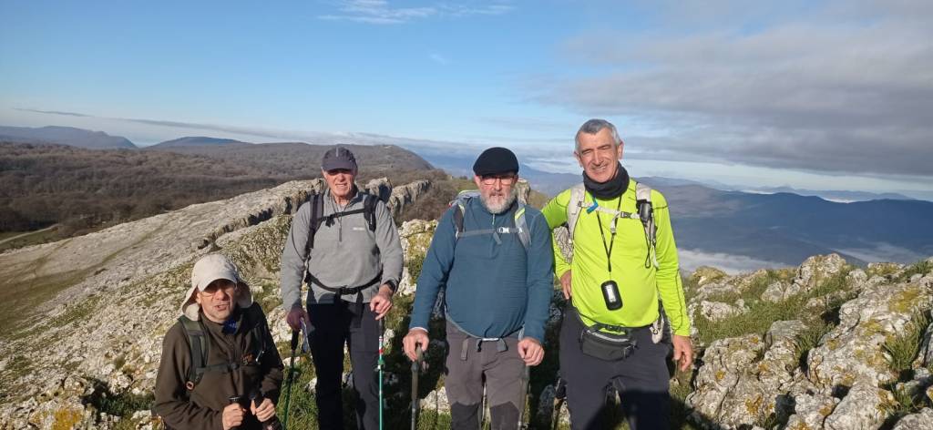 Hoy nos juntamos cinco mendizales para hacer esta circular, Mikel, Fede, Fernando, Javier y Juan Cruz. Nos vamos hasta el alto de Lizarraga para, desde allí, visitar el arco de Portupekoleze, la cueva de Lezehaundi y ascender a las cimas de Bargattente (1125), Posutxar (1131), San Adrián (1109), Iruelorrieta (1086), Peña Arrangarte (1086) y Ollideko Bizkarra (1068). En total hemos hecho 15,7 km, con un desnivel positivo acumulado de 600 m. el cual hemos completado en 5:52 horas. Al inicio de la ruta hacía frio, unos 6 grados, pero poco a poco ha ido subiendo la temperatura y al final hacía calor. La mayor parte del día hemos tenido cielos despejados.