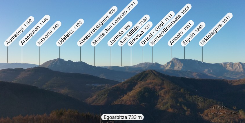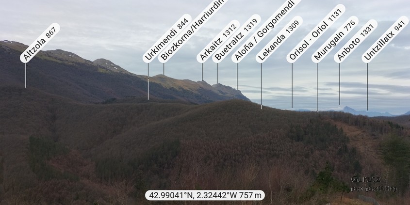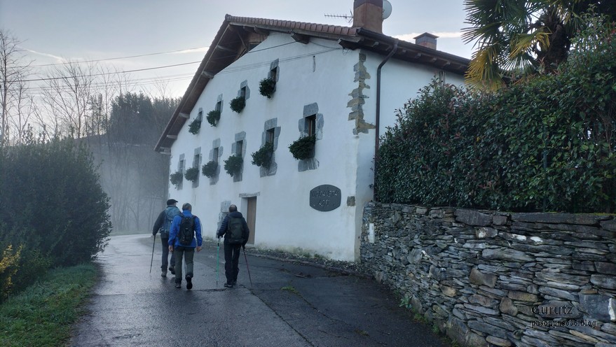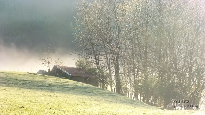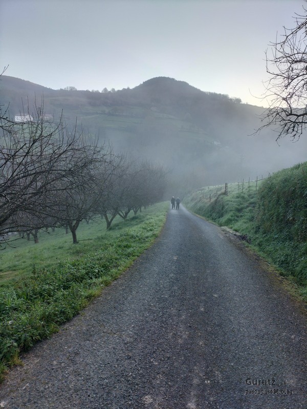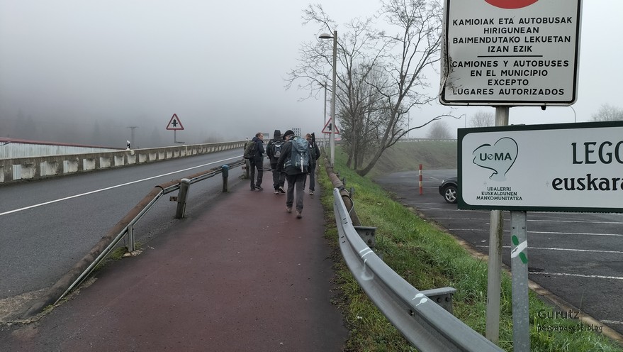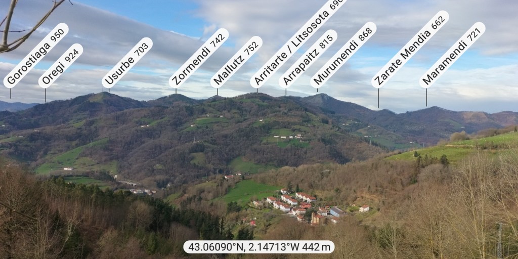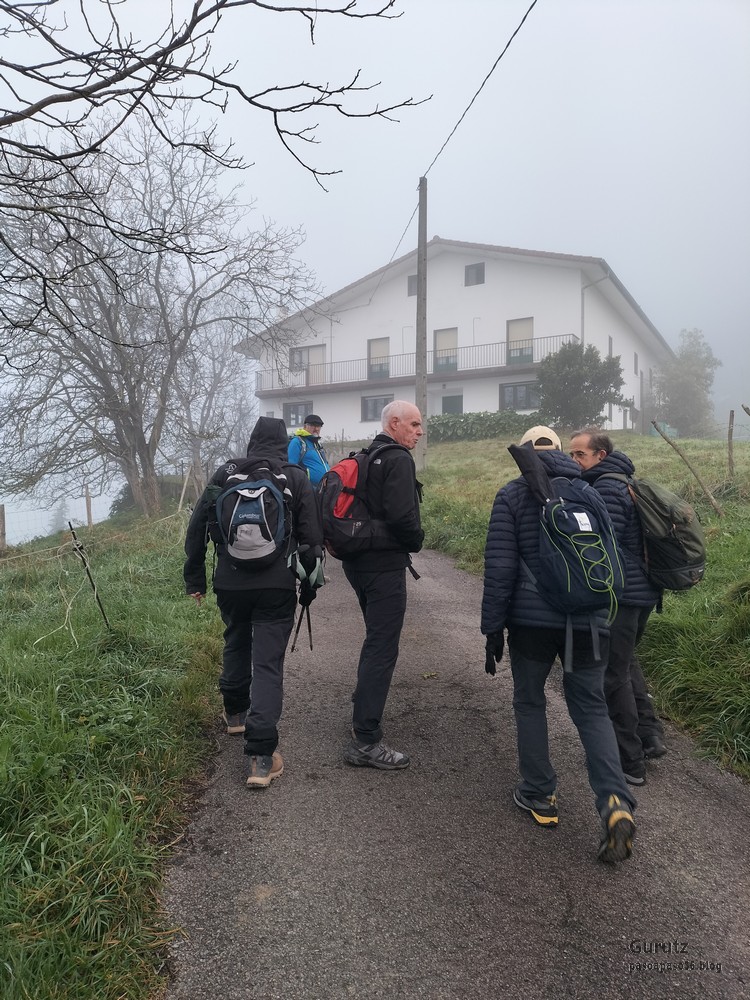 A Legorreta vamos en tren. Al llegar encontramos niebla.Cruzando el puente sobre el río Oria; por este punto pasa el camino de Santiago en su versión «Camino Vasco del interior», por eso el muro tiene una concha de peregrino. Poco despues llegamos a la plaza principal y aprovechamos para tomar una café.El grupo delante de la casa consistorial y de la cafetería.Ya casi a las afueras de Legorreta hay este humilladero.Empezamos a ascender por fuerte pendiente de hormigón. La niebla que nos rodea irá desapareciendo a medida que ascendamos.A ratos hay asfalto.Junto al caserío Urdaneta-Azpi.Ya hemos dejado abajo la nieblas y vemos los montes de los alrededores, entre los que destaca la cima rocosa de Murumendi.Murumendi emerge de la niebla (Foto Koldo)Monte Maramendi, en las estribaciones de Murumendi, Íbamos contentos y alegres hasta que, de repente había que atravesar un barrizal. Aquí Koldo avanzando con cuidado y protestando (inhabitual)Mikel parece que va a perder el equilibrio; yo tenía la cámara preparada, pero no hubo suerte, nadie se cayó; eso sí, las botas se embarraron mucho.Una vista de Murumendi desde el Barrio Sarasola.casa solar y escudo de Sarasola.A partir de aquí comienza una carretera hormigonada. En la foto los miembros del grupo intentando ver Itsasondo entre los árboles.Un grupo de caballos pastando junto al cruce que nos llevará a Altzaga, al fondo se puede distinguir OrdiziaAquí se ve mejor Ordizia.A la entrada de Altzaga había un rosal si ninguna hoja y con un solo capullo. No me he podido resistir a hacerle una fotoIglesia de Altzaga con una gran encina delante.Juanjo acercándose al panel que informa acerca de la centenaria encina. Tiene 3,6 metros de circunferencia y una altura de 18 metros. A pesar de su porte no está catalogado como árbol singular de Gipuzkoa.De Altzaga salimos por una pista hormigonada con mucha pendiente por lo que había que tener cuidado de no resbalar con el musgo.Borda a un lado del empinado camino.Ovejitas pastando con la vista de Txindoki al fondo.Vista de Itasondo.A lo largo de buena parte del recorrido pasamos por el PR-GI 1 «Arama-Altzagarate-Arama»Cazador cazado fotografiando la Errmita de Altzagarate (Foto Juanjo)Vista de Ordizia desde el mirador de Altzagarate (Foto Juanjo)Una vista de Aralar desde el mirador de Altzagarate.Detalle de los picos de Aralar.La presencia de Txindoki es espectacular.Tras dejar Altzagarate la carretera hormigonada se transforma en una pista de tierra que discurre entre un pinar.Estos se han quedado atrás porque no paran de hablar, aunque siempre están de acuerdo uno con el otro en todos los temas.Cambiamos de vertiente y tenemos Orendain a la vista, también los montes Otsabio y Laparmendi en cuyas laderas de puede ver la cantera de Altzo.una vista extraordinaria hacia Aralar.Llegamos a la zona de San Juan Iturri, con su fuente y lavadero. Un brindis con agua fresquita por la jornada de monte que estamos disfrutando (Foto Fernando)Agua sin tratar. Menos mal que he brindado pero no he bebido.El lavadero.Había un área recreativa con mesas y bancos y aprovechamos para almorzar. A partir de aqui el grupo se escindió y Juanjo, que tenía algún compromiso de regresar temprano, se fue a Baliarrain primero y después a Ikaztegieta pasando por el embalse de Ibiur. Hizo unas fotos de los lugares por donde pasó que he puesto al final del reportaje.Vamos bajando por carretera la mayor parte del tiempo; abajo podemos ver Altzaga y arriba Murumendi y su cordal.Omnipresente Txindoki.Dos caballos pastando. Los montes de detrás no se cuales son.Vista hacia AizkorriPozo de agua junto al caserío Abali (Foto Koldo)Un árbol con Kakis muy cerca de Arama.Ya estamos llegando a Arama.Frontón de Arama, junto al que había una fuente donde aprovechamos para quitar el barro a las botas y cambiarnos de ropa (Foto Koldo)Koldo junto a la iglesia de Arama, la cual tiene una forma y un color poco habituales por esta zona; se ve desde la carretera N-1. Junto a ella hemos comido un menú del día en el Ostatu Toki Alai y, de allí, en un corto trayecto, hemos ido a la estación de tren de Itsasondo donde hemos cogido el tren que nos ha devuelto a Donosti.
