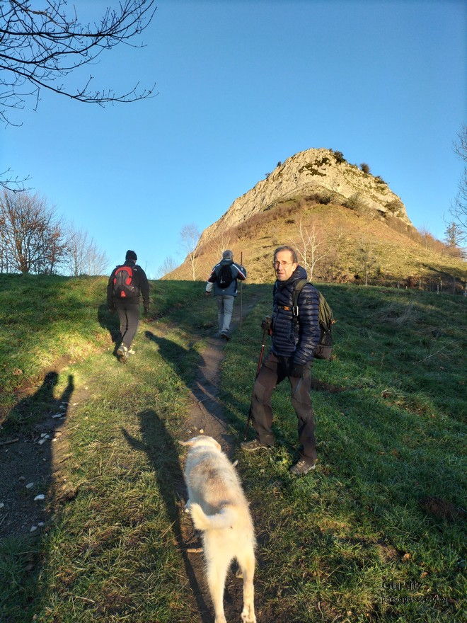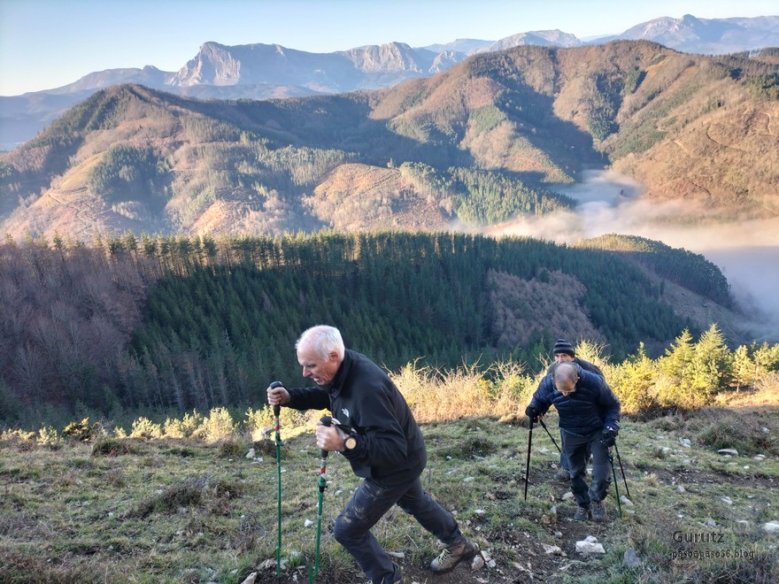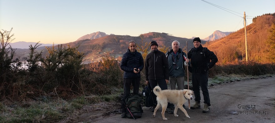 Vista desde el alto de Karabieta hacia Udalaitz y Anboto.Está amaneciendo y los valles están cubiertos por nubes bajas. Al fondo Aizkorri.Foto de Inicio, de izda. a dcha. Javier, Koldo, Josean, Fede y, a cuatro patas, Alai, que se lo ha pasado fenomenal y no ha dado muestras de cansancio.La temperatura es muy fría y la escarcha cubre los campos.Hacia aquella peña del fondo nos dirigimos, Egoarbitza, primero por carretera y después por pistas y caminos, en alguno de los cuales hay bastante barro.Los charcos están helados y estos rompiendo el hielo, físicamente, no metafóricamente; si es que son como niños.Las vistas son preciosas, destacando la mole rocosa de Anboto. Algún día lo subiremos, lo tengo pendiente y cada vez que lo veo me reta.Hacia esa peña vamos.Aquí en pleno esfuerzo de ascensión.Ya queda menos.