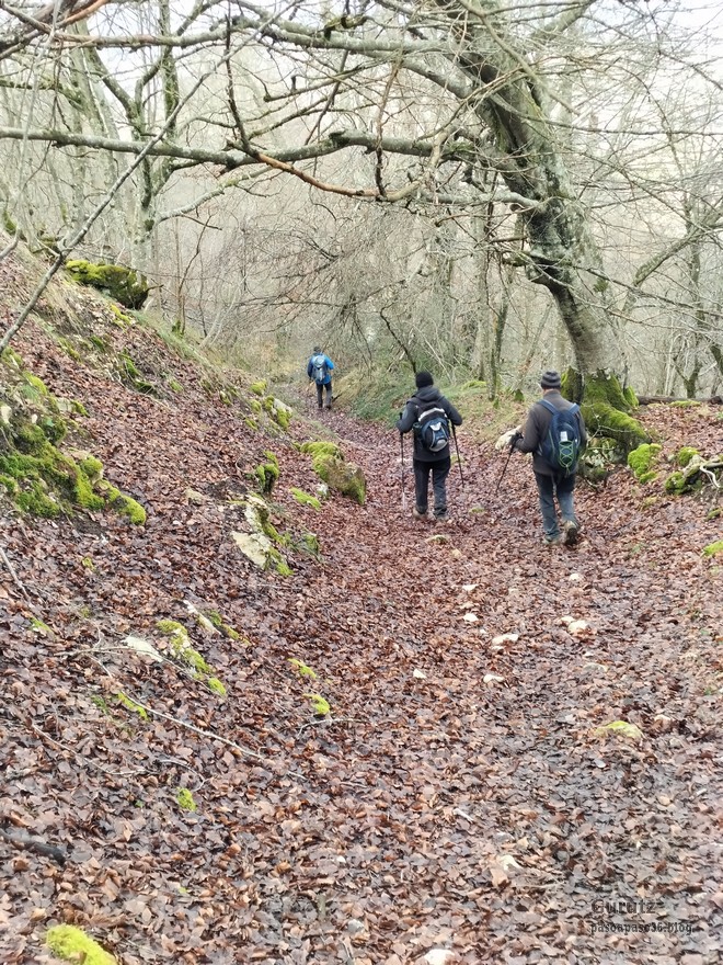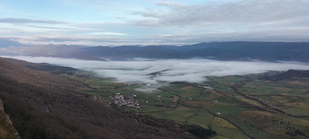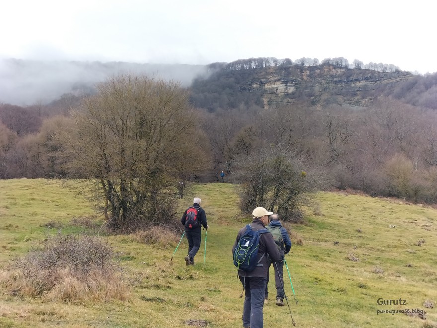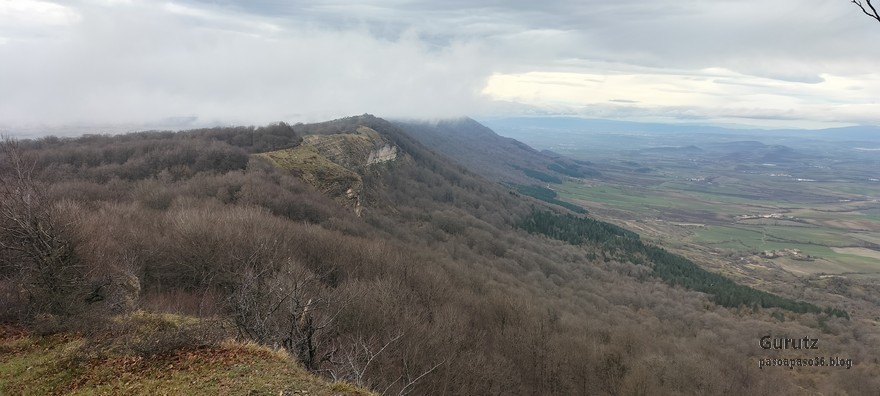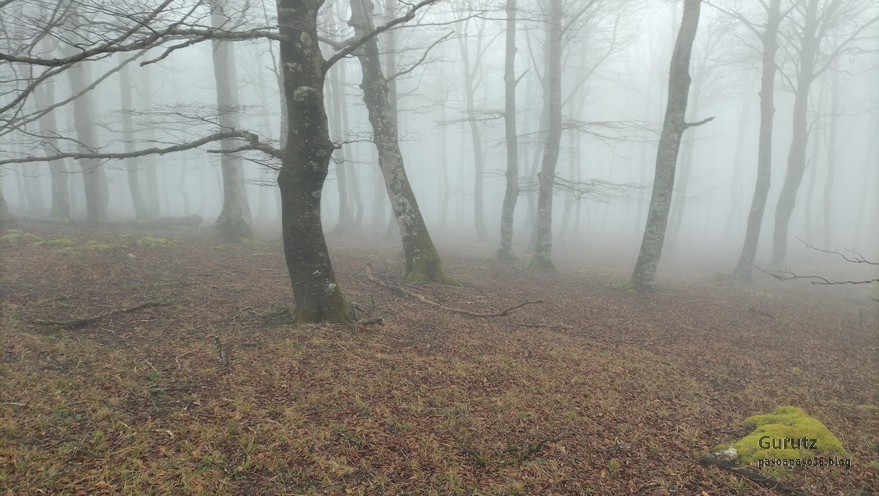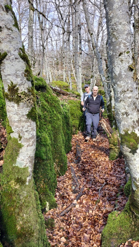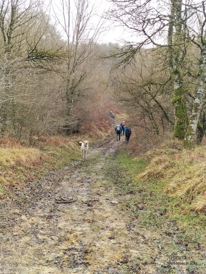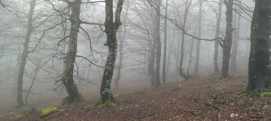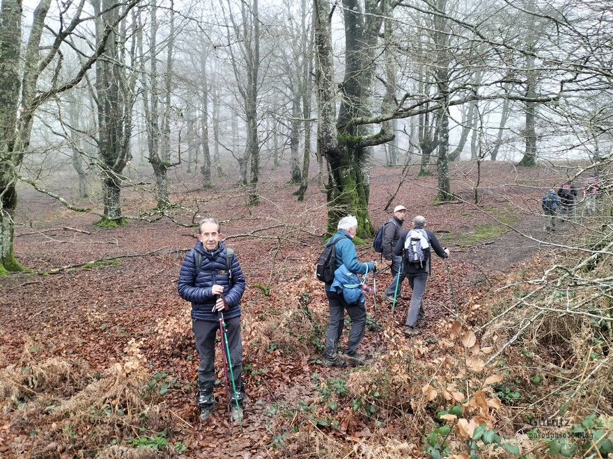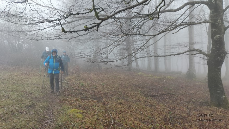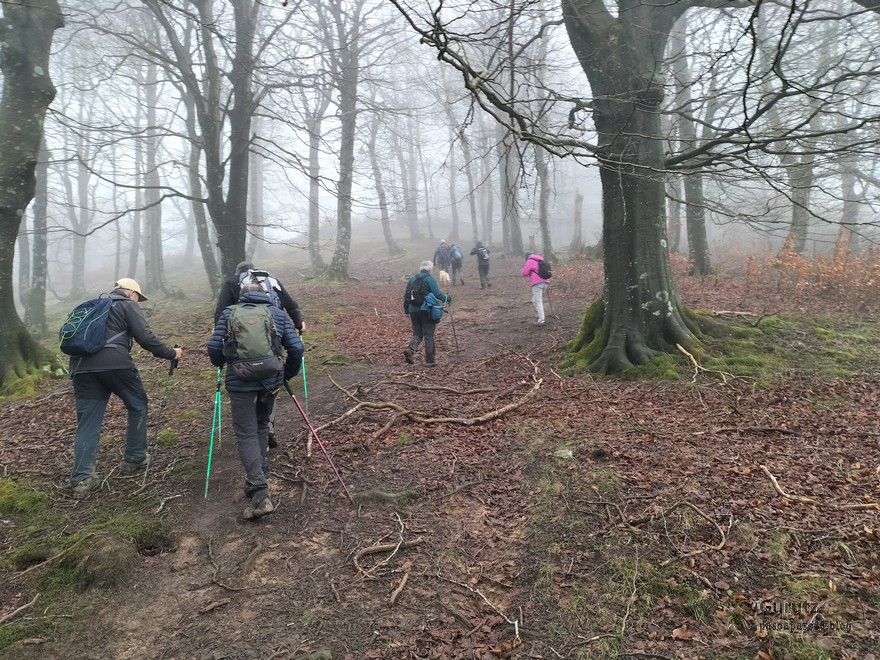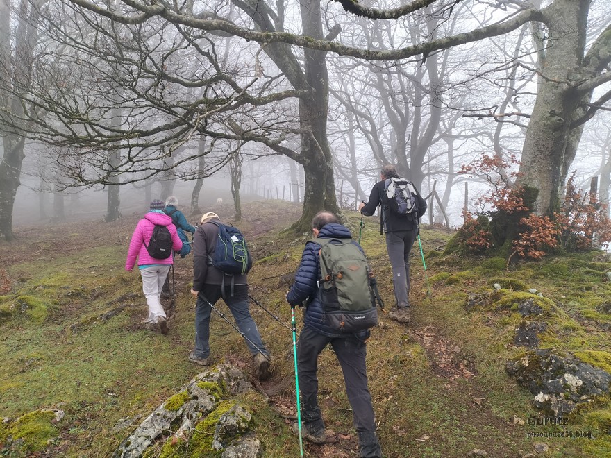 Foto de inicio en Egileor. Como se nota que está la jefa, hasta Alai posa.Nos vamos hacia Alangua por carretera.Ya estamos cerca de Alangua.y tras cruzar Alangua cogemos una pista con buen firme que empieza a ascender.Al principio la pista tenía buen firme.Pero poco a poco el barro ha ido apareciendo……y dificultando la marcha Por ahí arriba andaremos después.Seguimos ascendiendo por una pradera; vemos que hacia donde vamos hay niebla.y entramos en una pista muy embarrada que atraviesa un bosque de hayas. Gracias por esperarme, Alai.Reyes y Fernando luchando con la cuesta y el barro. Las botas y los bastones se nos llenaban de un barro pegajoso que hacía que pesasen mucho más. Los pantalones también han acabado llenos de barro, ¡una guarrada!Por momentos la pendiente es fuerteTenemos que sortear algún árbol caído en medio del camino.Las hayas están cubiertas de musgoGran haya con grandes las raíces cubiertas de musgo.Vamos para arriba y ya vemos que cada vez hay más niebla. Javier con cara de estar disfrutando.Poco a poco, por una fuerte pendiente, nos vamos introduciendo en la niebla.continuamos ascendiendo por un sendero bien marcado; menos mal que ya no hay barro.Hayas, niebla, musgo, buena compañía. ¡Qué bonito es todo esto!Hayedo entre la niebla.Cada vez hay más niebla.Aquí viene Mikel, sufriendo.Foto de cima en Arrigorrista.Placa en Arrigorrista.Buzón de Arrigorrista.¡Vaya tres! (Foto Fernando)El bosque de hayas entre la niebla.Este se lo está pasando bomba (Foto Juanjo)Seguimos avanzando entre la niebla por un sendero cómodo. Atravesando el bosque de hayas.Y de repente salimos de la niebla y se abre ante nosotros el paisaje de la LLanada Alavesa.Vemos Agurain.y Aratz.Esto es lo que nos queda por delante.Un vistazo hacia atrás y vemos lo que ya hemos recorrido, todavía con algún jirón de niebla enganchada en las hayas.Panoramica de la zona.Una mirada hacia el otro lado y vemos los montes de Iturrieta y la población de Erroitegi; a la derecha de la foto aparece Erroeta.Vista de Agurain des de la cima de Larredez.Grandes vistas desde la Peña del Cura.Impresionantes cortadosCaminamos al borde del precipicio.¡Cuidadín, cuidadín!Arriesgando en el borde del precipicio; Alai es el más prudenteFoto de grupo junto a la estela de San Juan, punto desde donde iniciaremos el descenso.Haya agarrada a la roca.Otro obstáculo en el camino; se oía el chirriar de las bisagras de Fernando al agacharse para pasar por debajo.A koldo no le chirriaban; claro, es que es mucho más joven.Bajada entretenida entre la hojarasca. Luego hay un tramo con barro …y finalmente una pista de tierra, sin barro.Ya estamos cerca de Egileor.Aprovechamos para hacer una foto del grupo reducido; faltan los exploradores, atajadores. (Foto Fernando)