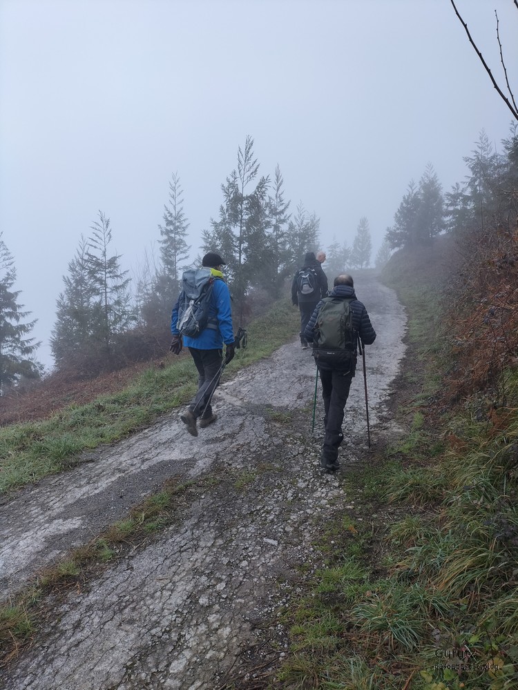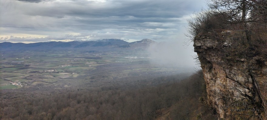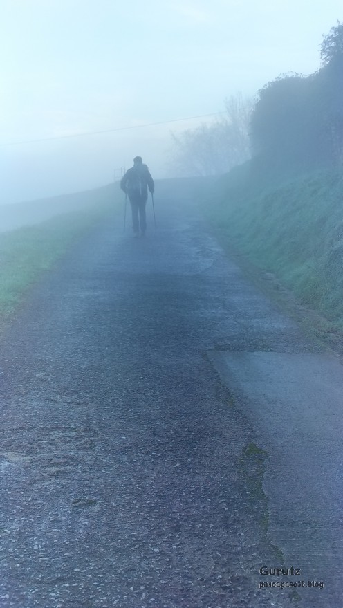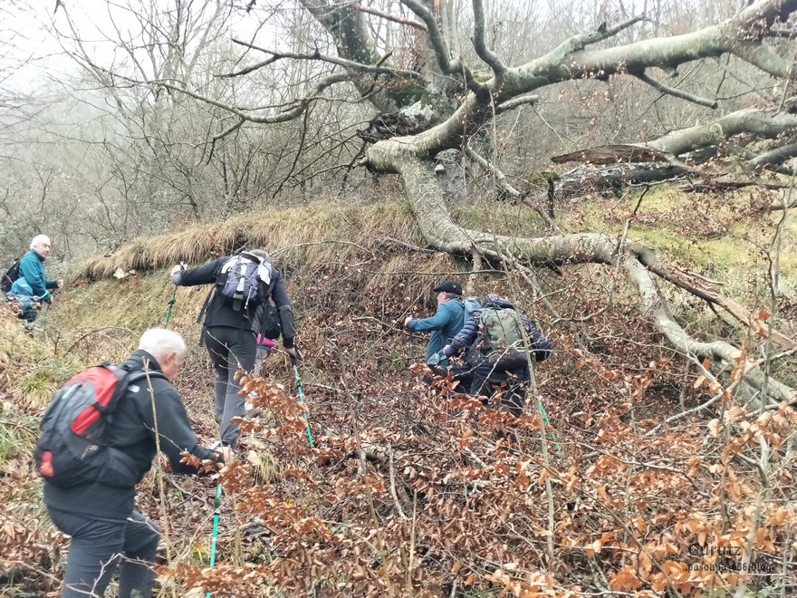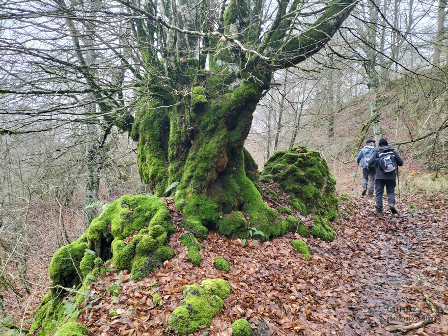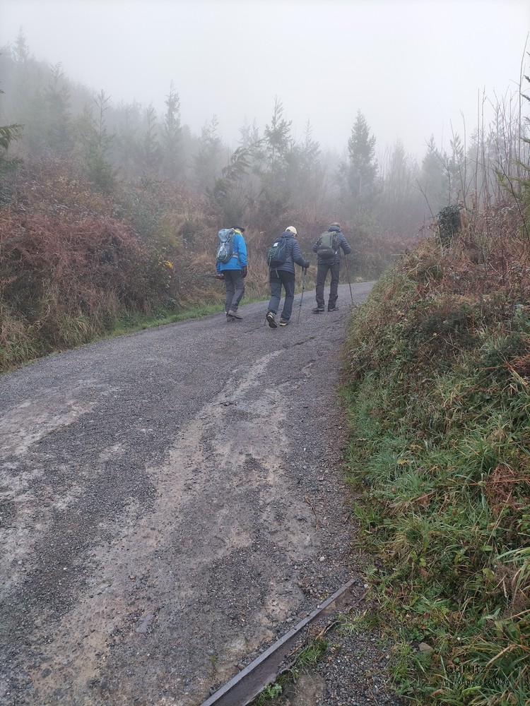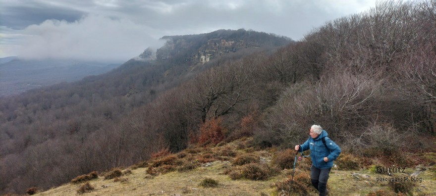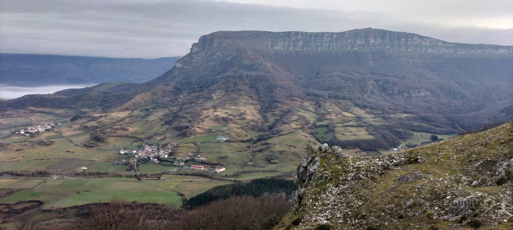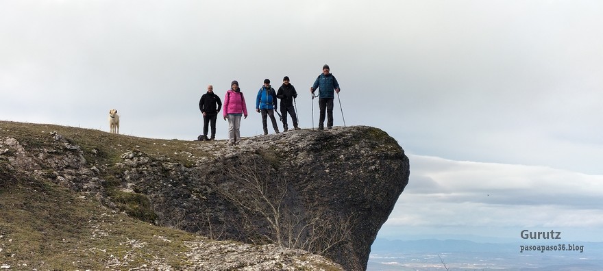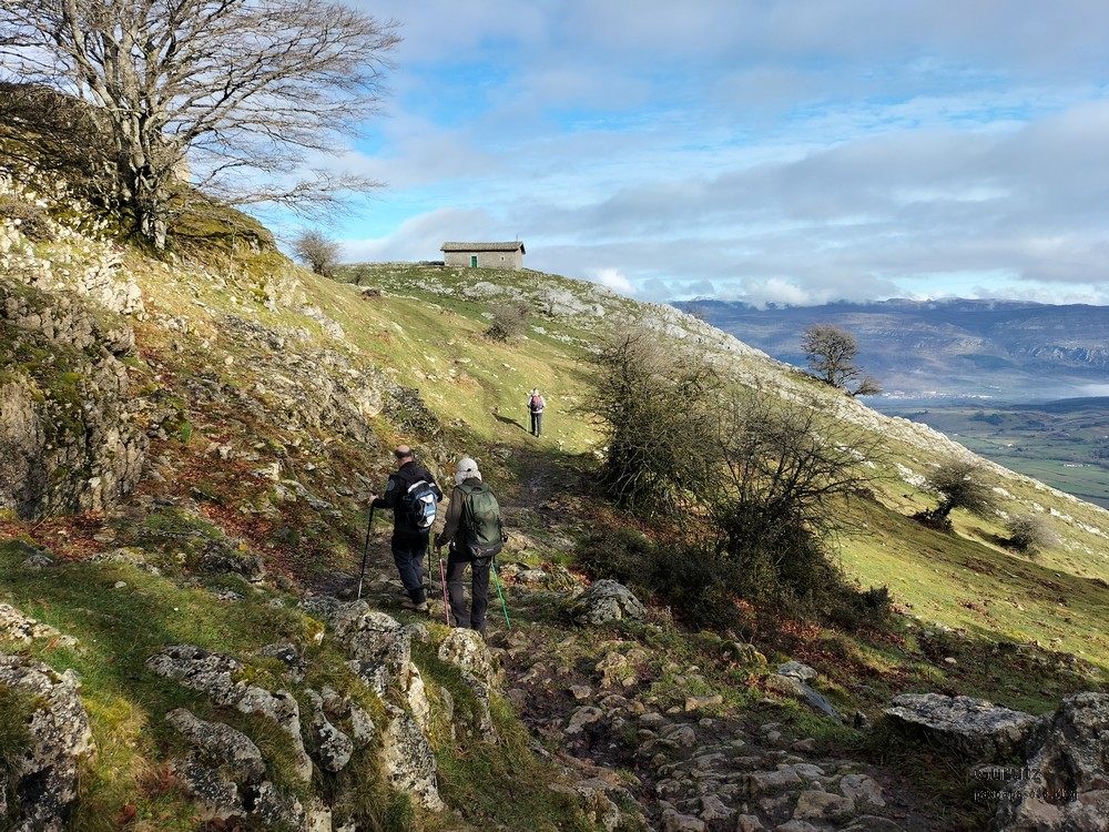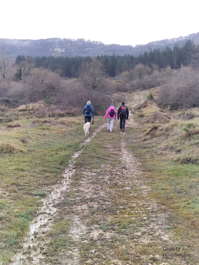 Foto de inicio en Egileor. Como se nota que está la jefa, hasta Alai posa.Nos vamos hacia Alangua por carretera.Ya estamos cerca de Alangua.y tras cruzar Alangua cogemos una pista con buen firme que empieza a ascender.Al principio la pista tenía buen firme.Pero poco a poco el barro ha ido apareciendo……y dificultando la marcha Por ahí arriba andaremos después.Seguimos ascendiendo por una pradera; vemos que hacia donde vamos hay niebla.y entramos en una pista muy embarrada que atraviesa un bosque de hayas. Gracias por esperarme, Alai.Reyes y Fernando luchando con la cuesta y el barro. Las botas y los bastones se nos llenaban de un barro pegajoso que hacía que pesasen mucho más. Los pantalones también han acabado llenos de barro, ¡una guarrada!Por momentos la pendiente es fuerteTenemos que sortear algún árbol caído en medio del camino.Las hayas están cubiertas de musgoGran haya con grandes las raíces cubiertas de musgo.Vamos para arriba y ya vemos que cada vez hay más niebla. Javier con cara de estar disfrutando.Poco a poco, por una fuerte pendiente, nos vamos introduciendo en la niebla.continuamos ascendiendo por un sendero bien marcado; menos mal que ya no hay barro.Hayas, niebla, musgo, buena compañía. ¡Qué bonito es todo esto!Hayedo entre la niebla.Cada vez hay más niebla.Aquí viene Mikel, sufriendo.Foto de cima en Arrigorrista.Placa en Arrigorrista.Buzón de Arrigorrista.¡Vaya tres! (Foto Fernando)El bosque de hayas entre la niebla.Este se lo está pasando bomba (Foto Juanjo)Seguimos avanzando entre la niebla por un sendero cómodo. Atravesando el bosque de hayas.Y de repente salimos de la niebla y se abre ante nosotros el paisaje de la LLanada Alavesa.Vemos Agurain.y Aratz.Esto es lo que nos queda por delante.Un vistazo hacia atrás y vemos lo que ya hemos recorrido, todavía con algún jirón de niebla enganchada en las hayas.Panoramica de la zona.Una mirada hacia el otro lado y vemos los montes de Iturrieta y la población de Erroitegi; a la derecha de la foto aparece Erroeta.Vista de Agurain des de la cima de Larredez.Grandes vistas desde la Peña del Cura.Impresionantes cortadosCaminamos al borde del precipicio.¡Cuidadín, cuidadín!Arriesgando en el borde del precipicio; Alai es el más prudenteFoto de grupo junto a la estela de San Juan, punto desde donde iniciaremos el descenso.Haya agarrada a la roca.Otro obstáculo en el camino; se oía el chirriar de las bisagras de Fernando al agacharse para pasar por debajo.A koldo no le chirriaban; claro, es que es mucho más joven.Bajada entretenida entre la hojarasca. Luego hay un tramo con barro …y finalmente una pista de tierra, sin barro.Ya estamos cerca de Egileor.Aprovechamos para hacer una foto del grupo reducido; faltan los exploradores, atajadores. (Foto Fernando)
