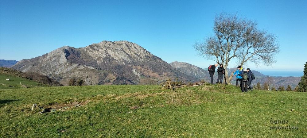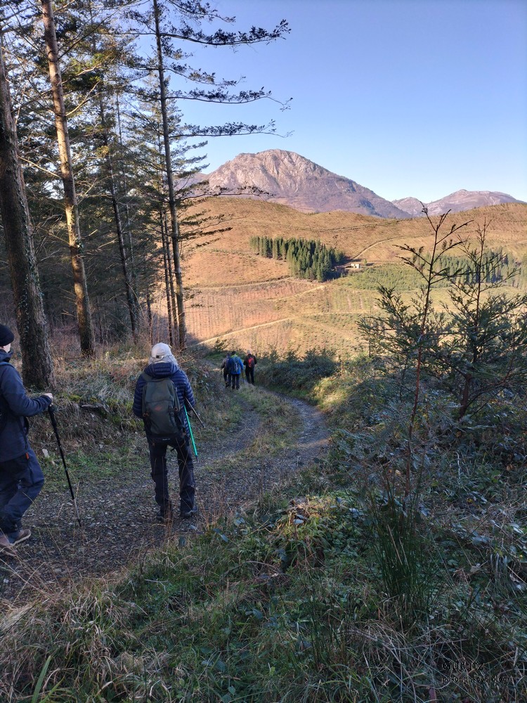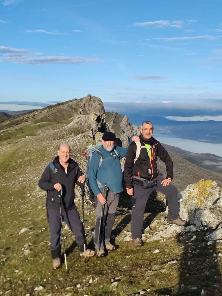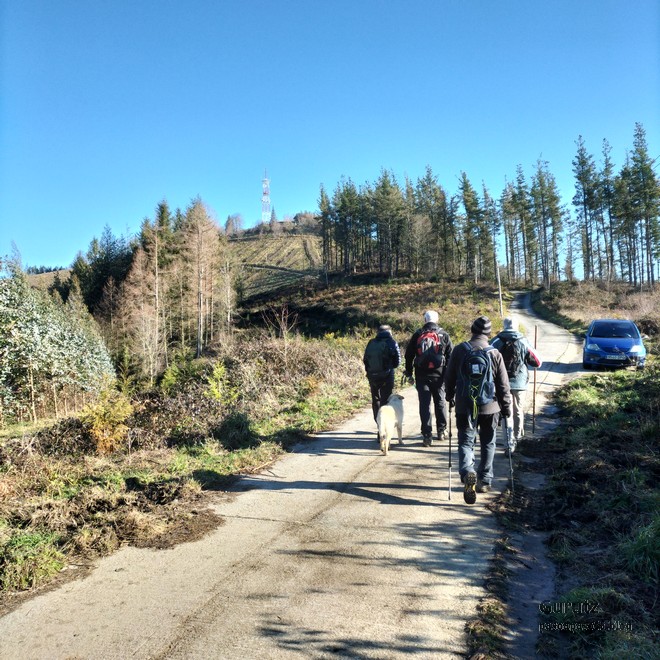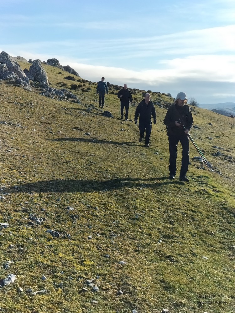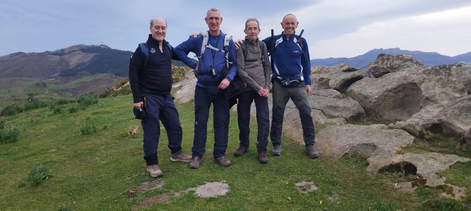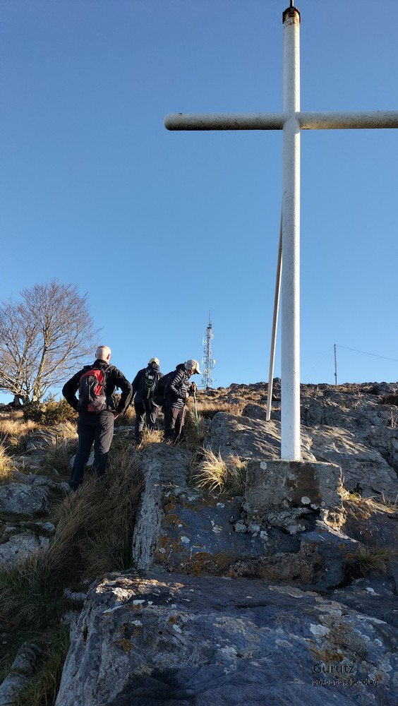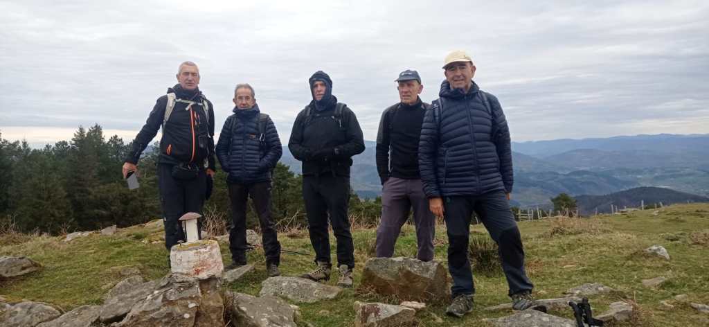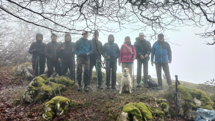 Hoy nos hemos juntados diez personas y un perro para hacer esta circular; todo un récord. Salimos desde Egileor Reyes, Josean, y el perro de estos dos primeros, Alai, Fernando, Koldo, Mikel, Javier, Fede, Felipe, Juanjo y Juan Cruz. Hemos ascendido a las cimas de Arrigorrista (1150m), Peña Alangua (1091m), Atxuri (1092m), Larredez (1104m), Peña Redonda (1070m) y Peña del Cura (1065m). Es un recorrido de 14,2 km, con un desnivel positivo acumulado de 618 m. en el que hemos empleado 5:17 horas. La mayor parte del desnivel está al principio, luego es un sube-baja suave. Al inicio de la caminata ha hecho frio, a medida que hemos ascendido, más frio, niebla y viento que nos ha provocado una sensación de térmica de mucho frio, hasta que hemos salido de la niebla y el sol ha comenzado a calentar algo, aunque ha seguido haciendo frio.