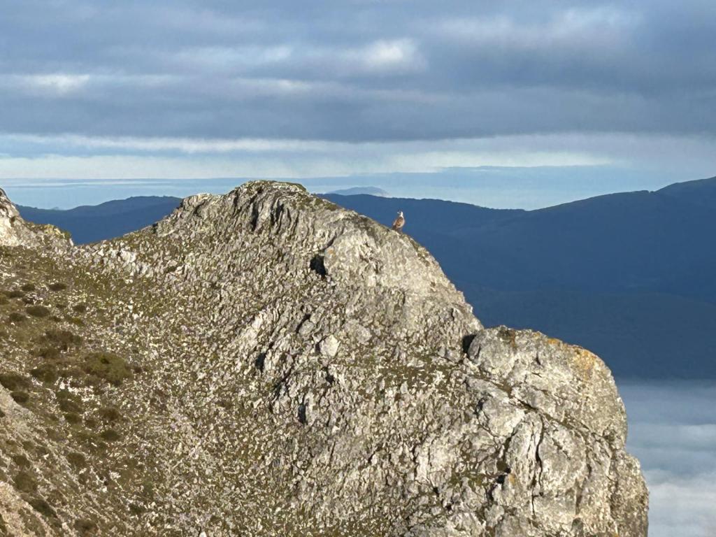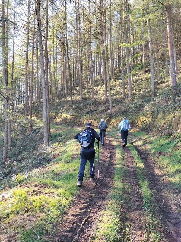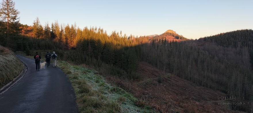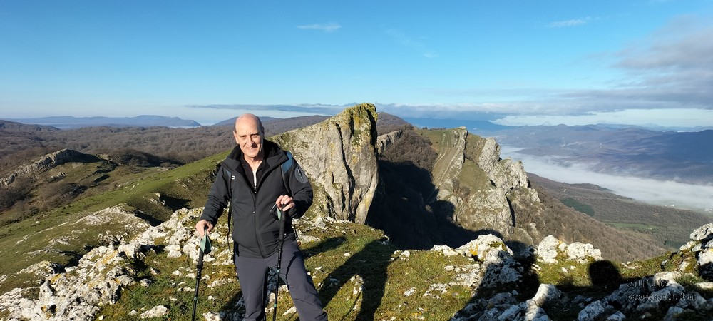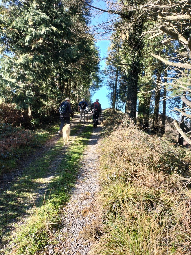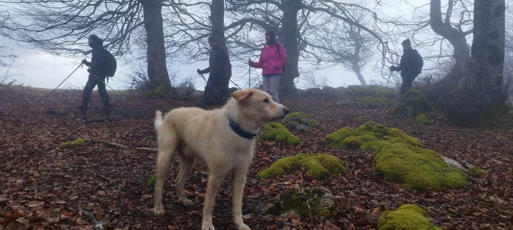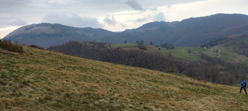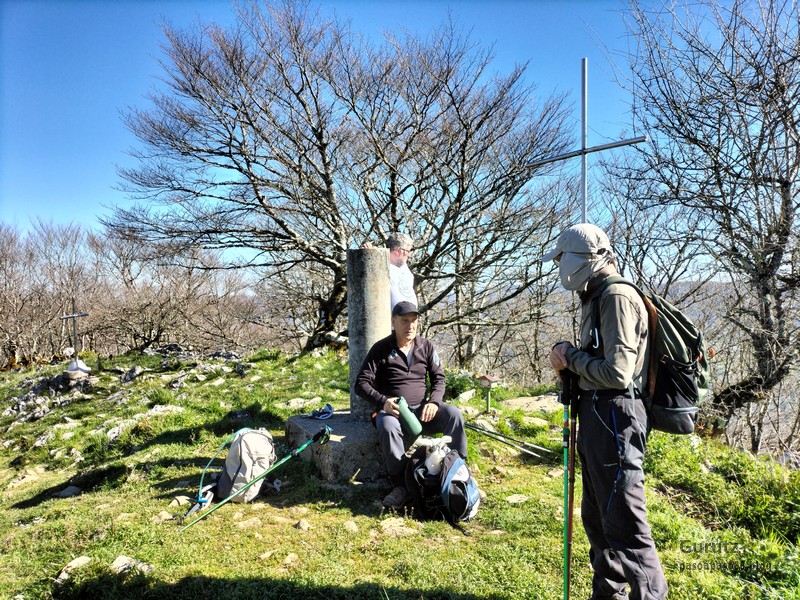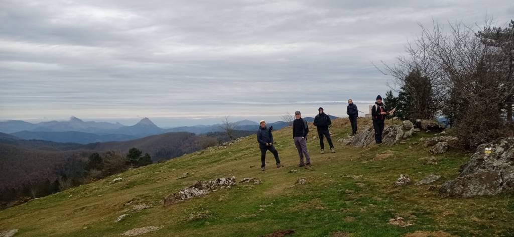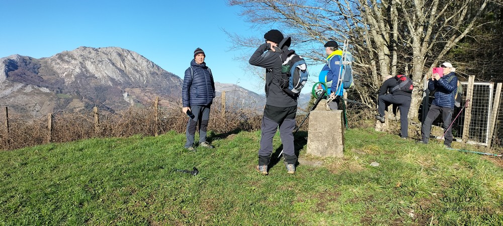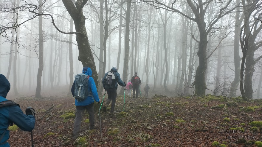 Hoy nos hemos juntados diez personas y un perro para hacer esta circular; todo un récord. Salimos desde Egileor Reyes, Josean, y el perro de estos dos primeros, Alai, Fernando, Koldo, Mikel, Javier, Fede, Felipe, Juanjo y Juan Cruz. Hemos ascendido a las cimas de Arrigorrista (1150m), Peña Alangua (1091m), Atxuri (1092m), Larredez (1104m), Peña Redonda (1070m) y Peña del Cura (1065m). Es un recorrido de 14,2 km, con un desnivel positivo acumulado de 618 m. en el que hemos empleado 5:17 horas. La mayor parte del desnivel está al principio, luego es un sube-baja suave. Al inicio de la caminata ha hecho frio, a medida que hemos ascendido, más frio, niebla y viento que nos ha provocado una sensación de térmica de mucho frio, hasta que hemos salido de la niebla y el sol ha comenzado a calentar algo, aunque ha seguido haciendo frio.