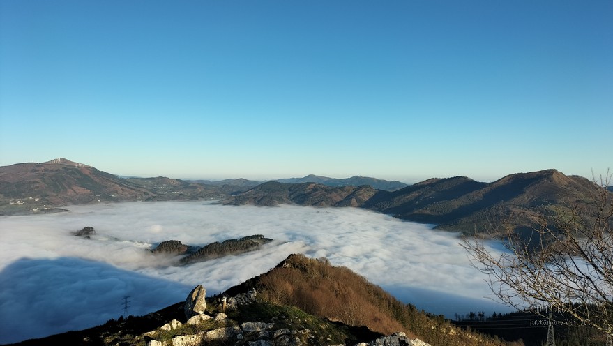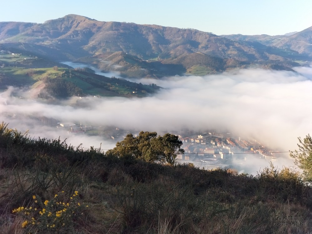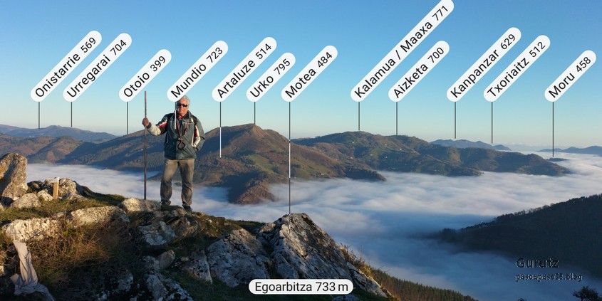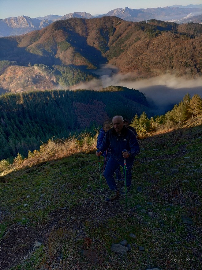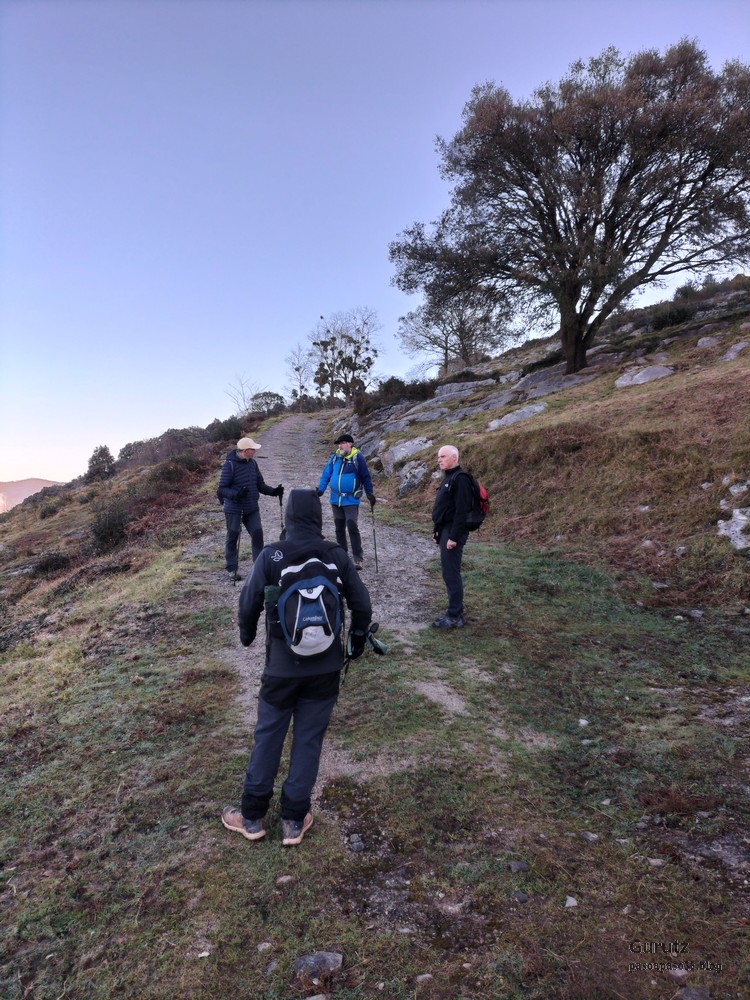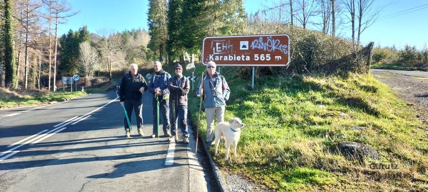 Nos juntamos seis expedicionarios, Koldo, Javier, Josean, Fede, yo y, nuestra fiel mascota, Alai, para hacer esta circular que, partiendo del alto de Karabieta (Entre Éibar y Ermua) , asciende a las cimas de Egoarbitza (720m), Azkonabieta (724m) y Galdaramuño (664m). Tiene 13,6 km de longitud, con un desnivel positivo acumulado de 679 m, en el que hemos empleado 5:16 horas. La meteorología que hemos disfrutado ha sido excepcional, soleada y con un cielo completamente despejado en las alturas, lo que contrasta con las nubes bajas que cubren por completo las poblaciones de los valles. Frio, mucho frio; hemos comenzado a andar a las 8:48 horas con una temperatura de 0º C., y acabado a las 14:05 con 10ºC. A lo largo de todo el recorrido y, a pesar de la modesta altura de las cimas que hemos subido, las vistas hacia los cuatro puntos cardinales han sido extraordinarias; espero que se puedan apreciar en las fotos.