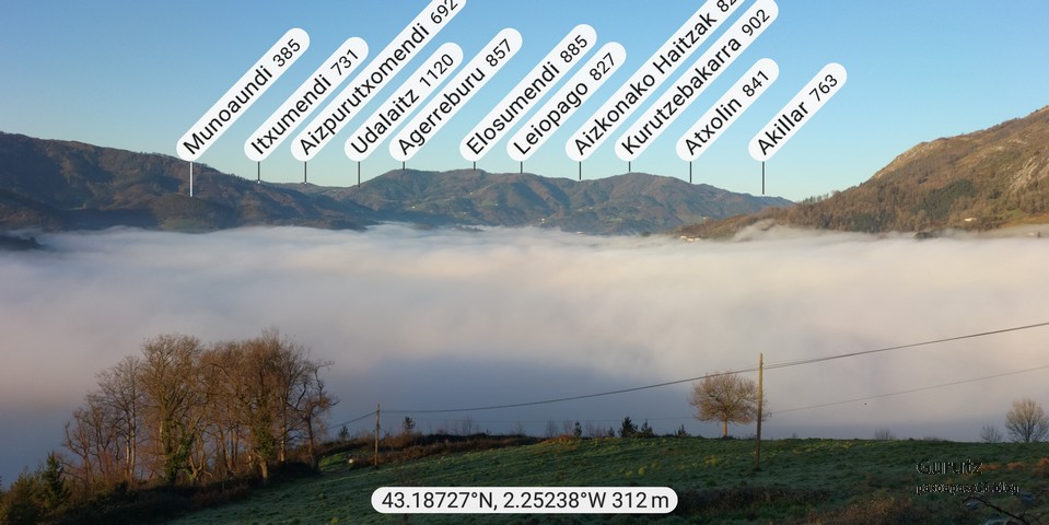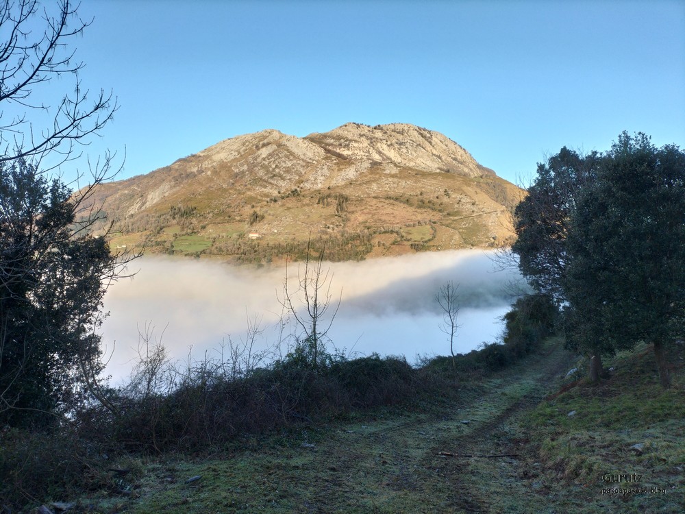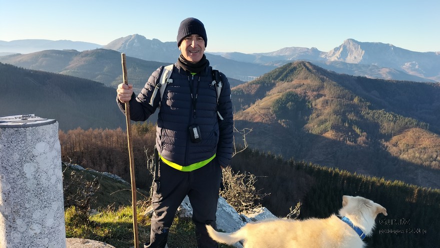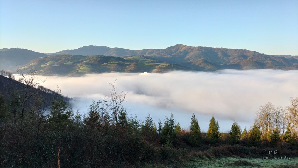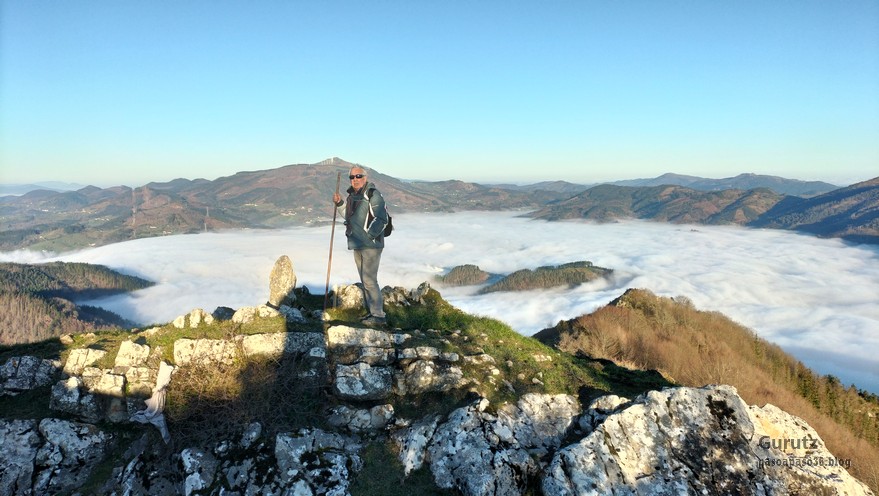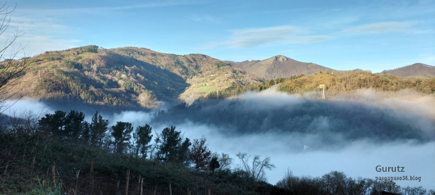 Nos juntamos seis expedicionarios, Koldo, Javier, Josean, Fede, yo y, nuestra fiel mascota, Alai, para hacer esta circular que, partiendo del alto de Karabieta (Entre Éibar y Ermua) , asciende a las cimas de Egoarbitza (720m), Azkonabieta (724m) y Galdaramuño (664m). Tiene 13,6 km de longitud, con un desnivel positivo acumulado de 679 m, en el que hemos empleado 5:16 horas. La meteorología que hemos disfrutado ha sido excepcional, soleada y con un cielo completamente despejado en las alturas, lo que contrasta con las nubes bajas que cubren por completo las poblaciones de los valles. Frio, mucho frio; hemos comenzado a andar a las 8:48 horas con una temperatura de 0º C., y acabado a las 14:05 con 10ºC. A lo largo de todo el recorrido y, a pesar de la modesta altura de las cimas que hemos subido, las vistas hacia los cuatro puntos cardinales han sido extraordinarias; espero que se puedan apreciar en las fotos.