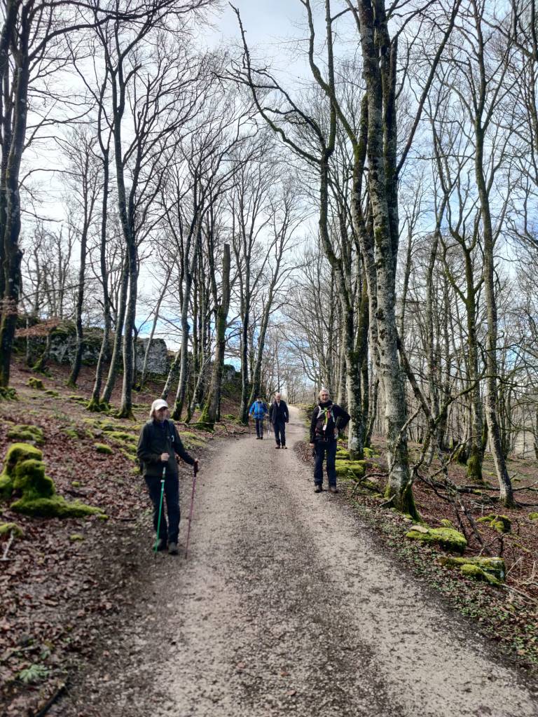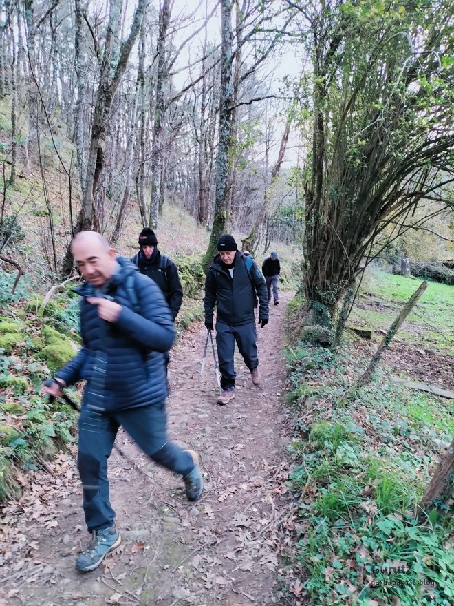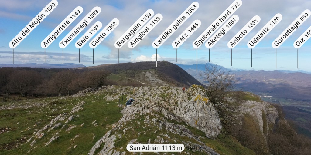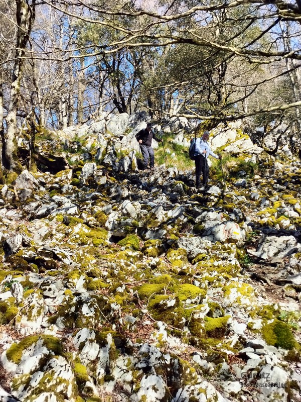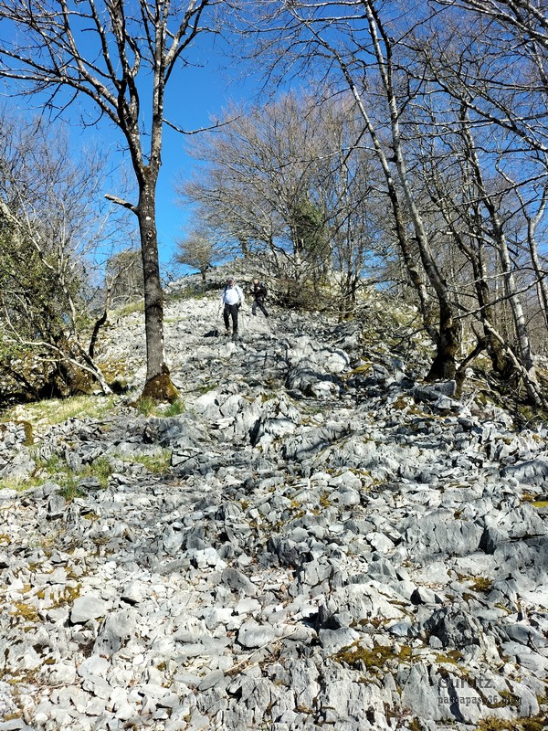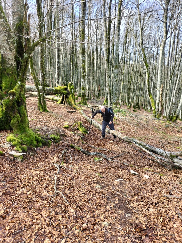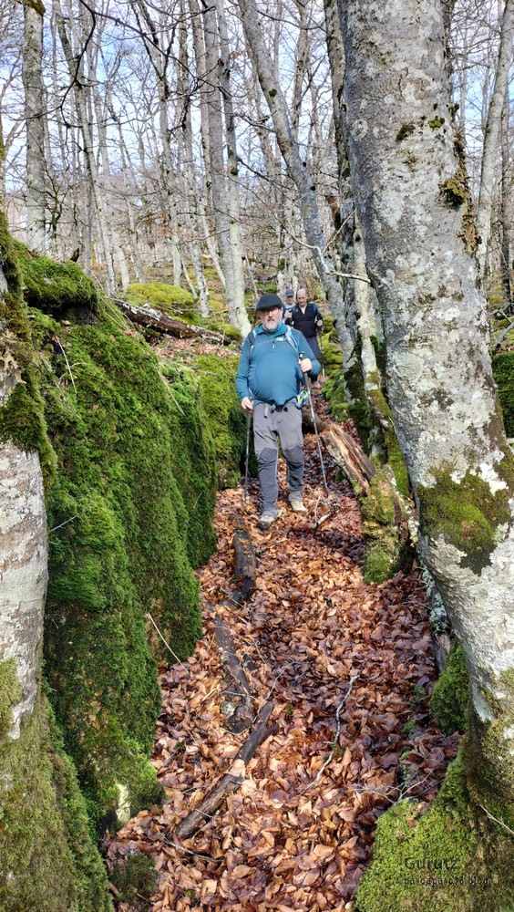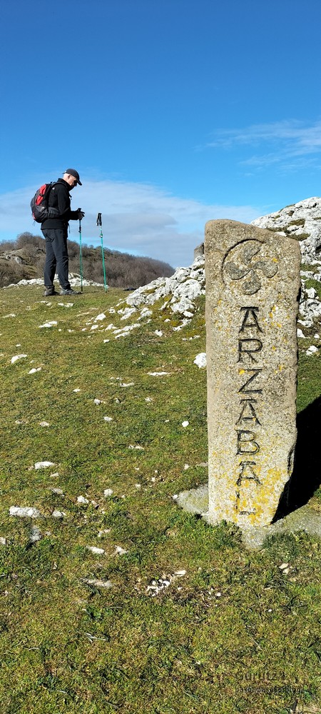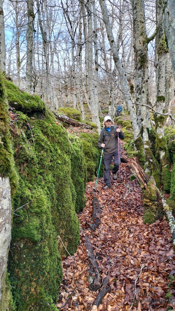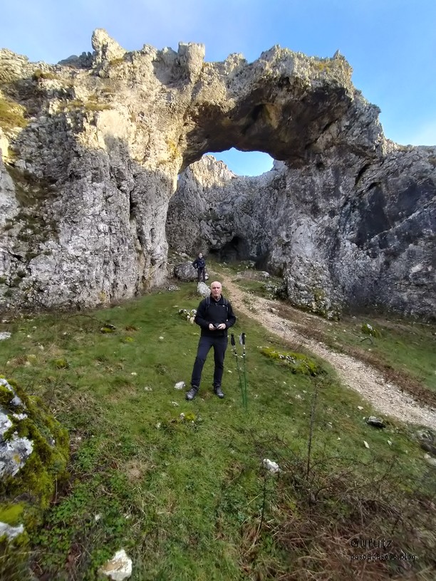 En este vídeo se puede apreciar la espectacularidad del paisaje de la Sakana (Vídeo Fede)Y llegamos al arco de Portupekoleze; sólo dos valientes nos atrevimos a cruzar por encima; si lleva 1.000 millones de años ahí, no se va a caer precisamente hoy.Parece que aguanta nuestro peso.Se estaba bien ahí arriba (Foto Mikel)Vista desde un lado.Vista desde el otro lado.Fede y Javier debajo del arco.Otra foto desde abajo.y otra, no me canso (Foto Fede)Javier fotografiando a un pajarito que nos estuvo vigilando durante parte de nuestra ruta.Hacía allí vamos, al fondo se ve la ermita de San Adrián, dentro de un rato estaremos allá.Parte del grupo posando (Foto Fede)Otra vez el pajarito (Foto Mikel)Otra mirada hacia Beriain-San DonatoSeguimos adelante caminando a veces por una mullida hierba y otras sorteando algunas rocas, sin problemas.Fernando con cara de estar disfrutando.El resto del grupo (Foto Fernando)Posado de Fede.Bajando a la brecha de Arrangarte, por donde se puede bajar, o subir, desde Lizarraga.Fede y Juan Cruz en la brecha, detrás Etxarri-Aranaz. (Foto Mikel)ya estamos llegando a San Adrián.Cazador cazado sacando la foto anterior (Foto Mikel)Ermita del santo y refugio.Puerta de entrada al recinto.cartel de bienvenida a la entrada; el recinto está dividido en dos estancias, una de ermita con la imagen del santo, y otra de refugio con una gran chimenea.Altar con la imagen del santo.Gran chimenea del refugio (Foto Mikel)Mirada hacia atrás desde San Adrián. Por esas crestas hemos andado.Con sus nombresVista hacia Berian y parte de Aralar desde San Adrián.Vista hacia Aralar.Vistas hacia Urbasa, Aizkorri y Anboto y Udalaitz.Buzón en la cima de San Adrián.Ara de San Adrián. Nos imaginamos que en este lugar antiguamente harían ofrendas a la divinidad.Fernando a punto de ser sacrificado; se libró porque llevábamos las navajas desafiladas (Foto Mikel)Vista del Ara desde otra perspectiva.Desde San Adrián comenzamos un descenso por un camino que discurre entre un bosque de hayasCamino cómodo y muy bonito, con el musgo de las rocas que parece fluorescente.El grupo disfrutando del camino (Foto Fede)Mirada hacia atrás; de allí venimos.LLegamos a Arzabal también conocido como Iruelorrieta.Disfrutando de las vistas (Foto Mikel)Seguimos ruta, todavía nos queda más de la mitad del recorrido. Al fondo Aizkorri (Foto Mikel)La Cueva de LezehaundiEs la mayor cueva de la sierra de Urbasa-Andia y su origen parece ser el hundimiento de una gran dolina, dejando una cornisa semicircular de piedra cubriendo una depresión circular. Más información en https://es.wikipedia.org/wiki/Cueva_de_Lezaundi#HistoriaEn sus alrededores la primavera adelantada se estaba abriendo paso. En la foto se ven unos narcisos.Vista frontal de la cueva.Otra vista. No bajamos porque ya íbamos justos de tiempo. Después de la cueva nos metimos en un laberinto de lapiaz cubierto de musgo (Foto Fede)Con estrechos pasillos entre las rocas.Había que andar con cuidado mirando donde se pisaba.las paredes estaban cubiertas de musgo.Todo ello entre un bosque de hayas jóvenes.Fernando salvando el obstáculo con un elegante estilo fosbury.Otra vez encontramos una ancha y cómoda pistaLlegamos a la calzada romana de Zunbeltz. No hay estudios acerca de su origen romano. Se sabe que fue una ruta de pastoreo que daba continuidad a la Cañada Real procedente de Tauste ( Zaragoza ). Tiene una anchura variable de 2,5 metros aunque el tramo más espectacular es el deZaldibe que es el que se ve en las fotos.El grupo pasando por la calzada.Desde otra perspectiva.y Llegamos a un valle; alguno se las prometía felices pensando que ya se habían acabado las subidas; ja, todavía nos quedaba subir a las crestas de Ollideko Bizkarra y a la Peña Arrangarte, las cuales se ven en la foto Una vez en la cresta se ve un amplio valle rodeado de montañas.Desque aquí también se ve el Arco de Portupekoleze y Beriain.Caminamos cómodamente por praderaYa estamos llegando al final de la ruta; la foto no está hecha con un dron, está hecha por otro tipo de pájaro (Foto Mikel)En la parte superior de la cantera se veía a los buitres abriendo las alas. Punto final, nos cambiamos y a comer en la benta.