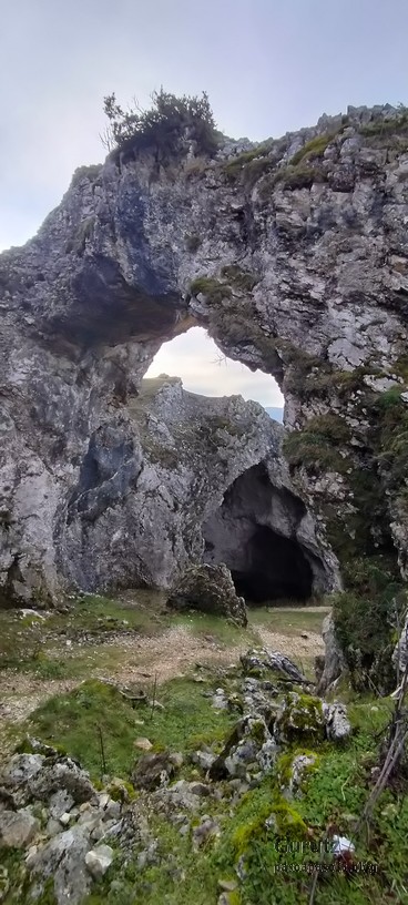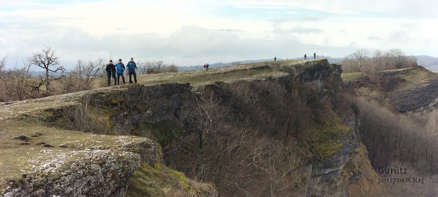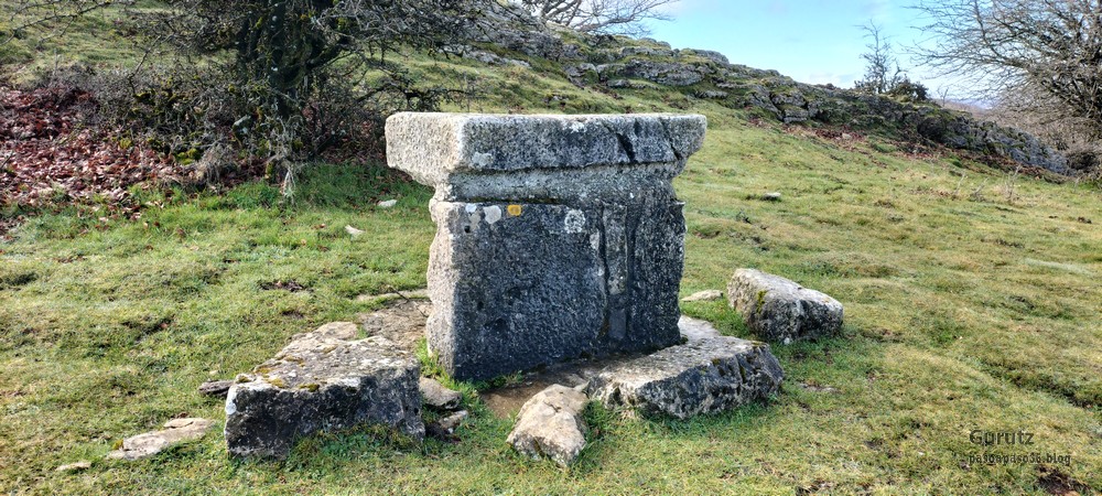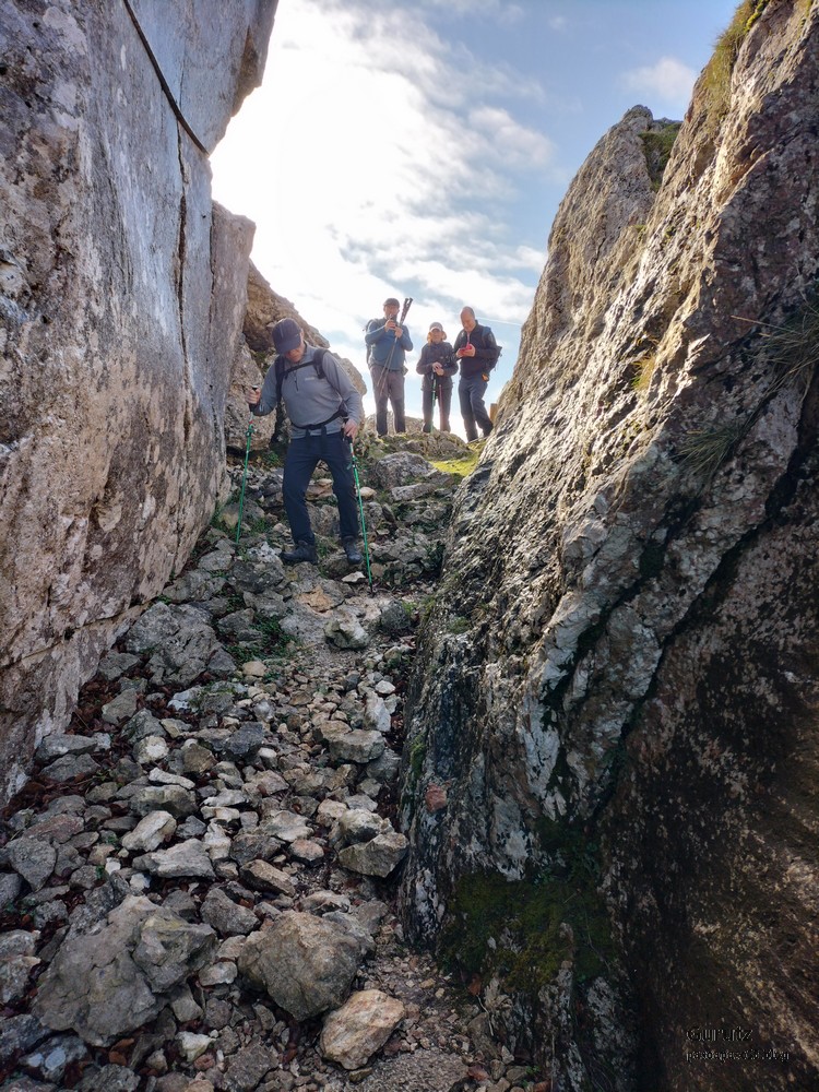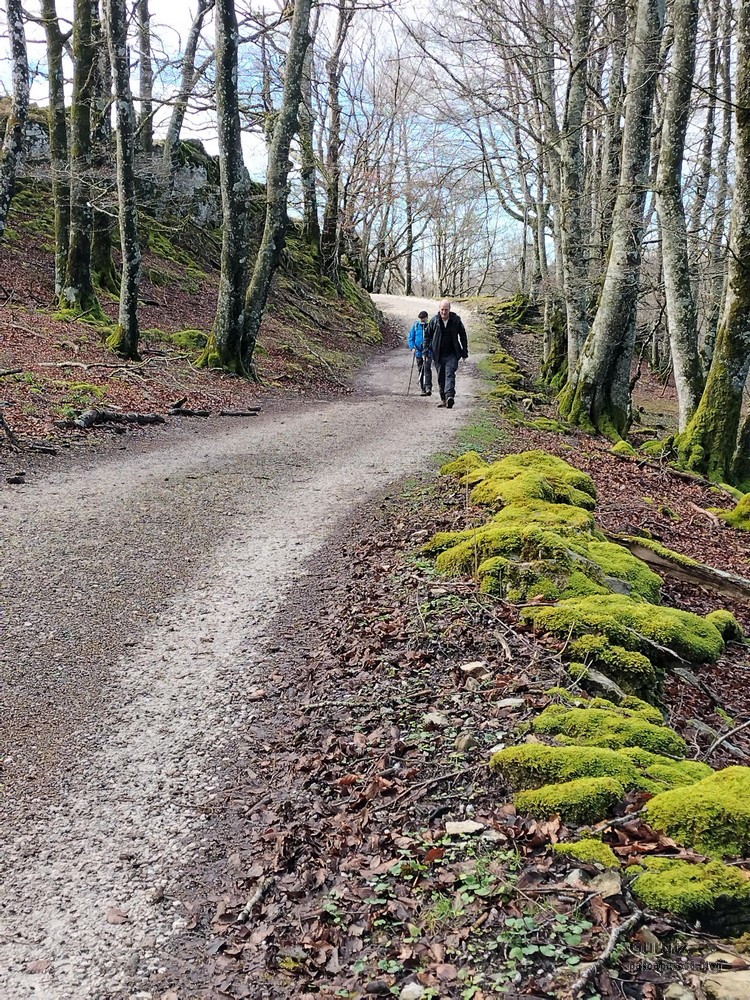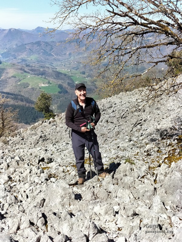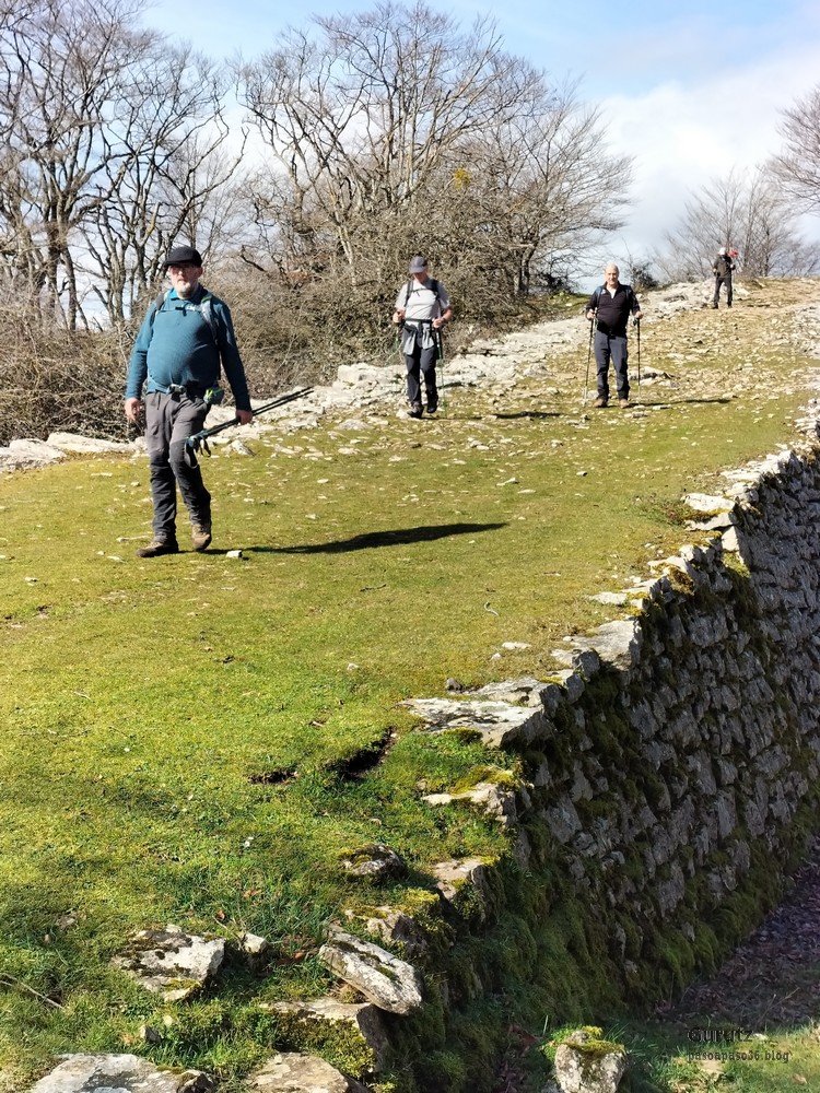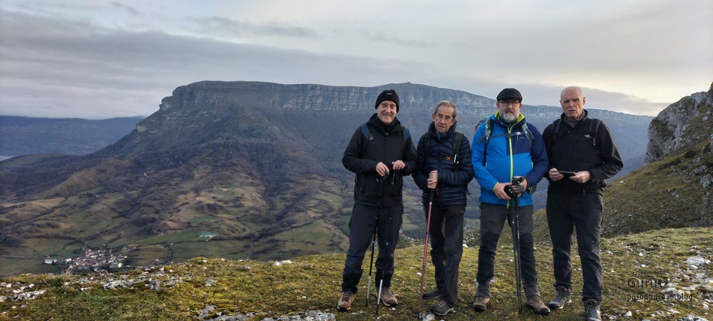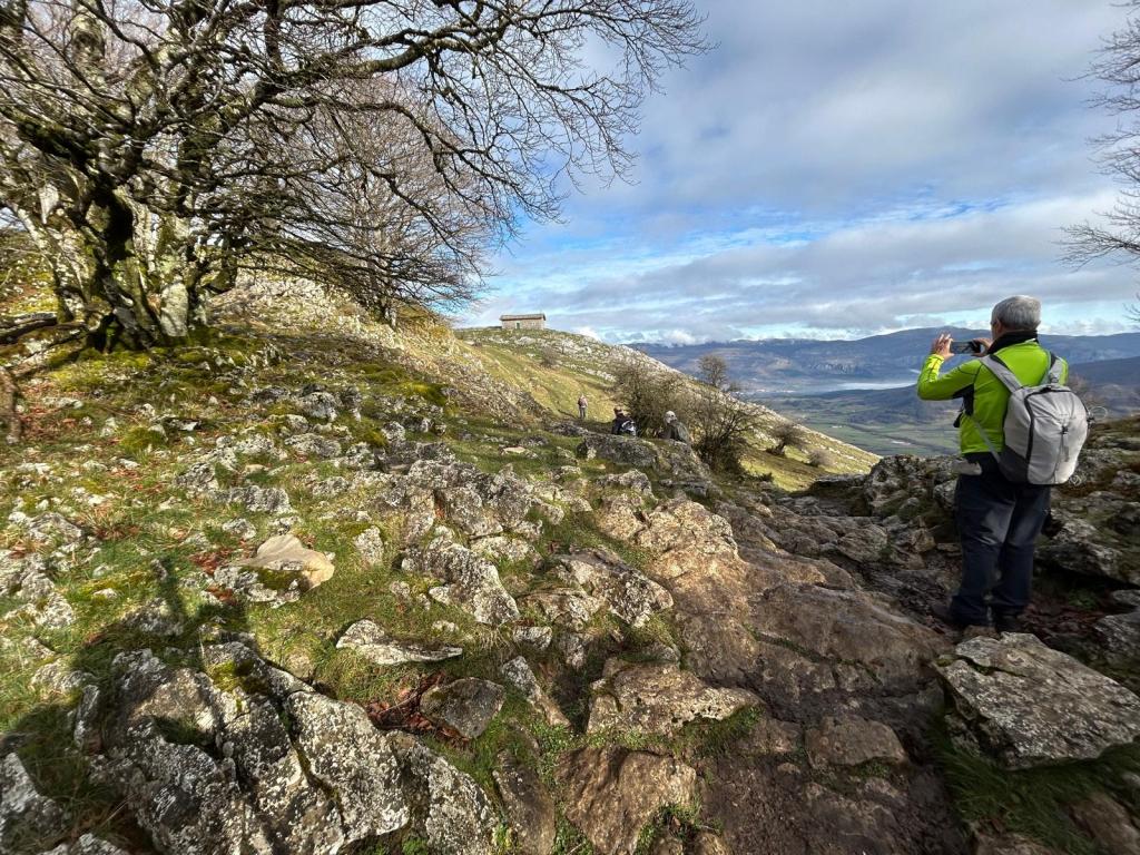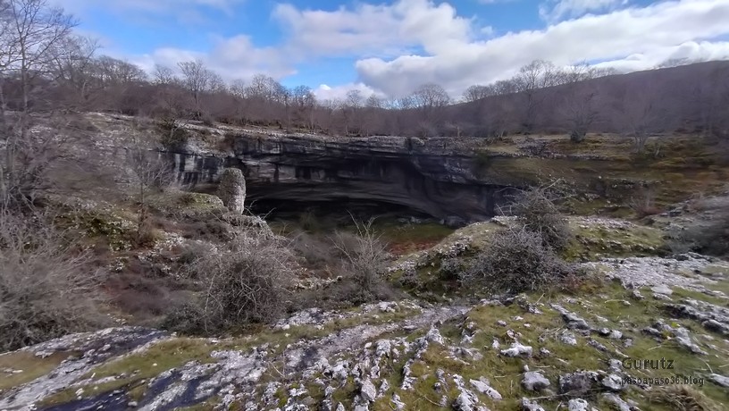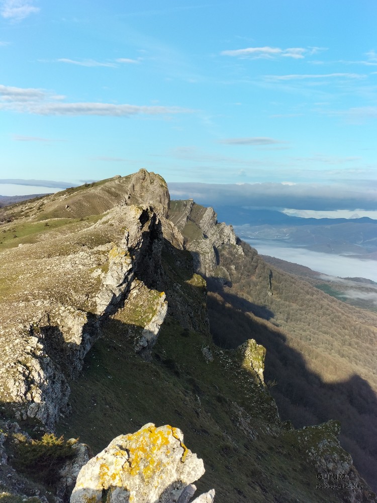 En este vídeo se puede apreciar la espectacularidad del paisaje de la Sakana (Vídeo Fede)Y llegamos al arco de Portupekoleze; sólo dos valientes nos atrevimos a cruzar por encima; si lleva 1.000 millones de años ahí, no se va a caer precisamente hoy.Parece que aguanta nuestro peso.Se estaba bien ahí arriba (Foto Mikel)Vista desde un lado.Vista desde el otro lado.Fede y Javier debajo del arco.Otra foto desde abajo.y otra, no me canso (Foto Fede)Javier fotografiando a un pajarito que nos estuvo vigilando durante parte de nuestra ruta.Hacía allí vamos, al fondo se ve la ermita de San Adrián, dentro de un rato estaremos allá.Parte del grupo posando (Foto Fede)Otra vez el pajarito (Foto Mikel)Otra mirada hacia Beriain-San DonatoSeguimos adelante caminando a veces por una mullida hierba y otras sorteando algunas rocas, sin problemas.Fernando con cara de estar disfrutando.El resto del grupo (Foto Fernando)Posado de Fede.Bajando a la brecha de Arrangarte, por donde se puede bajar, o subir, desde Lizarraga.Fede y Juan Cruz en la brecha, detrás Etxarri-Aranaz. (Foto Mikel)ya estamos llegando a San Adrián.Cazador cazado sacando la foto anterior (Foto Mikel)Ermita del santo y refugio.Puerta de entrada al recinto.cartel de bienvenida a la entrada; el recinto está dividido en dos estancias, una de ermita con la imagen del santo, y otra de refugio con una gran chimenea.Altar con la imagen del santo.Gran chimenea del refugio (Foto Mikel)Mirada hacia atrás desde San Adrián. Por esas crestas hemos andado.Con sus nombresVista hacia Berian y parte de Aralar desde San Adrián.Vista hacia Aralar.Vistas hacia Urbasa, Aizkorri y Anboto y Udalaitz.Buzón en la cima de San Adrián.Ara de San Adrián. Nos imaginamos que en este lugar antiguamente harían ofrendas a la divinidad.Fernando a punto de ser sacrificado; se libró porque llevábamos las navajas desafiladas (Foto Mikel)Vista del Ara desde otra perspectiva.Desde San Adrián comenzamos un descenso por un camino que discurre entre un bosque de hayasCamino cómodo y muy bonito, con el musgo de las rocas que parece fluorescente.El grupo disfrutando del camino (Foto Fede)Mirada hacia atrás; de allí venimos.LLegamos a Arzabal también conocido como Iruelorrieta.Disfrutando de las vistas (Foto Mikel)Seguimos ruta, todavía nos queda más de la mitad del recorrido. Al fondo Aizkorri (Foto Mikel)La Cueva de LezehaundiEs la mayor cueva de la sierra de Urbasa-Andia y su origen parece ser el hundimiento de una gran dolina, dejando una cornisa semicircular de piedra cubriendo una depresión circular. Más información en https://es.wikipedia.org/wiki/Cueva_de_Lezaundi#HistoriaEn sus alrededores la primavera adelantada se estaba abriendo paso. En la foto se ven unos narcisos.Vista frontal de la cueva.Otra vista. No bajamos porque ya íbamos justos de tiempo. Después de la cueva nos metimos en un laberinto de lapiaz cubierto de musgo (Foto Fede)Con estrechos pasillos entre las rocas.Había que andar con cuidado mirando donde se pisaba.las paredes estaban cubiertas de musgo.Todo ello entre un bosque de hayas jóvenes.Fernando salvando el obstáculo con un elegante estilo fosbury.Otra vez encontramos una ancha y cómoda pistaLlegamos a la calzada romana de Zunbeltz. No hay estudios acerca de su origen romano. Se sabe que fue una ruta de pastoreo que daba continuidad a la Cañada Real procedente de Tauste ( Zaragoza ). Tiene una anchura variable de 2,5 metros aunque el tramo más espectacular es el deZaldibe que es el que se ve en las fotos.El grupo pasando por la calzada.Desde otra perspectiva.y Llegamos a un valle; alguno se las prometía felices pensando que ya se habían acabado las subidas; ja, todavía nos quedaba subir a las crestas de Ollideko Bizkarra y a la Peña Arrangarte, las cuales se ven en la foto Una vez en la cresta se ve un amplio valle rodeado de montañas.Desque aquí también se ve el Arco de Portupekoleze y Beriain.Caminamos cómodamente por praderaYa estamos llegando al final de la ruta; la foto no está hecha con un dron, está hecha por otro tipo de pájaro (Foto Mikel)En la parte superior de la cantera se veía a los buitres abriendo las alas. Punto final, nos cambiamos y a comer en la benta.