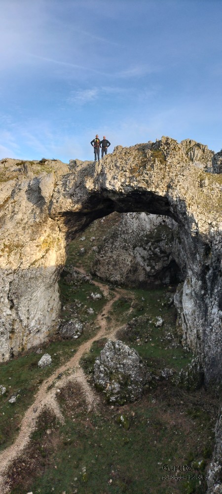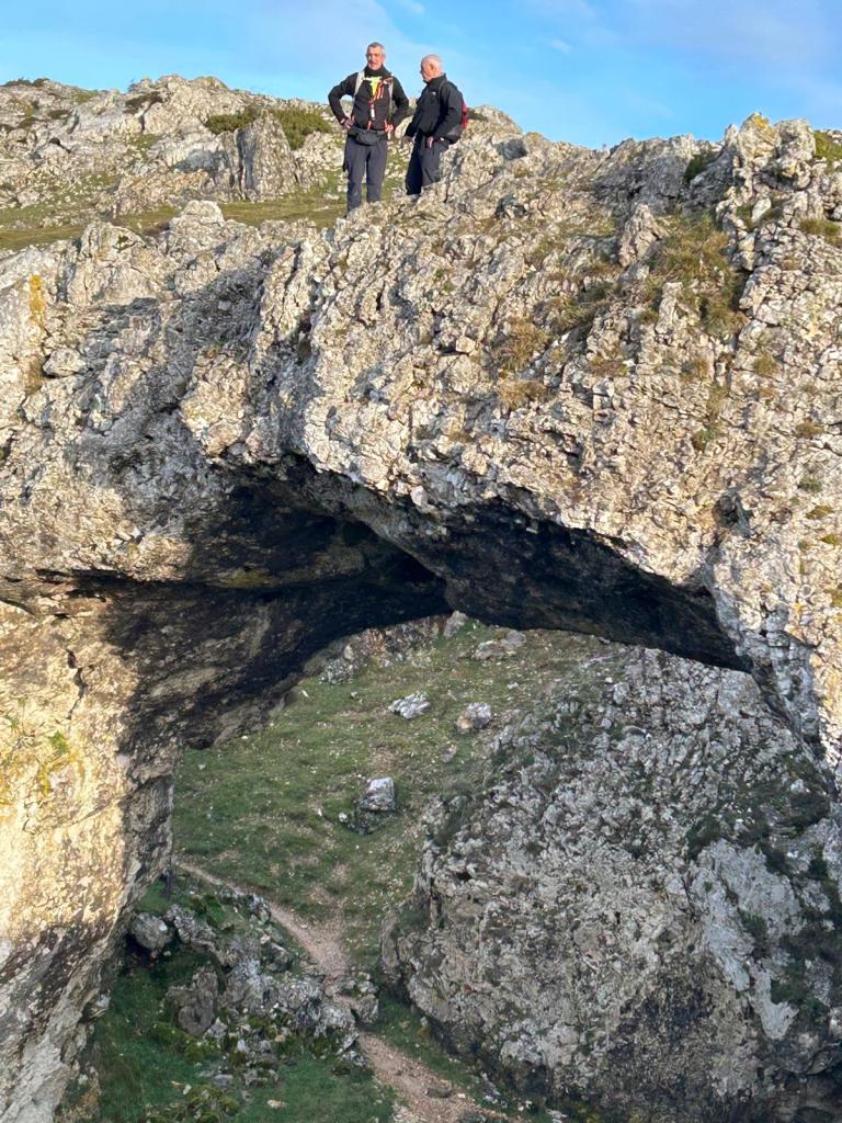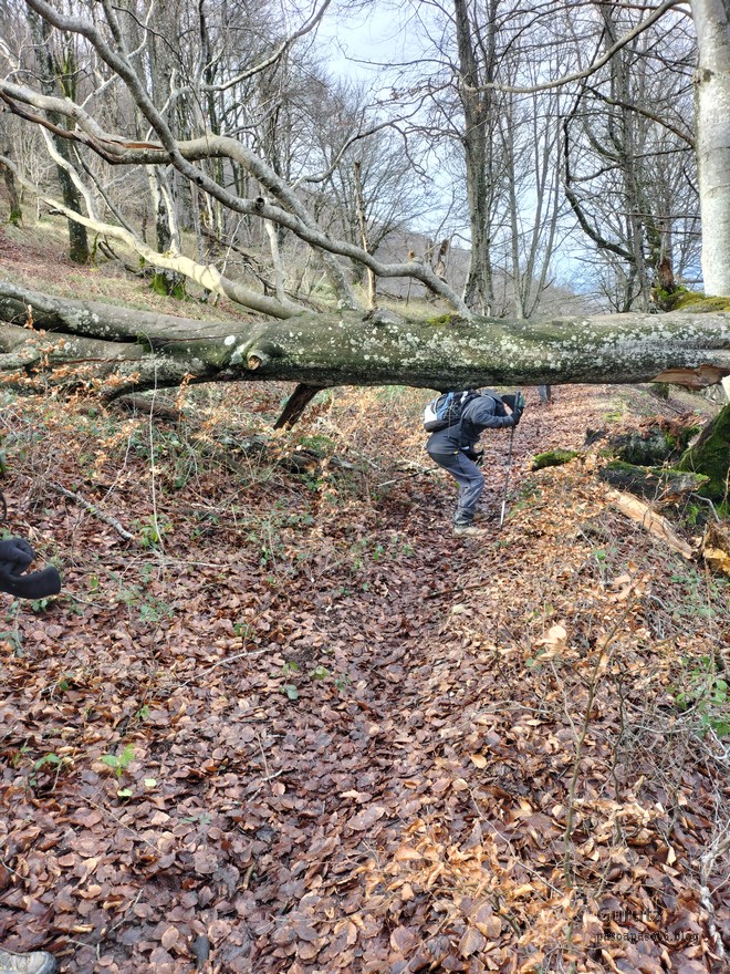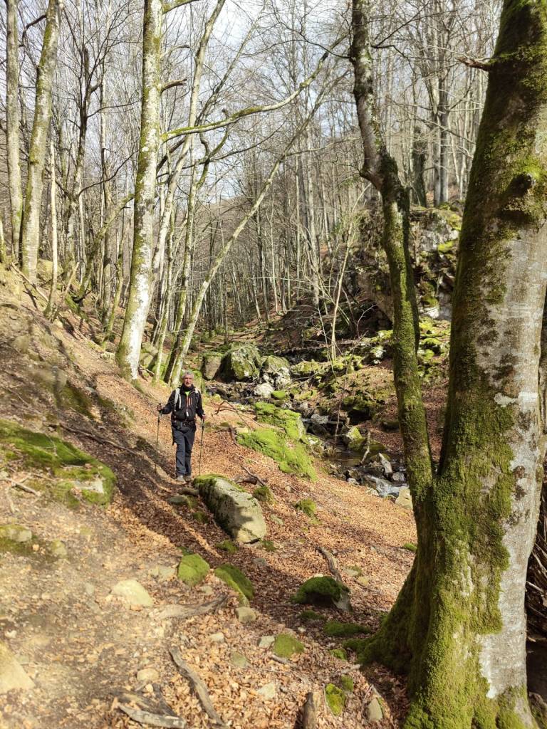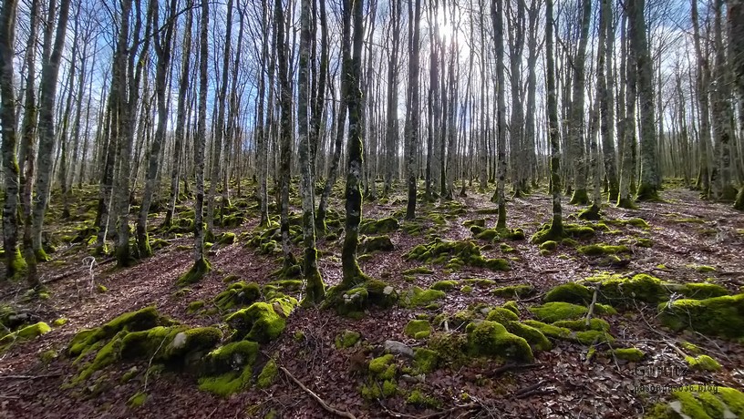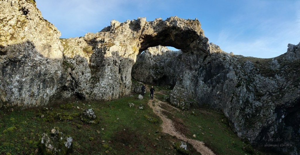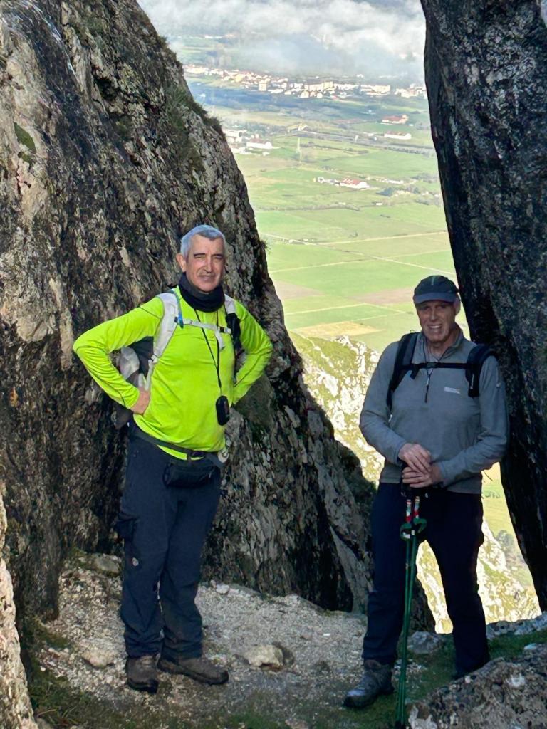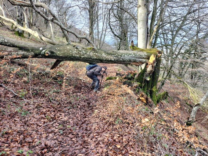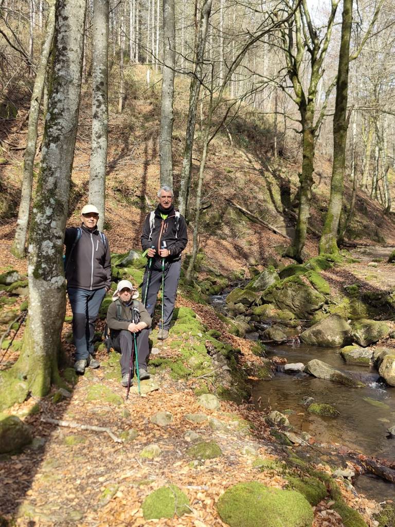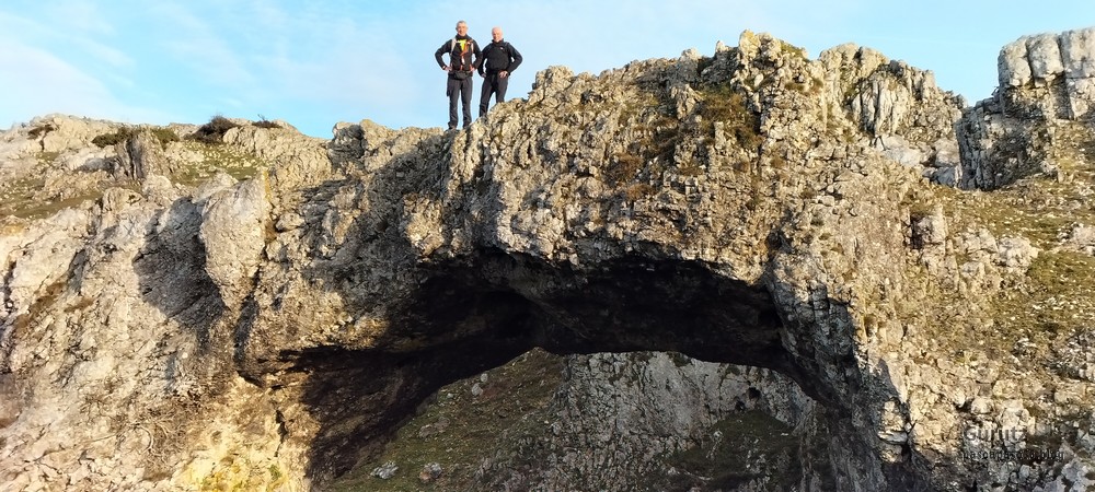 En este vídeo se puede apreciar la espectacularidad del paisaje de la Sakana (Vídeo Fede)Y llegamos al arco de Portupekoleze; sólo dos valientes nos atrevimos a cruzar por encima; si lleva 1.000 millones de años ahí, no se va a caer precisamente hoy.Parece que aguanta nuestro peso.Se estaba bien ahí arriba (Foto Mikel)Vista desde un lado.Vista desde el otro lado.Fede y Javier debajo del arco.Otra foto desde abajo.y otra, no me canso (Foto Fede)Javier fotografiando a un pajarito que nos estuvo vigilando durante parte de nuestra ruta.Hacía allí vamos, al fondo se ve la ermita de San Adrián, dentro de un rato estaremos allá.Parte del grupo posando (Foto Fede)Otra vez el pajarito (Foto Mikel)Otra mirada hacia Beriain-San DonatoSeguimos adelante caminando a veces por una mullida hierba y otras sorteando algunas rocas, sin problemas.Fernando con cara de estar disfrutando.El resto del grupo (Foto Fernando)Posado de Fede.Bajando a la brecha de Arrangarte, por donde se puede bajar, o subir, desde Lizarraga.Fede y Juan Cruz en la brecha, detrás Etxarri-Aranaz. (Foto Mikel)ya estamos llegando a San Adrián.Cazador cazado sacando la foto anterior (Foto Mikel)Ermita del santo y refugio.Puerta de entrada al recinto.cartel de bienvenida a la entrada; el recinto está dividido en dos estancias, una de ermita con la imagen del santo, y otra de refugio con una gran chimenea.Altar con la imagen del santo.Gran chimenea del refugio (Foto Mikel)Mirada hacia atrás desde San Adrián. Por esas crestas hemos andado.Con sus nombresVista hacia Berian y parte de Aralar desde San Adrián.Vista hacia Aralar.Vistas hacia Urbasa, Aizkorri y Anboto y Udalaitz.Buzón en la cima de San Adrián.Ara de San Adrián. Nos imaginamos que en este lugar antiguamente harían ofrendas a la divinidad.Fernando a punto de ser sacrificado; se libró porque llevábamos las navajas desafiladas (Foto Mikel)Vista del Ara desde otra perspectiva.Desde San Adrián comenzamos un descenso por un camino que discurre entre un bosque de hayasCamino cómodo y muy bonito, con el musgo de las rocas que parece fluorescente.El grupo disfrutando del camino (Foto Fede)Mirada hacia atrás; de allí venimos.LLegamos a Arzabal también conocido como Iruelorrieta.Disfrutando de las vistas (Foto Mikel)Seguimos ruta, todavía nos queda más de la mitad del recorrido. Al fondo Aizkorri (Foto Mikel)La Cueva de LezehaundiEs la mayor cueva de la sierra de Urbasa-Andia y su origen parece ser el hundimiento de una gran dolina, dejando una cornisa semicircular de piedra cubriendo una depresión circular. Más información en https://es.wikipedia.org/wiki/Cueva_de_Lezaundi#HistoriaEn sus alrededores la primavera adelantada se estaba abriendo paso. En la foto se ven unos narcisos.Vista frontal de la cueva.Otra vista. No bajamos porque ya íbamos justos de tiempo. Después de la cueva nos metimos en un laberinto de lapiaz cubierto de musgo (Foto Fede)Con estrechos pasillos entre las rocas.Había que andar con cuidado mirando donde se pisaba.las paredes estaban cubiertas de musgo.Todo ello entre un bosque de hayas jóvenes.Fernando salvando el obstáculo con un elegante estilo fosbury.Otra vez encontramos una ancha y cómoda pistaLlegamos a la calzada romana de Zunbeltz. No hay estudios acerca de su origen romano. Se sabe que fue una ruta de pastoreo que daba continuidad a la Cañada Real procedente de Tauste ( Zaragoza ). Tiene una anchura variable de 2,5 metros aunque el tramo más espectacular es el deZaldibe que es el que se ve en las fotos.El grupo pasando por la calzada.Desde otra perspectiva.y Llegamos a un valle; alguno se las prometía felices pensando que ya se habían acabado las subidas; ja, todavía nos quedaba subir a las crestas de Ollideko Bizkarra y a la Peña Arrangarte, las cuales se ven en la foto Una vez en la cresta se ve un amplio valle rodeado de montañas.Desque aquí también se ve el Arco de Portupekoleze y Beriain.Caminamos cómodamente por praderaYa estamos llegando al final de la ruta; la foto no está hecha con un dron, está hecha por otro tipo de pájaro (Foto Mikel)En la parte superior de la cantera se veía a los buitres abriendo las alas. Punto final, nos cambiamos y a comer en la benta.
