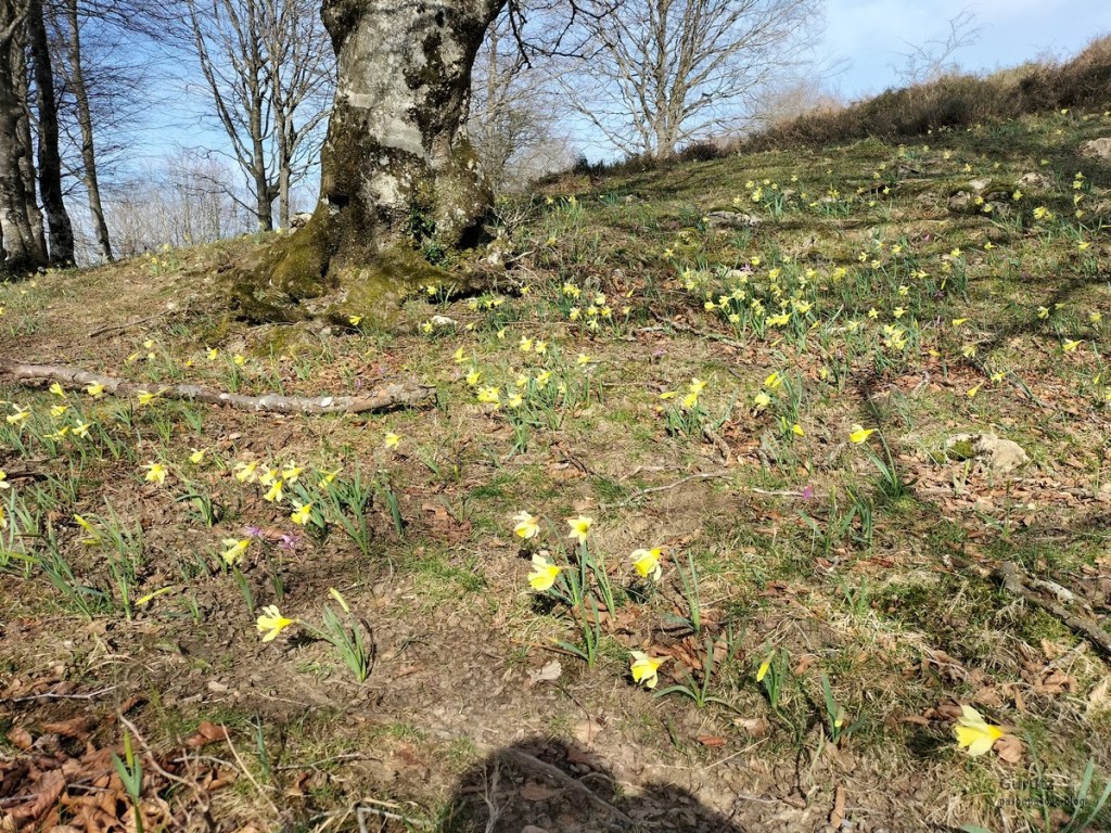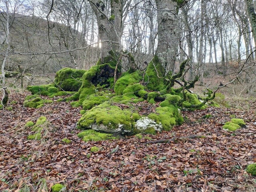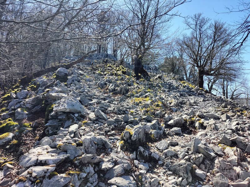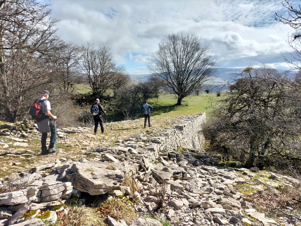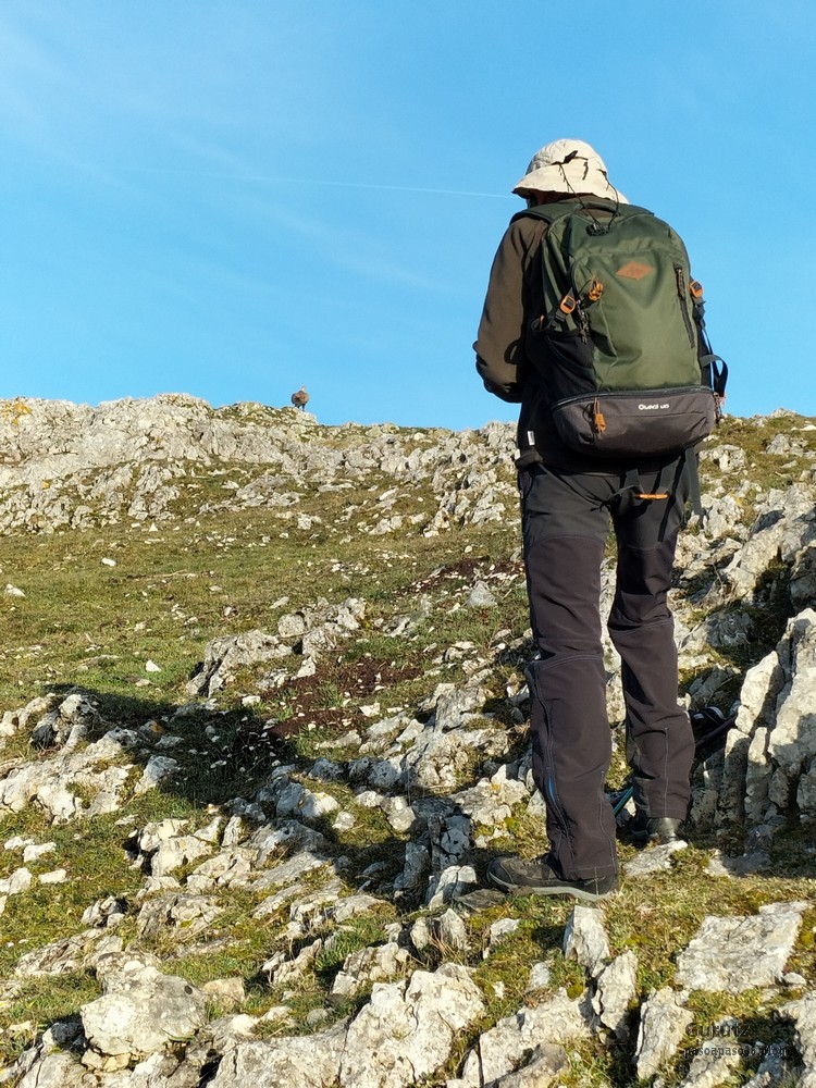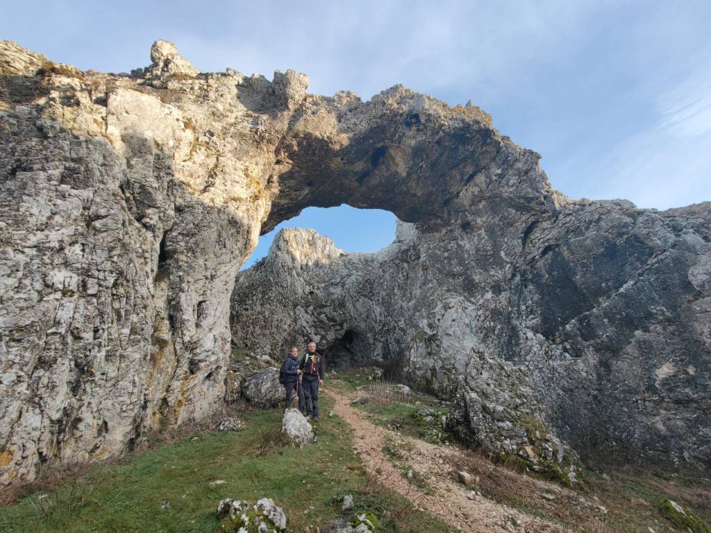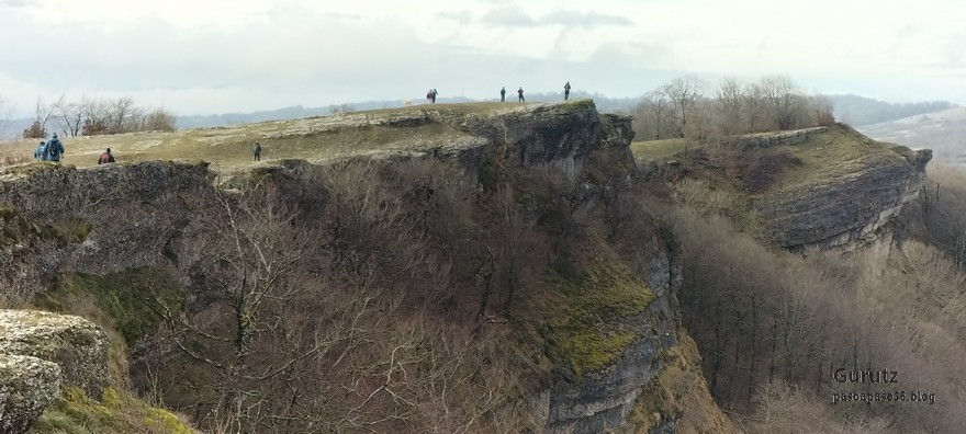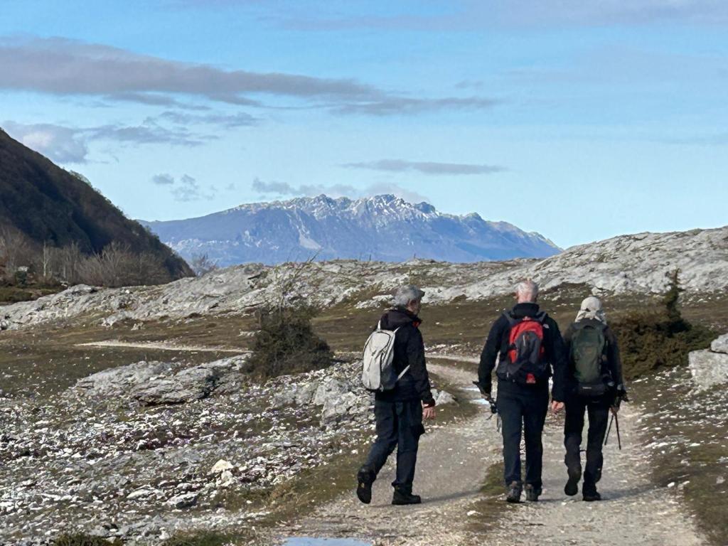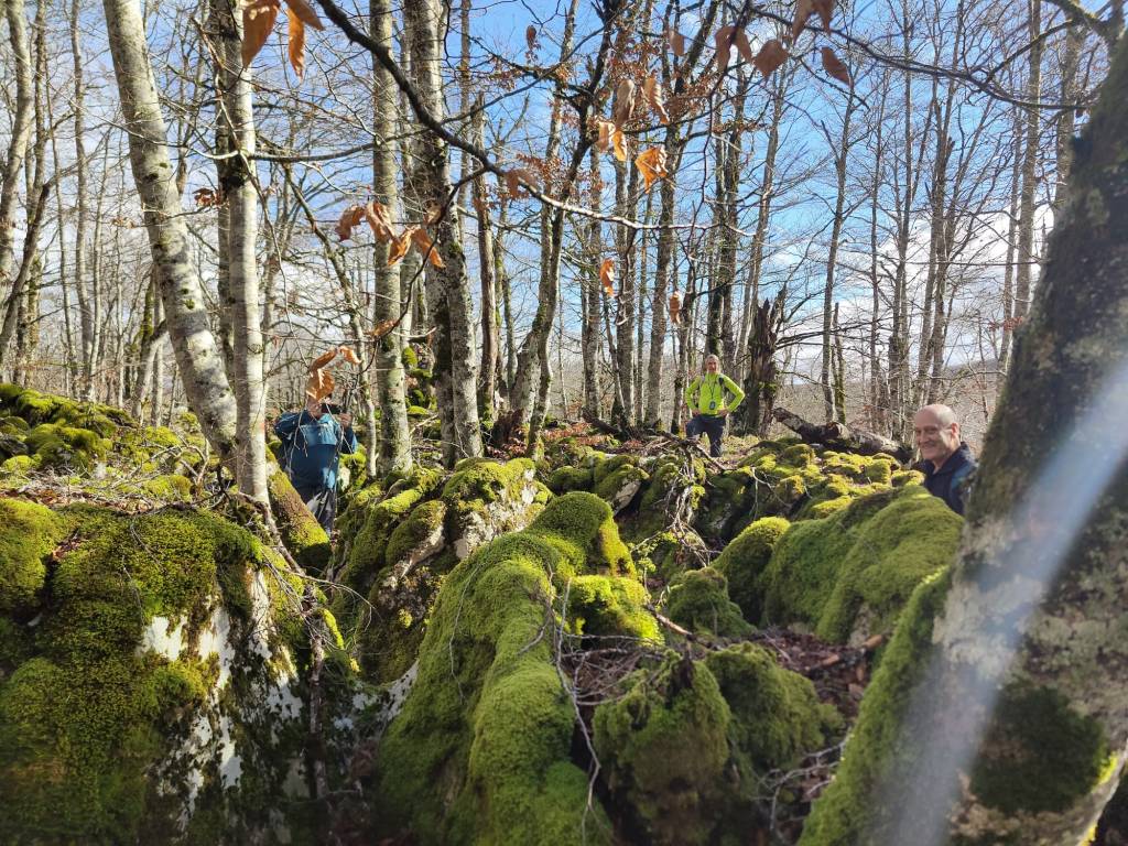En este vídeo se puede apreciar la espectacularidad del paisaje de la Sakana (Vídeo Fede)Y llegamos al arco de Portupekoleze; sólo dos valientes nos atrevimos a cruzar por encima; si lleva 1.000 millones de años ahí, no se va a caer precisamente hoy.Parece que aguanta nuestro peso.Se estaba bien ahí arriba (Foto Mikel)Vista desde un lado.Vista desde el otro lado.Fede y Javier debajo del arco.Otra foto desde abajo.y otra, no me canso (Foto Fede)Javier fotografiando a un pajarito que nos estuvo vigilando durante parte de nuestra ruta.Hacía allí vamos, al fondo se ve la ermita de San Adrián, dentro de un rato estaremos allá.Parte del grupo posando (Foto Fede)Otra vez el pajarito (Foto Mikel)Otra mirada hacia Beriain-San DonatoSeguimos adelante caminando a veces por una mullida hierba y otras sorteando algunas rocas, sin problemas.Fernando con cara de estar disfrutando.El resto del grupo (Foto Fernando)Posado de Fede.Bajando a la brecha de Arrangarte, por donde se puede bajar, o subir, desde Lizarraga.Fede y Juan Cruz en la brecha, detrás Etxarri-Aranaz. (Foto Mikel)ya estamos llegando a San Adrián.Cazador cazado sacando la foto anterior (Foto Mikel)Ermita del santo y refugio.Puerta de entrada al recinto.cartel de bienvenida a la entrada; el recinto está dividido en dos estancias, una de ermita con la imagen del santo, y otra de refugio con una gran chimenea.Altar con la imagen del santo.Gran chimenea del refugio (Foto Mikel)Mirada hacia atrás desde San Adrián. Por esas crestas hemos andado.Con sus nombresVista hacia Berian y parte de Aralar desde San Adrián.Vista hacia Aralar.Vistas hacia Urbasa, Aizkorri y Anboto y Udalaitz.Buzón en la cima de San Adrián.Ara de San Adrián. Nos imaginamos que en este lugar antiguamente harían ofrendas a la divinidad.Fernando a punto de ser sacrificado; se libró porque llevábamos las navajas desafiladas (Foto Mikel)Vista del Ara desde otra perspectiva.Desde San Adrián comenzamos un descenso por un camino que discurre entre un bosque de hayasCamino cómodo y muy bonito, con el musgo de las rocas que parece fluorescente.El grupo disfrutando del camino (Foto Fede)Mirada hacia atrás; de allí venimos.LLegamos a Arzabal también conocido como Iruelorrieta.Disfrutando de las vistas (Foto Mikel)Seguimos ruta, todavía nos queda más de la mitad del recorrido. Al fondo Aizkorri (Foto Mikel)La Cueva de LezehaundiEs la mayor cueva de la sierra de Urbasa-Andia y su origen parece ser el hundimiento de una gran dolina, dejando una cornisa semicircular de piedra cubriendo una depresión circular. Más información en https://es.wikipedia.org/wiki/Cueva_de_Lezaundi#HistoriaEn sus alrededores la primavera adelantada se estaba abriendo paso. En la foto se ven unos narcisos.Vista frontal de la cueva.Otra vista. No bajamos porque ya íbamos justos de tiempo. Después de la cueva nos metimos en un laberinto de lapiaz cubierto de musgo (Foto Fede)Con estrechos pasillos entre las rocas.Había que andar con cuidado mirando donde se pisaba.las paredes estaban cubiertas de musgo.Todo ello entre un bosque de hayas jóvenes.Fernando salvando el obstáculo con un elegante estilo fosbury.Otra vez encontramos una ancha y cómoda pistaLlegamos a la calzada romana de Zunbeltz. No hay estudios acerca de su origen romano. Se sabe que fue una ruta de pastoreo que daba continuidad a la Cañada Real procedente de Tauste ( Zaragoza ). Tiene una anchura variable de 2,5 metros aunque el tramo más espectacular es el deZaldibe que es el que se ve en las fotos.El grupo pasando por la calzada.Desde otra perspectiva.y Llegamos a un valle; alguno se las prometía felices pensando que ya se habían acabado las subidas; ja, todavía nos quedaba subir a las crestas de Ollideko Bizkarra y a la Peña Arrangarte, las cuales se ven en la foto Una vez en la cresta se ve un amplio valle rodeado de montañas.Desque aquí también se ve el Arco de Portupekoleze y Beriain.Caminamos cómodamente por praderaYa estamos llegando al final de la ruta; la foto no está hecha con un dron, está hecha por otro tipo de pájaro (Foto Mikel)En la parte superior de la cantera se veía a los buitres abriendo las alas. Punto final, nos cambiamos y a comer en la benta.
