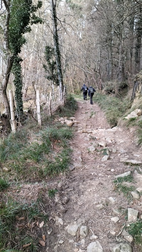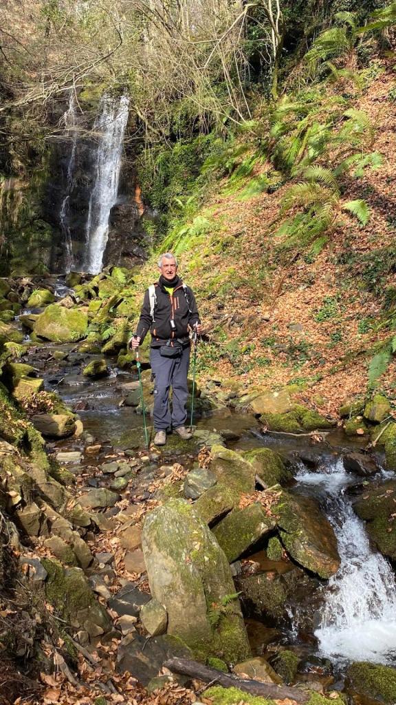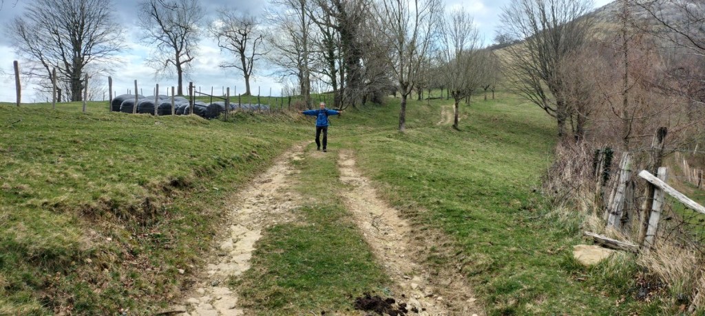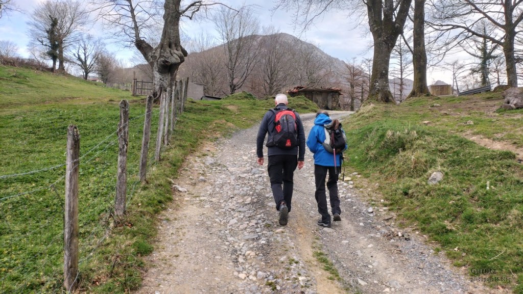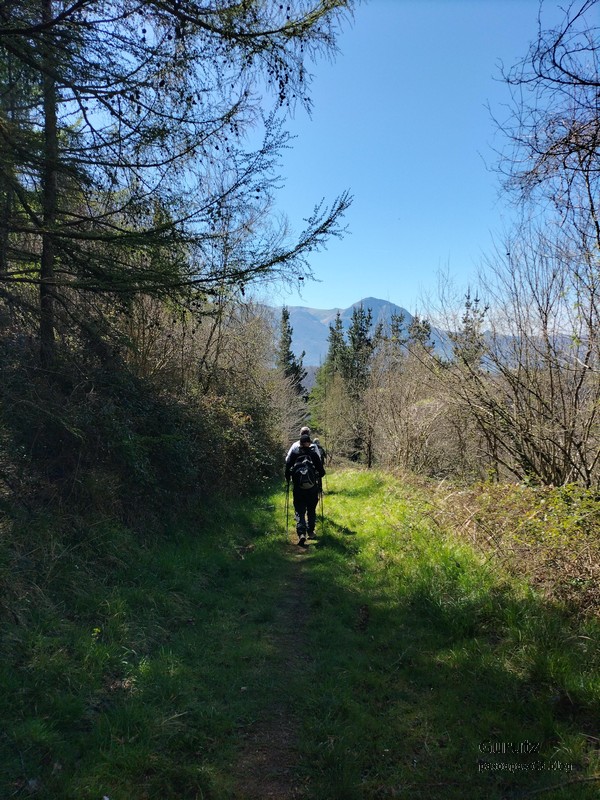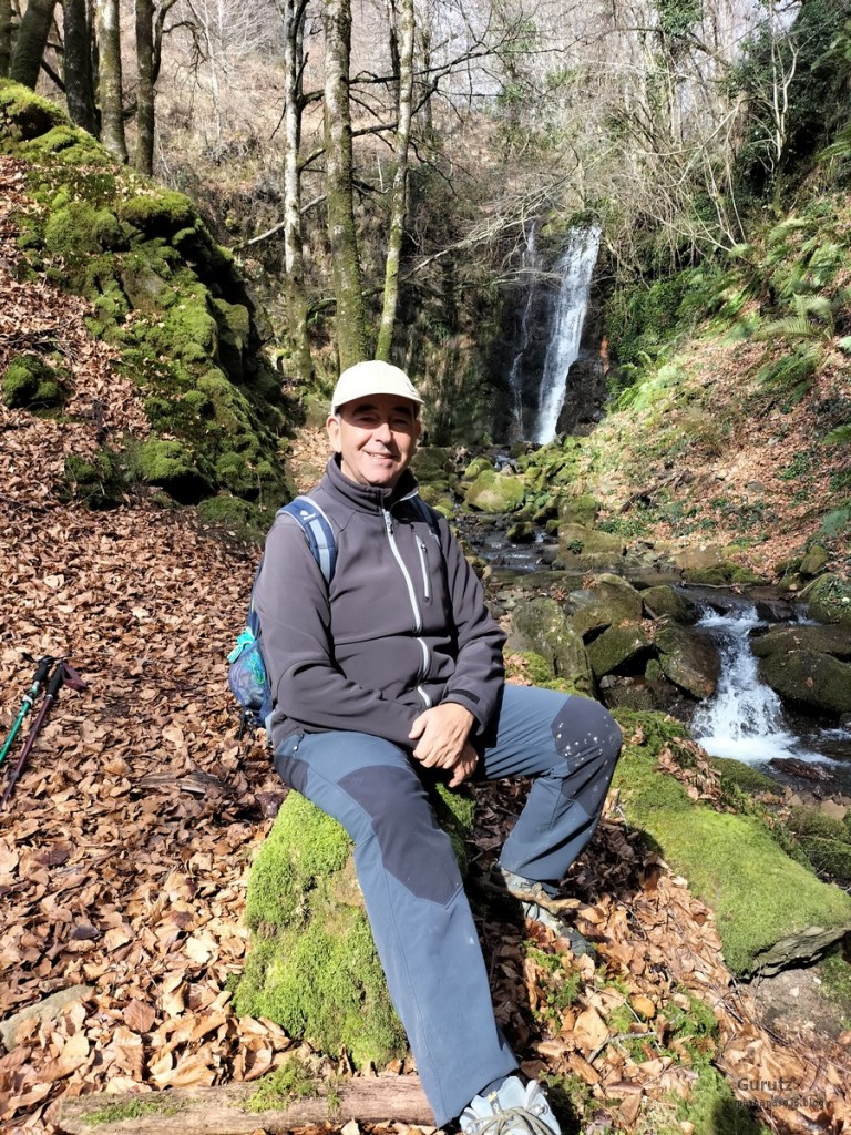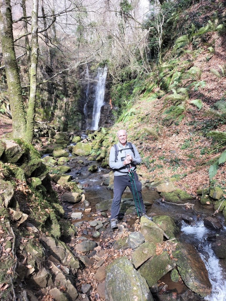 En este video se puede apreciar la belleza del arroyo y cascada de Ugarana (Vídeo Fede).Javier también estaba, aunque no le guste mucho salir en las fotos (Foto Fede).Vista del precioso valle formado por el arroyo Ugarana. Unas veces caminábamos por una orilla y más tarde por la otra. Tuvimos que cruzar el arroyo un montón de veces, a la subida hacia la cascada y a la bajada, todas extremando el cuidado; al final nadie se cayó al agua. El arroyo llevaba el caudal justo, ni mucho que hubiera dificultado los cruces, ni poco que hubiera hecho la cascada menos espectacular.Una vez abandonado el valle por donde transita el arroyo Ugarana, tomamos una pista de tierra que desciende hacia Elgea.Cómodamente vamos termiando la etapa.Ya al final había un rebaño de vacas donde destacaba está con un cuerno tan torcido que le dificultaba la visión de un ojo (Foto Koldo).