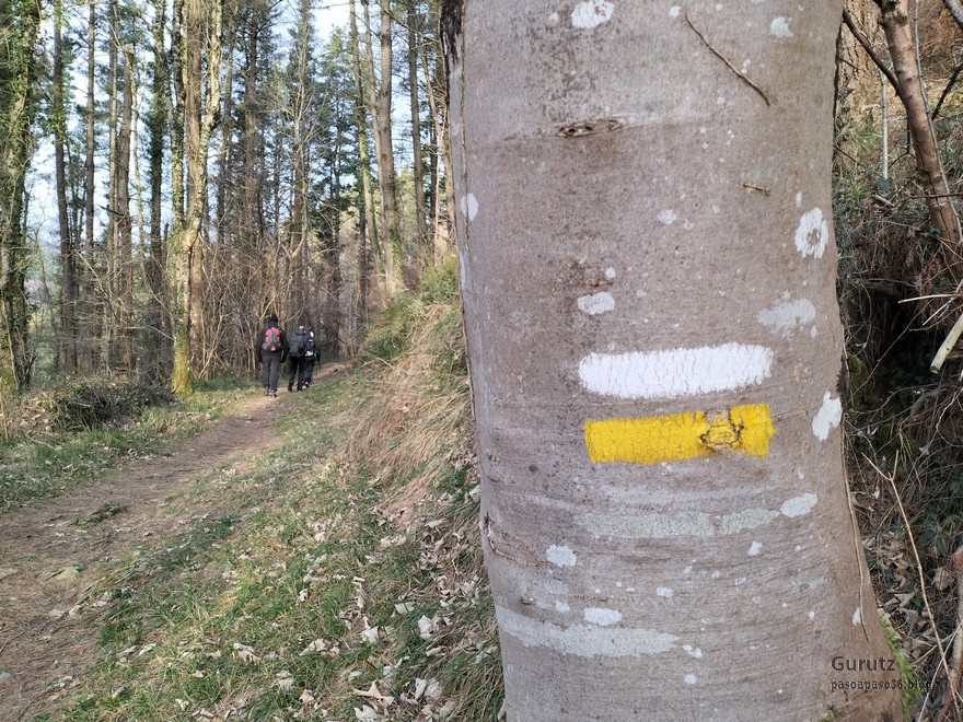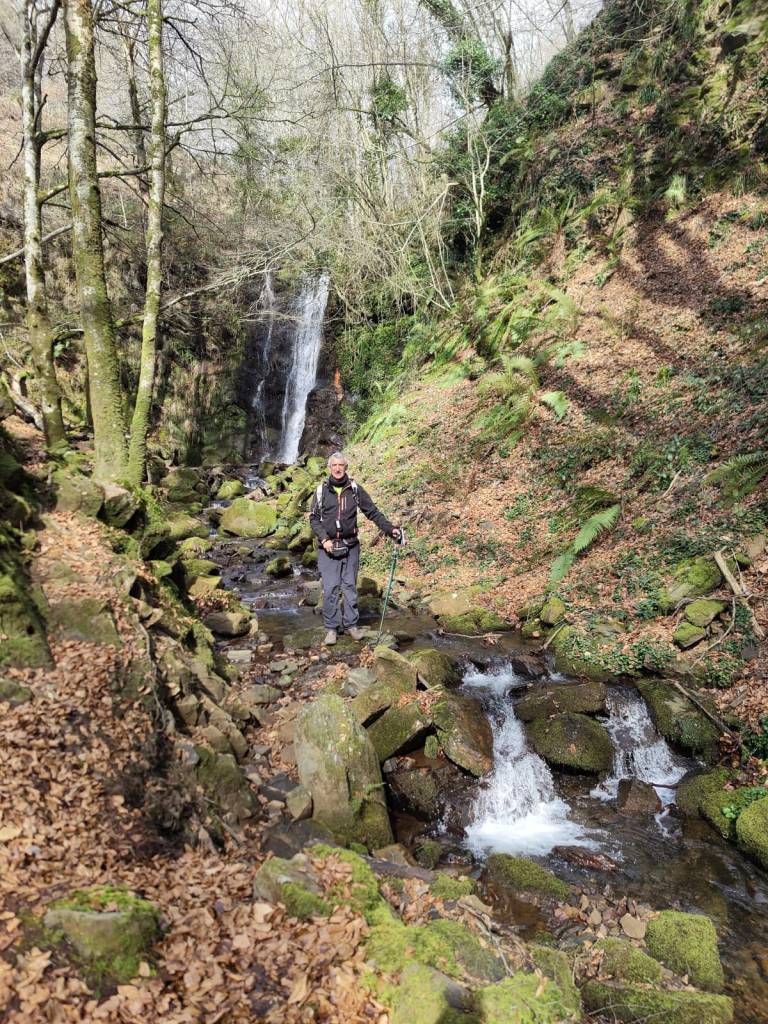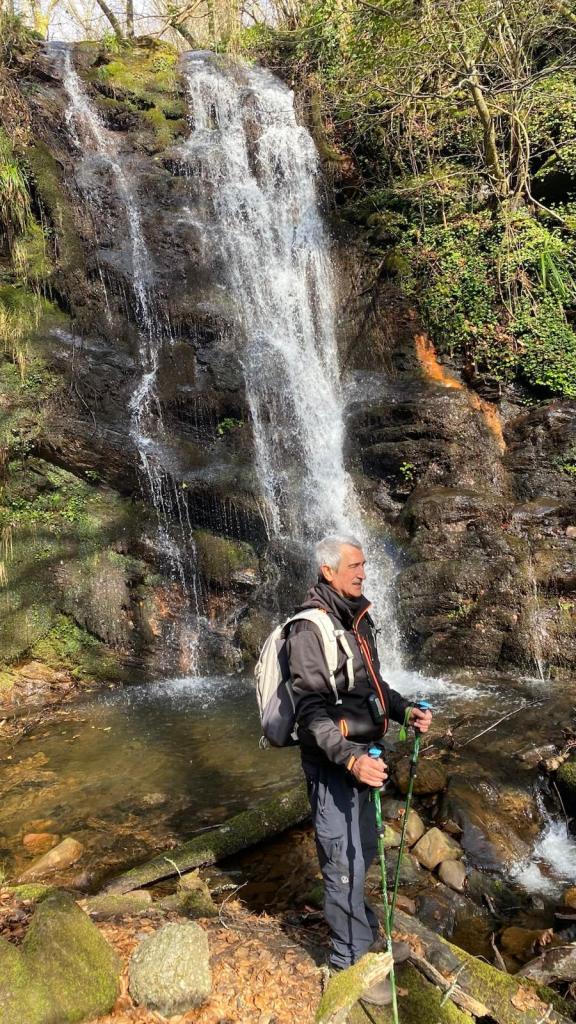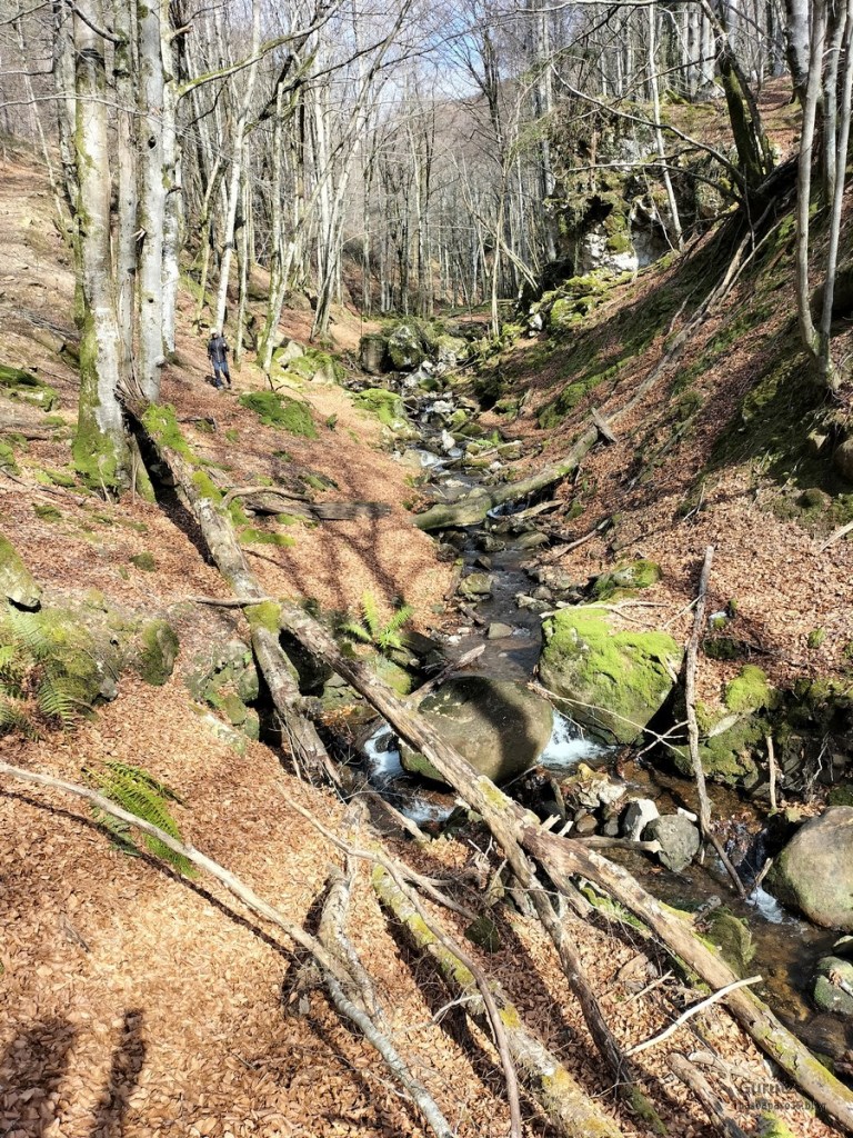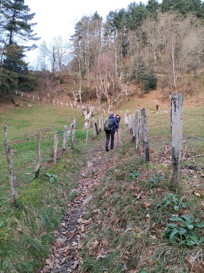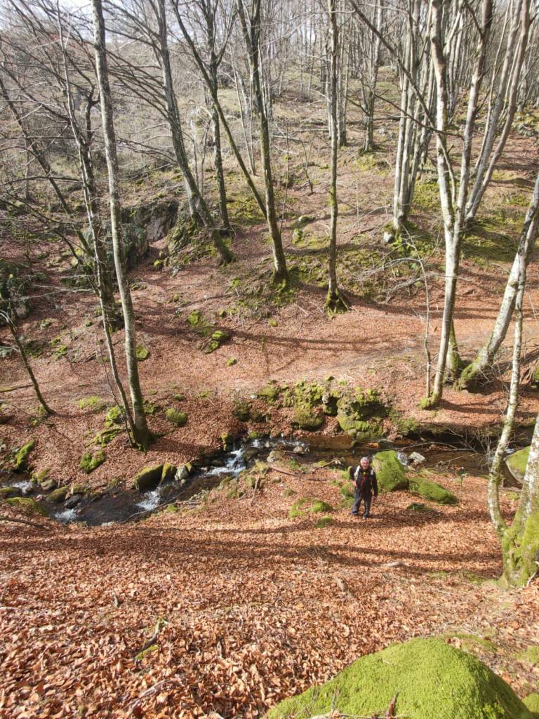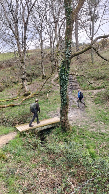 En este video se puede apreciar la belleza del arroyo y cascada de Ugarana (Vídeo Fede).Javier también estaba, aunque no le guste mucho salir en las fotos (Foto Fede).Vista del precioso valle formado por el arroyo Ugarana. Unas veces caminábamos por una orilla y más tarde por la otra. Tuvimos que cruzar el arroyo un montón de veces, a la subida hacia la cascada y a la bajada, todas extremando el cuidado; al final nadie se cayó al agua. El arroyo llevaba el caudal justo, ni mucho que hubiera dificultado los cruces, ni poco que hubiera hecho la cascada menos espectacular.Una vez abandonado el valle por donde transita el arroyo Ugarana, tomamos una pista de tierra que desciende hacia Elgea.Cómodamente vamos termiando la etapa.Ya al final había un rebaño de vacas donde destacaba está con un cuerno tan torcido que le dificultaba la visión de un ojo (Foto Koldo).