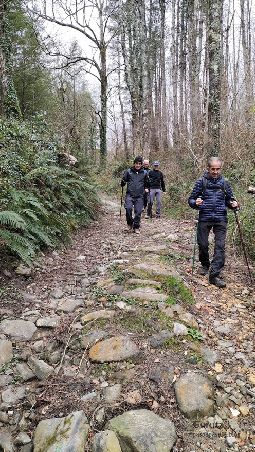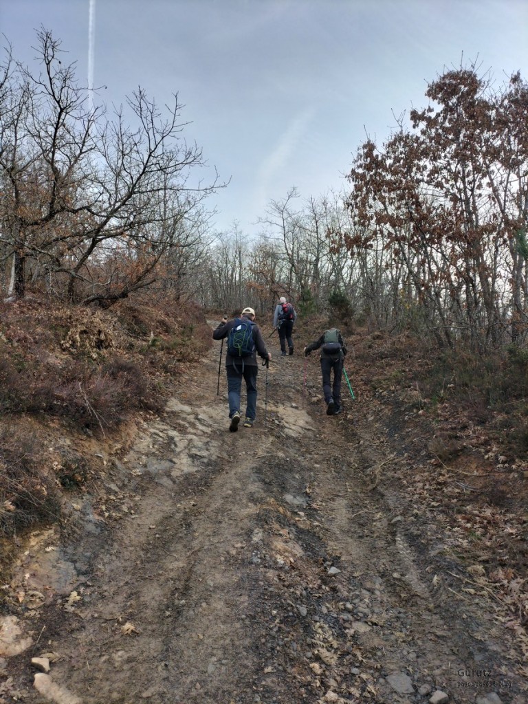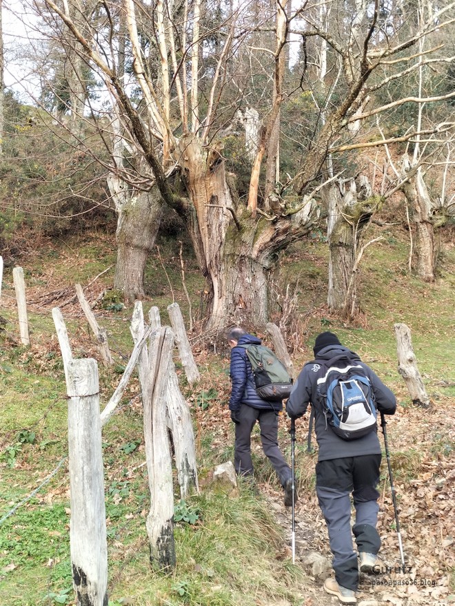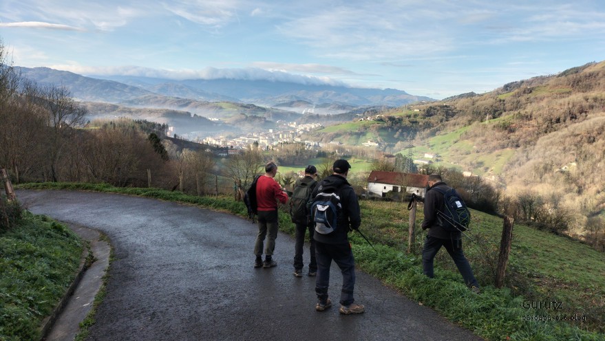 Hoy nos hemos juntado 4 amigos, Javier, Mikel, Fernando y Juan Cruz, para hacer esta travesía de 16,2 km, con 777 m. de desnivel positivo en la que hemos empleado 6:48 horas. Hemos coronado los montes Otsabio (795m.), Laparmendi (804) y, entre ambos, Antxusietako Gaina (766m.). Hemos ido en coche hasta Tolosa, donde el bus de Lurraldebus nos ha llevado a Lizartza, para desde allí iniciar la marcha a las 8:19. Al comienzo hacía frio, unos 8º pero, entre el día soleado que ha hecho, más el esfuerzo de subir unas fuertes pendientes, enseguida ha subido la temperatura.