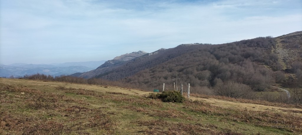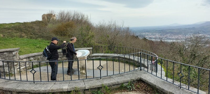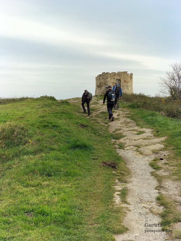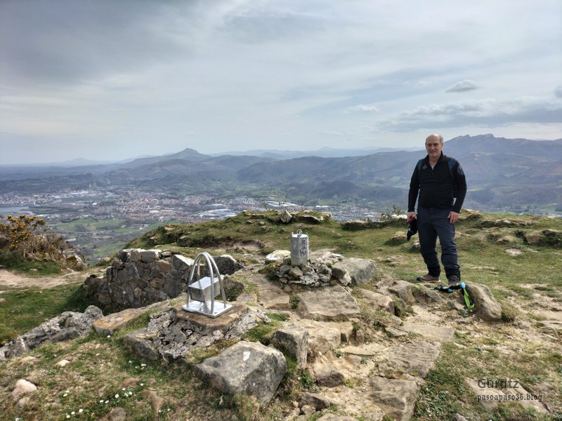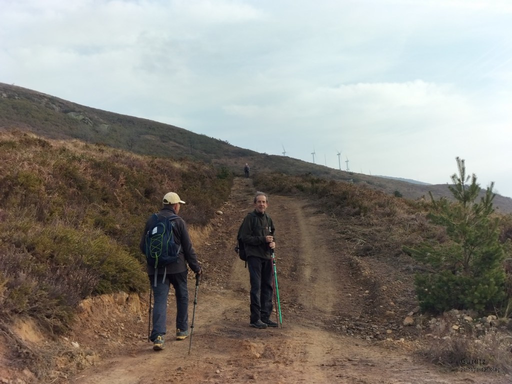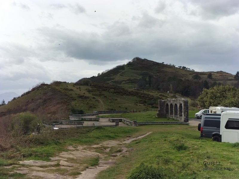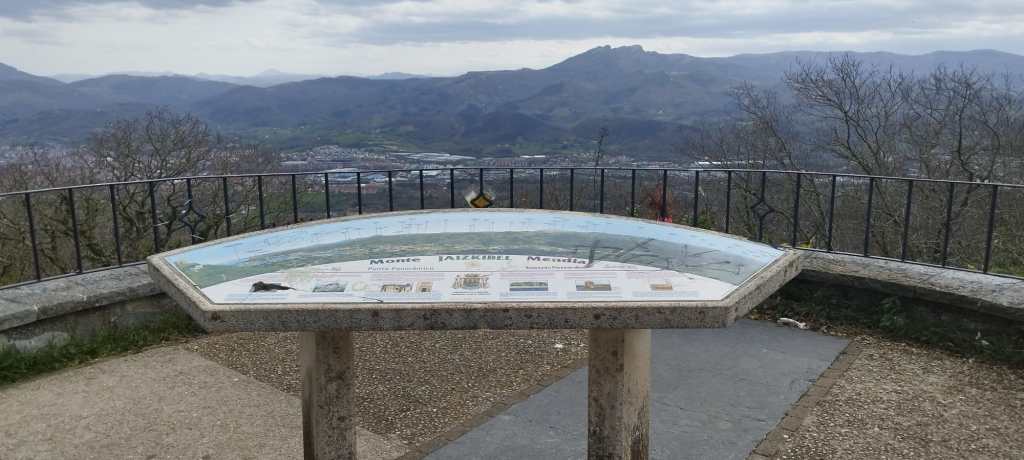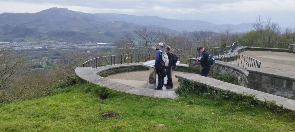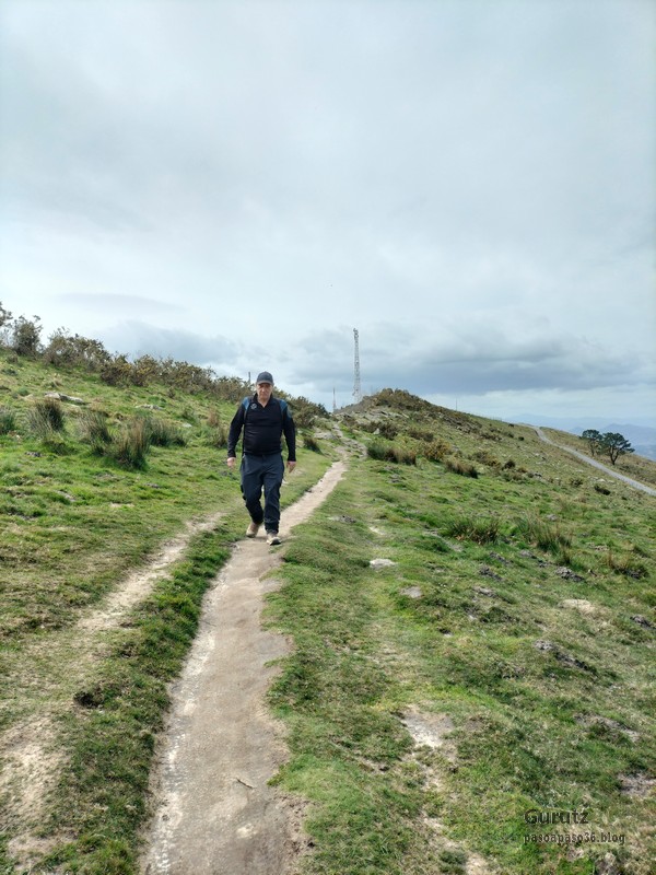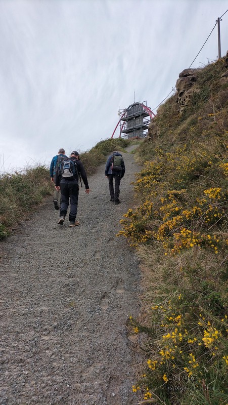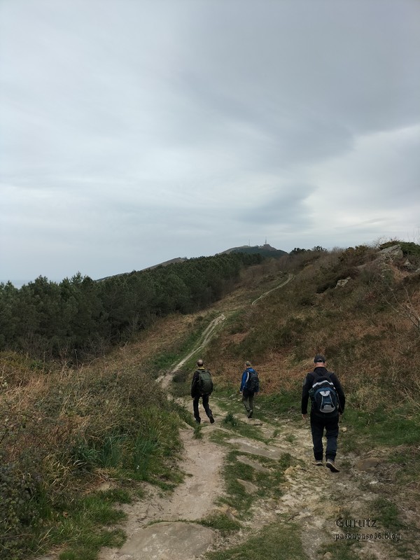 Video tomado en Mitxintxola en el que se puede apreciar el fuerte viento (Vídeo Fernando).Descendemos de Mitxintxola en dirección a la carretera, la cual cruzamos cerca del merendero, atravesamos un puentecito de madera que hicieron cuando quisieron promocionar el sendero Talaia. Este puente resulta útil, pero otras construcciones …Fernando cruzando el puentecito.Pasando junto a una de las construcciones que han devenido inútiles. Se hicieron para que los ciclistas y los senderistas salvásemos las vallas de alambre existentes, pero por lo que se ve ni a unos, ni a otros, nos ha convencido el sistema, la valla de alambre ha desaparecido y las escaleras de madera ya no las utiliza nadie.Juanjo en el primer torreón «Lehenbiziko Dorrea».Foto de grupo en «Lehenbiziko Dorrea» ( Foto Fernando)Ya vemos las antenas de Jaizkibel, ¡allá vamos!Seguimos por la ladera norte de Jaizkibel por lo que el viento no nos molesta apenas.Nos acercamos al «Bigarren Dorrea».Foto de grupo al pie de «Bigarren Dorrea» (Foto Juanjo).«Bigarren Dorrea»Fernando ante «Xangaxi Dorrea».ya estamos en la cima de Allerru.Vértice geodésico en la cima y, al fondo, Peñas de Aia y Larhun.Fernando con cara de felicidad por estar en el punto más alto de la travesía, Allerru (547m.)Fernando posando en Allerru con Peñas de Aia y larhun detrás¡Vamos para abajo!Llegamos a las ruinas del antiguo parador; el aparcamiento está lleno de autocaravanas.El mirador desde el que se pueden ver los montes de alrededor.Mesa de orientación instalada en el mirador; nos fijamos y con su ayuda pudimos ver hasta el monte Ori (Foto Juanjo).Otra perspectiva del mirador (Foto Juanjo).Y otra perspectiva del mirador y del camino ya recorrido.Subiendo desde el mirador hacia «Santa Barbara Dorrea, Torreón IV».«Santa Barbara Dorrea, Torreón IV».Llegamos al «Torreón IV, Erramuzko Dorrea».Bajamos atravesando un prado lleno de margaritas. A los lejos va Juanjo, quien desde que terminó la Maratón de Sevilla está salido. Perdón, «Salido» no es la expresión que quería utilizar, quería decir «está que se sale», salido probablemente también andará, pero como no es de los que alardean, no lo podemos saber seguro. Un posado con la bahía de Txingudi detrás.Irún, Hondarribi y Hendaia.Bahía de Txingudi y playa de Hendaía.Ya estamos en Guadalupe.Delante de la ermita de Guadalupe, decidiendo por donde bajar a Hondarribi (Foto Juanjo).Ya bajando de Guadalupe encontramos un vía crucis, justo lo que nos estaba pareciendo el final de está larga travesía.