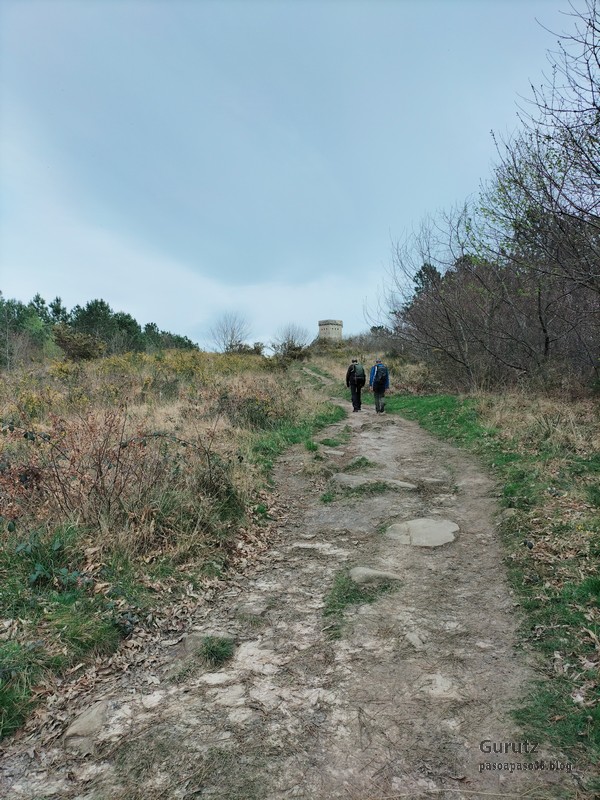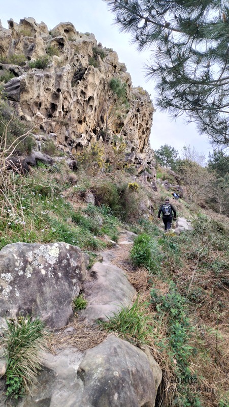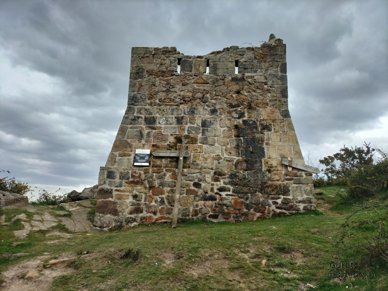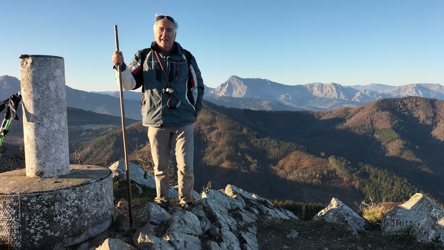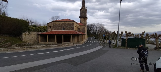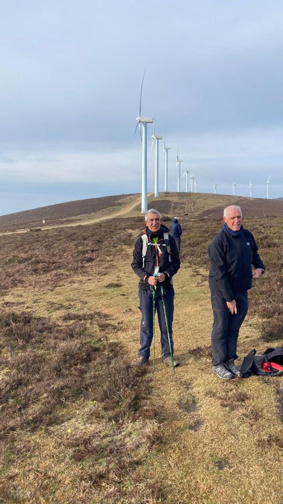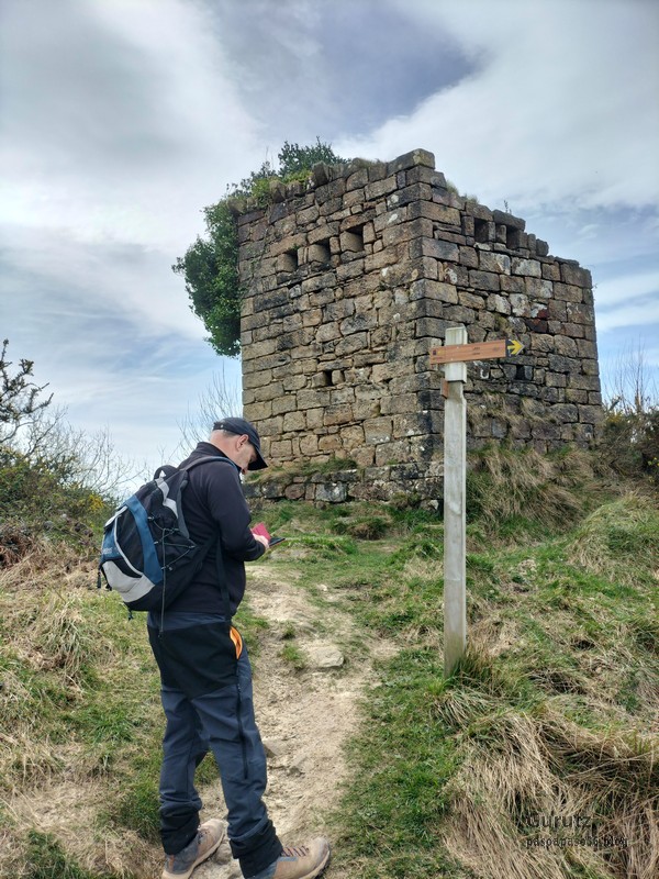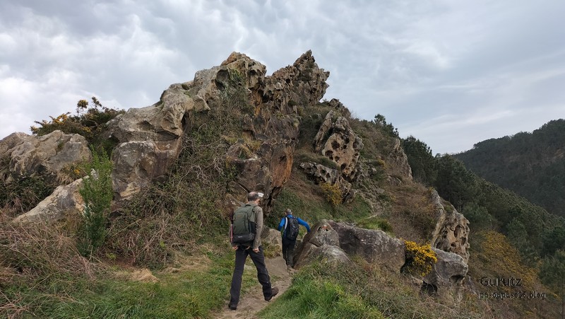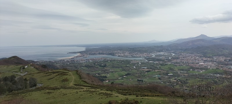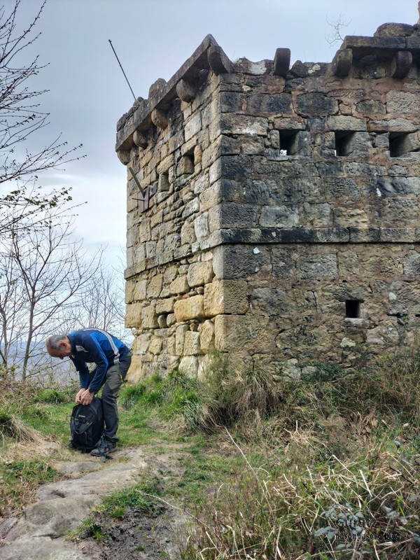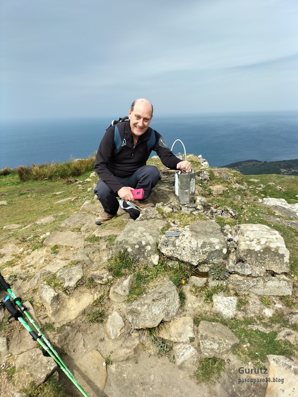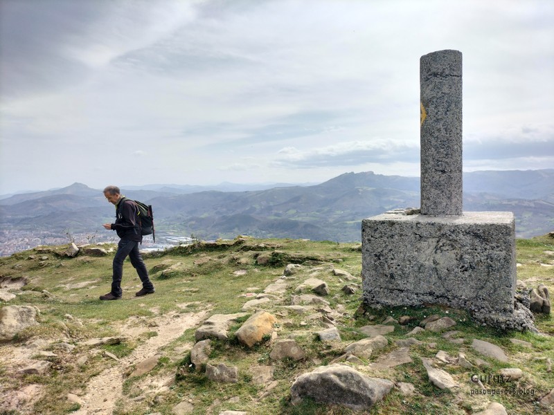 Video tomado en Mitxintxola en el que se puede apreciar el fuerte viento (Vídeo Fernando).Descendemos de Mitxintxola en dirección a la carretera, la cual cruzamos cerca del merendero, atravesamos un puentecito de madera que hicieron cuando quisieron promocionar el sendero Talaia. Este puente resulta útil, pero otras construcciones …Fernando cruzando el puentecito.Pasando junto a una de las construcciones que han devenido inútiles. Se hicieron para que los ciclistas y los senderistas salvásemos las vallas de alambre existentes, pero por lo que se ve ni a unos, ni a otros, nos ha convencido el sistema, la valla de alambre ha desaparecido y las escaleras de madera ya no las utiliza nadie.Juanjo en el primer torreón «Lehenbiziko Dorrea».Foto de grupo en «Lehenbiziko Dorrea» ( Foto Fernando)Ya vemos las antenas de Jaizkibel, ¡allá vamos!Seguimos por la ladera norte de Jaizkibel por lo que el viento no nos molesta apenas.Nos acercamos al «Bigarren Dorrea».Foto de grupo al pie de «Bigarren Dorrea» (Foto Juanjo).«Bigarren Dorrea»Fernando ante «Xangaxi Dorrea».ya estamos en la cima de Allerru.Vértice geodésico en la cima y, al fondo, Peñas de Aia y Larhun.Fernando con cara de felicidad por estar en el punto más alto de la travesía, Allerru (547m.)Fernando posando en Allerru con Peñas de Aia y larhun detrás¡Vamos para abajo!Llegamos a las ruinas del antiguo parador; el aparcamiento está lleno de autocaravanas.El mirador desde el que se pueden ver los montes de alrededor.Mesa de orientación instalada en el mirador; nos fijamos y con su ayuda pudimos ver hasta el monte Ori (Foto Juanjo).Otra perspectiva del mirador (Foto Juanjo).Y otra perspectiva del mirador y del camino ya recorrido.Subiendo desde el mirador hacia «Santa Barbara Dorrea, Torreón IV».«Santa Barbara Dorrea, Torreón IV».Llegamos al «Torreón IV, Erramuzko Dorrea».Bajamos atravesando un prado lleno de margaritas. A los lejos va Juanjo, quien desde que terminó la Maratón de Sevilla está salido. Perdón, «Salido» no es la expresión que quería utilizar, quería decir «está que se sale», salido probablemente también andará, pero como no es de los que alardean, no lo podemos saber seguro. Un posado con la bahía de Txingudi detrás.Irún, Hondarribi y Hendaia.Bahía de Txingudi y playa de Hendaía.Ya estamos en Guadalupe.Delante de la ermita de Guadalupe, decidiendo por donde bajar a Hondarribi (Foto Juanjo).Ya bajando de Guadalupe encontramos un vía crucis, justo lo que nos estaba pareciendo el final de está larga travesía.