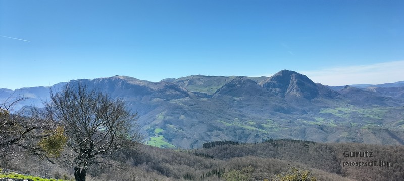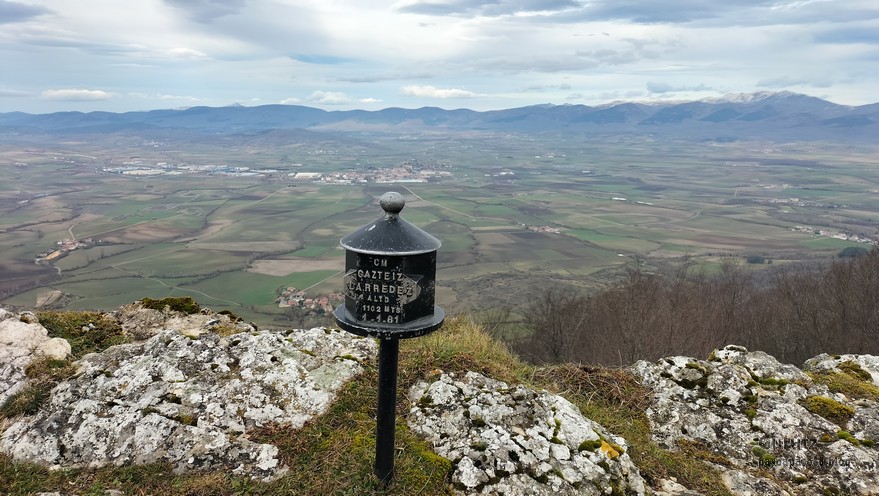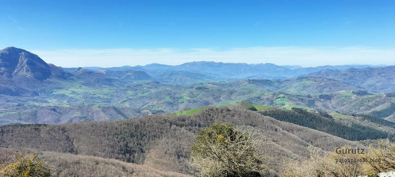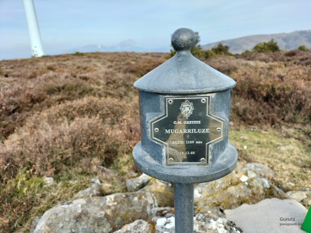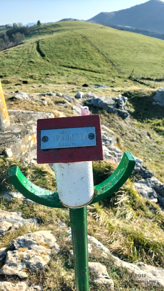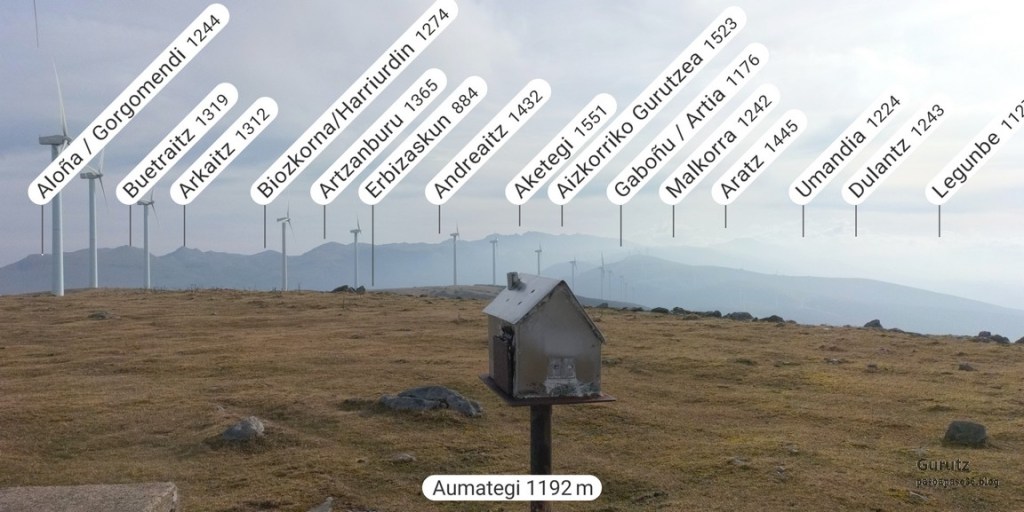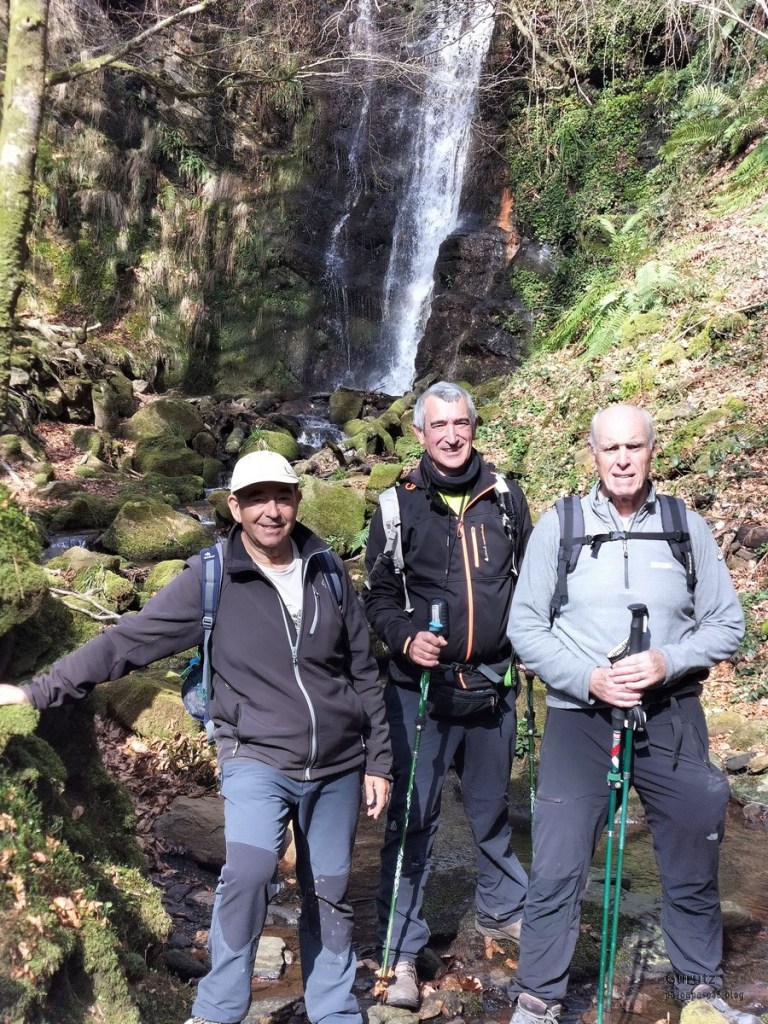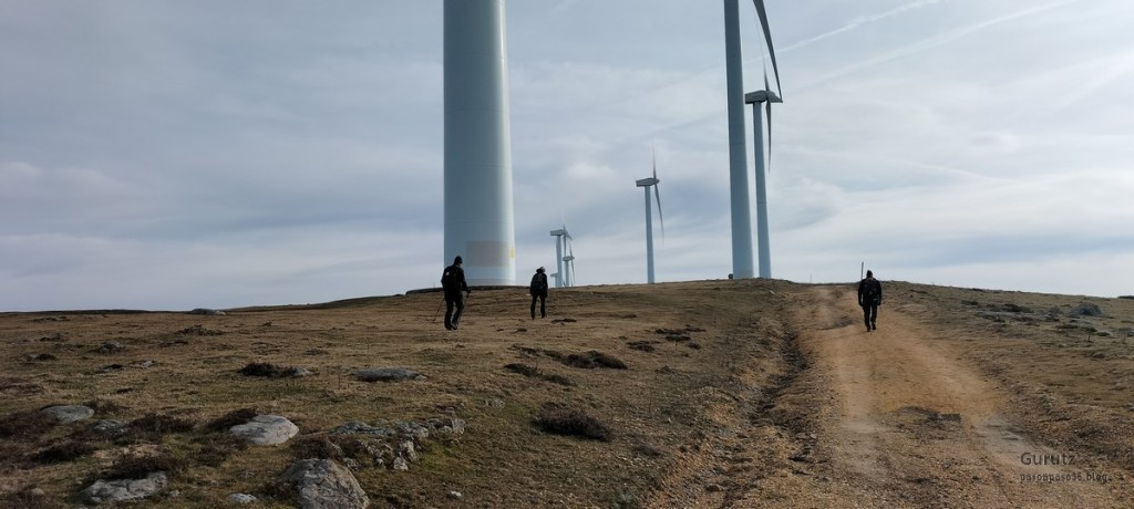 Foto de inicio, de izda. a decha. Javier, Fede y Koldo. Al fondo la iglesia de Elgea.Yo también estaba.Hemos comenzado a andar por carretera la cual, al poco rato, se transforma en pista y se empina bastante. En la foto sorteando una langa.La cuesta es pronunciada.Aunque de vez en cuando nos da un descansito, eso si, corto.Parece que también es zona de caza de becada.Ya vemos los aerogeneradores; no se que ha desayunado Fede que va como una moto.Antes nos hemos parado para quitarnos ropa, ahora nos paramos para volverla a poner. Aquí arriba sopla un viento bastante fuerte que, aunque viene del sur, es frio.Hemos llegado a un collado y vemos lo que nos queda para llegar a Aumategi.Hace frio y bastante viento. Los aerogeneradores giran y sus aspas hacen bastante ruido (Foto Koldo).Ya vamos llegando al primer objetivo del día, Aumategi. Este parque eólico fue el primero en construirse en Euskadi en el año 2000. Los molinos tienen una altura que oscila entre los 40 y 45 metros, con unas palas de entre 25 y 27 metros de longitud; ante ellos nos sentimos enanos. ¿Cómo serán los que pretenden instalar ahora con alturas que superan los 200 metros?.Ya hemos llegado a Aumategi. Al fondo la sierra Aizkorri-Aloña entre la bruma.Aumategi (1192m) tiene tres buzones, un mojón y un vértice geodésico (Foto Fede).Vista desde Aumategi hacia el Norte.Vista desde Aumategi hacia el Este.Hemos caminado por la frontera entre Araba y Gipuzkoa, por ello había mojones delimitando las provincias, como este moderno con la placa donde señala que a un lado está Barrundia (Araba) y al otro Eskoriatza (Gipuzkoa) (Foto Koldo).Este es un mojón más antiguo y solo tiene tallada la «B» en un lado y la «E» en el otro.Vista hacia Aumategi; de allí venimos.El pantano de Ullibarri-Ganboa.Buzones de Mugarriluze, al fondo Anboto (Foto Koldo)Detalle del buzón de Mugarriluze.El mugarri que da nombre a esta cumbre.Después de almorzar al sol nos vamos hacia Pagobedeinkatua por una pista ancha y cómoda.La primavera ya está aquí, una campa llena de narcisos.primer plano de un narciso.Buzón de Pagobedeinkatua.Vista desde Pagobedeinkatua, Anboto a la izquierda e Udalaitz a la derecha.Ahí asoman las cimas rocosas de Kurutzeberri, Elorretako Aiztza, y Aranguren.Bajando nos encontramos que el camino atravesaba una plantación de cipreses que formaban una especie de túnel que filtraba la luz oscureciendo ese tramo. Poco después, para ir a la cascada Ugarana, nos metimos por una senda que fue difuminándose y terminamos andando campo a través sorteando zarzas y teniendo que saltar una valla.Al final conseguimos llegar al arroyo Ugarana, pero para ello tuvimos que bajar una empinada pendiente (Foto Fede).LLegamos al arroyo y vamos remontando el cauce, cruzándolo de vez en cuando para ir por la orilla más fácil de caminar.El vallecito es precioso, todo cubierto de hojas caídas y de musgo (Foto Fede).Koldo con cara de satisfacción ante la cascada de Ugarana.Fede feliz delante de la cascada.Yo también estaba. A ver quien se resiste a salir en la foto con un paisaje tan espectacular (Foto Fede).Trio de ases posando ante la cascada.Otra vez el trio. No sé cuantas fotos hicimos en ese lugar, pero fueron muchísimas. Los móviles sacaban humo.Juan Cruz posando en solitario (Foto Koldo).Arriesgando, más cerca de la cascada. (Foto Koldo).