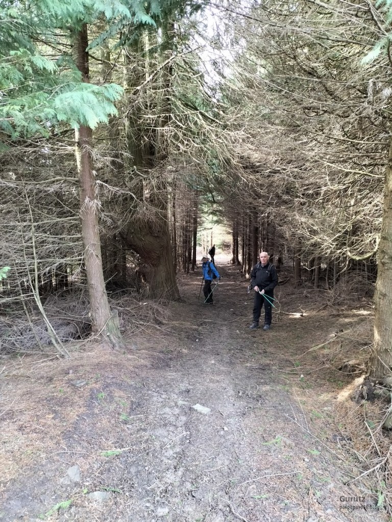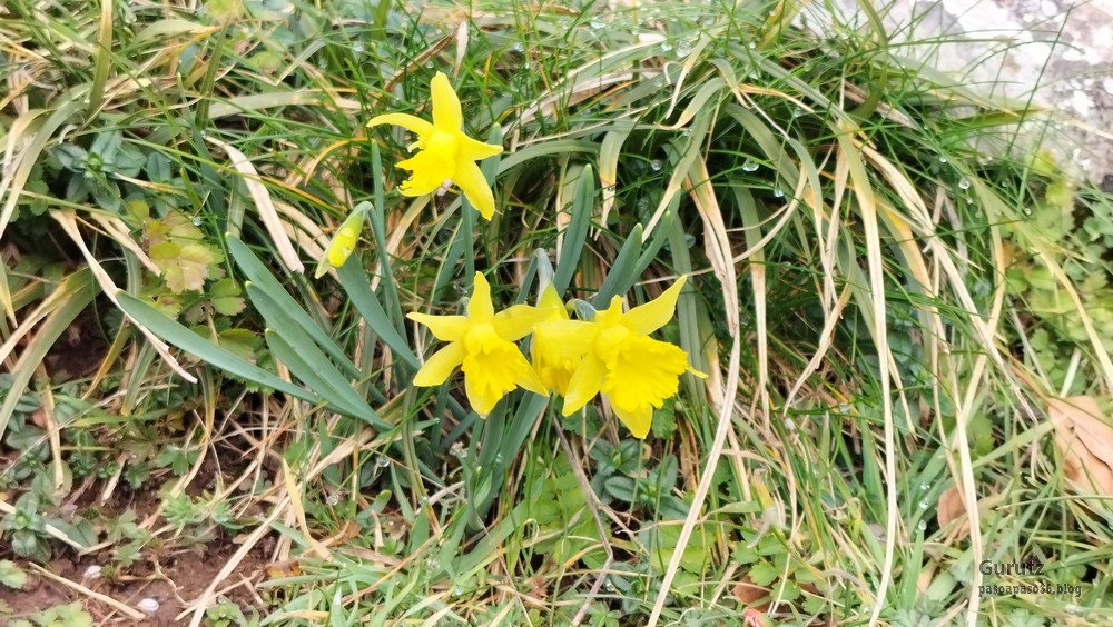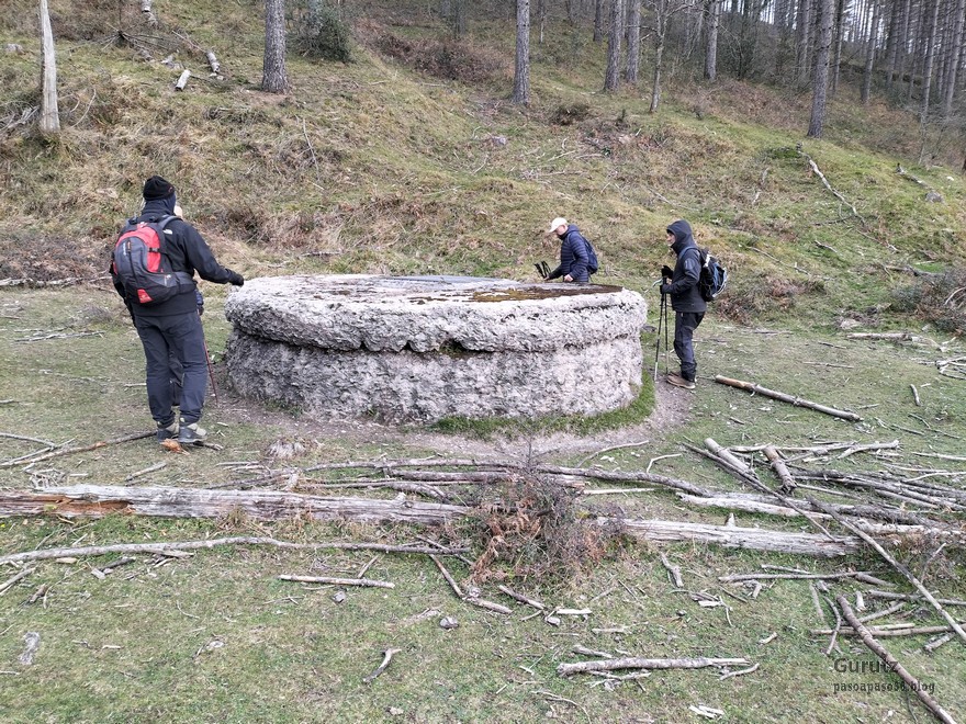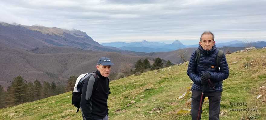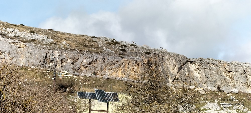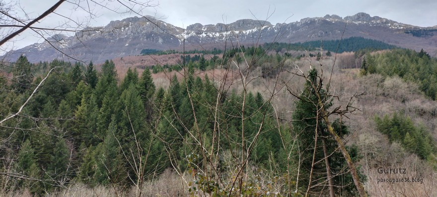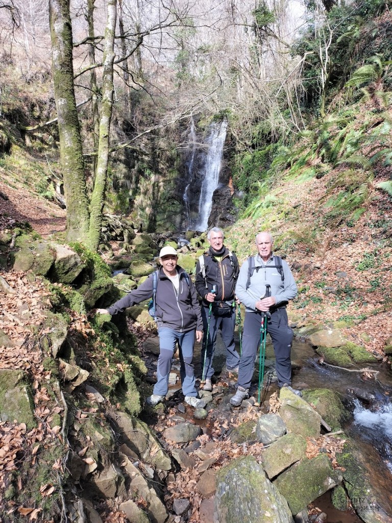 Foto de inicio, de izda. a decha. Javier, Fede y Koldo. Al fondo la iglesia de Elgea.Yo también estaba.Hemos comenzado a andar por carretera la cual, al poco rato, se transforma en pista y se empina bastante. En la foto sorteando una langa.La cuesta es pronunciada.Aunque de vez en cuando nos da un descansito, eso si, corto.Parece que también es zona de caza de becada.Ya vemos los aerogeneradores; no se que ha desayunado Fede que va como una moto.Antes nos hemos parado para quitarnos ropa, ahora nos paramos para volverla a poner. Aquí arriba sopla un viento bastante fuerte que, aunque viene del sur, es frio.Hemos llegado a un collado y vemos lo que nos queda para llegar a Aumategi.Hace frio y bastante viento. Los aerogeneradores giran y sus aspas hacen bastante ruido (Foto Koldo).Ya vamos llegando al primer objetivo del día, Aumategi. Este parque eólico fue el primero en construirse en Euskadi en el año 2000. Los molinos tienen una altura que oscila entre los 40 y 45 metros, con unas palas de entre 25 y 27 metros de longitud; ante ellos nos sentimos enanos. ¿Cómo serán los que pretenden instalar ahora con alturas que superan los 200 metros?.Ya hemos llegado a Aumategi. Al fondo la sierra Aizkorri-Aloña entre la bruma.Aumategi (1192m) tiene tres buzones, un mojón y un vértice geodésico (Foto Fede).Vista desde Aumategi hacia el Norte.Vista desde Aumategi hacia el Este.Hemos caminado por la frontera entre Araba y Gipuzkoa, por ello había mojones delimitando las provincias, como este moderno con la placa donde señala que a un lado está Barrundia (Araba) y al otro Eskoriatza (Gipuzkoa) (Foto Koldo).Este es un mojón más antiguo y solo tiene tallada la «B» en un lado y la «E» en el otro.Vista hacia Aumategi; de allí venimos.El pantano de Ullibarri-Ganboa.Buzones de Mugarriluze, al fondo Anboto (Foto Koldo)Detalle del buzón de Mugarriluze.El mugarri que da nombre a esta cumbre.Después de almorzar al sol nos vamos hacia Pagobedeinkatua por una pista ancha y cómoda.La primavera ya está aquí, una campa llena de narcisos.primer plano de un narciso.Buzón de Pagobedeinkatua.Vista desde Pagobedeinkatua, Anboto a la izquierda e Udalaitz a la derecha.Ahí asoman las cimas rocosas de Kurutzeberri, Elorretako Aiztza, y Aranguren.Bajando nos encontramos que el camino atravesaba una plantación de cipreses que formaban una especie de túnel que filtraba la luz oscureciendo ese tramo. Poco después, para ir a la cascada Ugarana, nos metimos por una senda que fue difuminándose y terminamos andando campo a través sorteando zarzas y teniendo que saltar una valla.Al final conseguimos llegar al arroyo Ugarana, pero para ello tuvimos que bajar una empinada pendiente (Foto Fede).LLegamos al arroyo y vamos remontando el cauce, cruzándolo de vez en cuando para ir por la orilla más fácil de caminar.El vallecito es precioso, todo cubierto de hojas caídas y de musgo (Foto Fede).Koldo con cara de satisfacción ante la cascada de Ugarana.Fede feliz delante de la cascada.Yo también estaba. A ver quien se resiste a salir en la foto con un paisaje tan espectacular (Foto Fede).Trio de ases posando ante la cascada.Otra vez el trio. No sé cuantas fotos hicimos en ese lugar, pero fueron muchísimas. Los móviles sacaban humo.Juan Cruz posando en solitario (Foto Koldo).Arriesgando, más cerca de la cascada. (Foto Koldo).