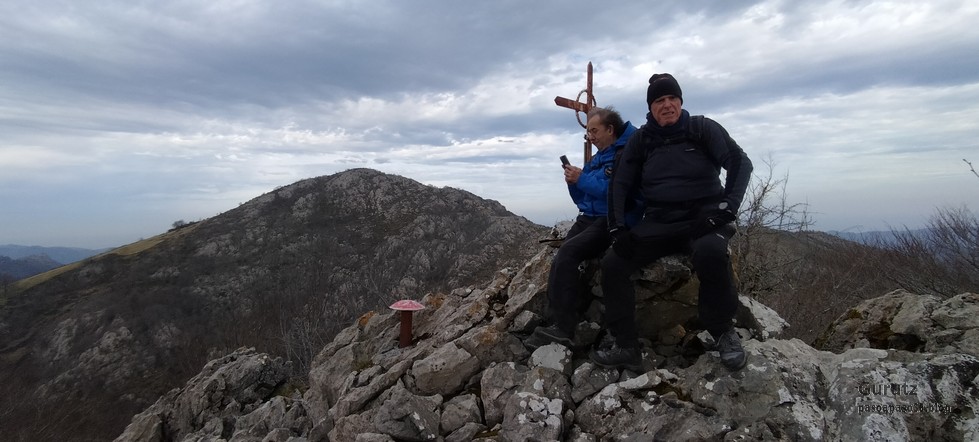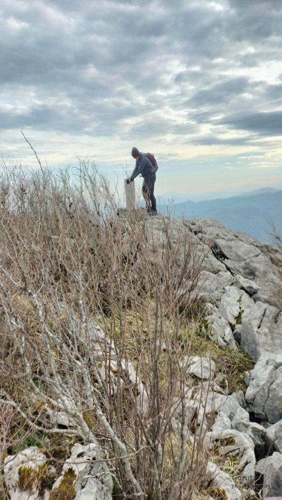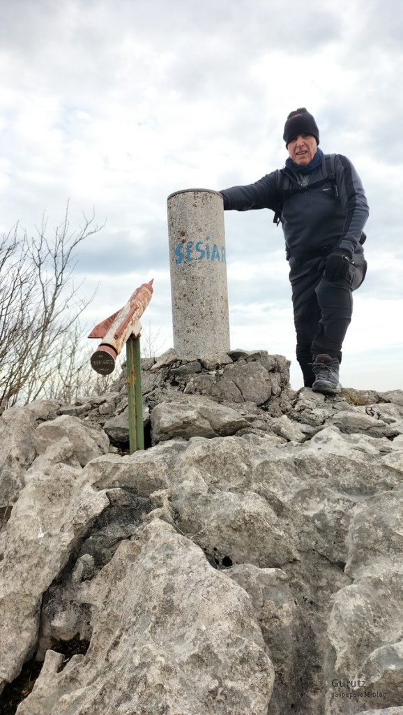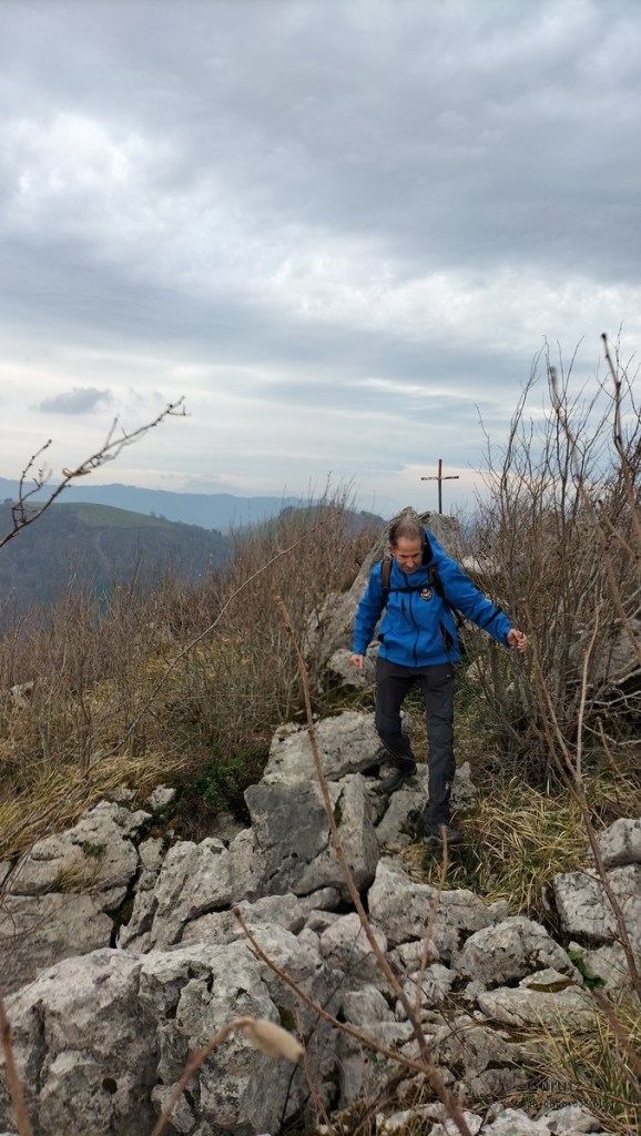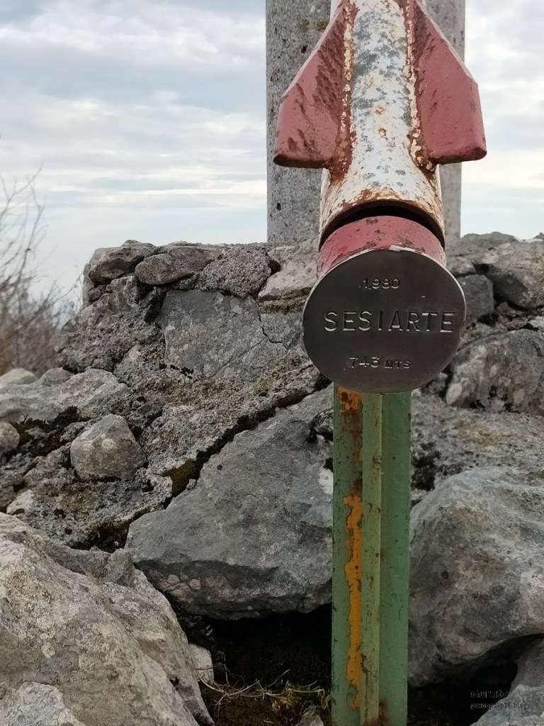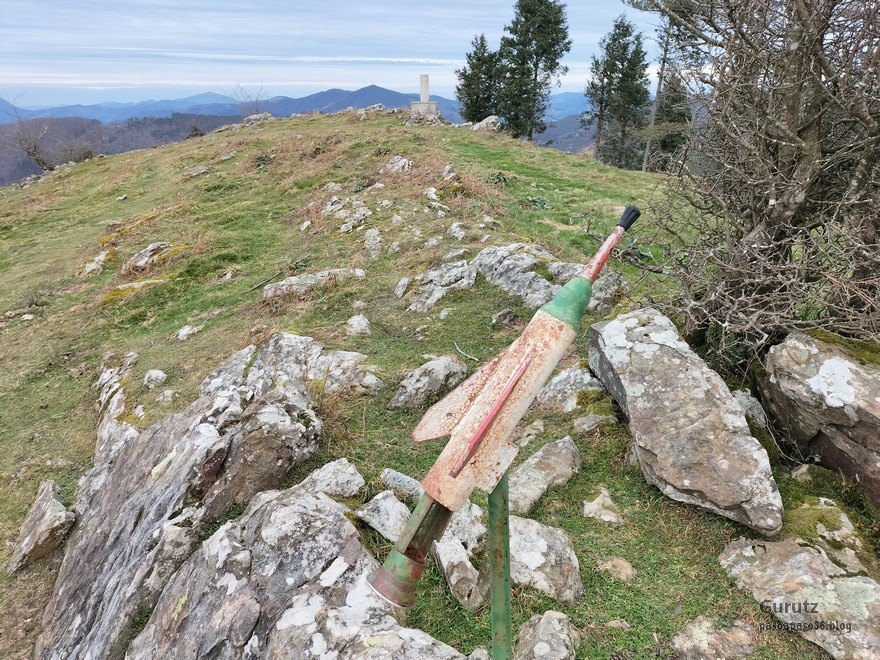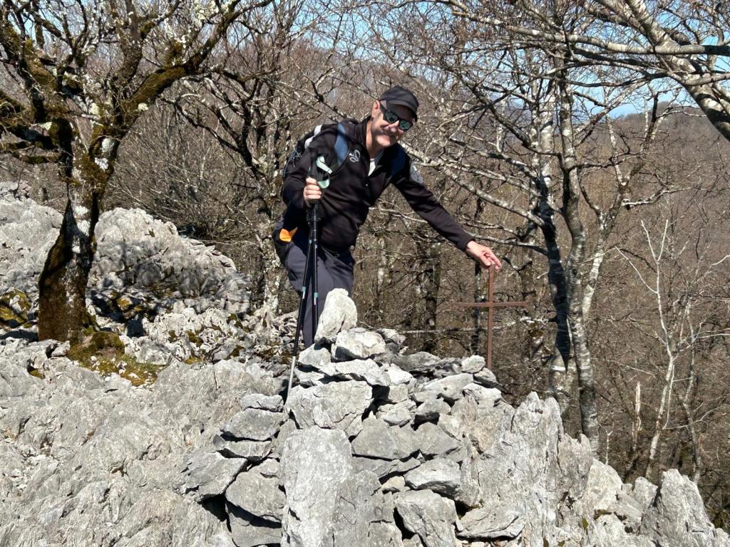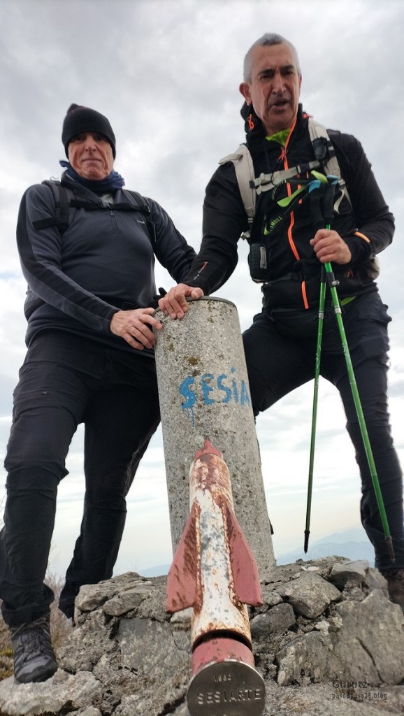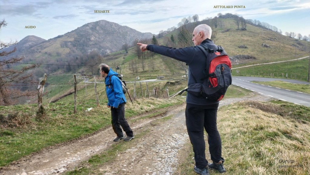 Foto de salida en el aparcamiento de Aittola.Javier y yo Aittolako Gurutzea.Fede y Javier.Bajando de Aittolako Gurutzea ya vemos los siguientes objetivos del día. Fede señalando hacia Otarre.Vamos subiendo hacia Sesiarte.Aquí la cosa se complica con el lapiaz, hay que ir sorteando las piedras y buscando el paso por la hierba.Fede llegando a Sesiarte, tiene que ir agachado porque, si no, el viento le tira. Aquí ya no hay hierba, es todo rocoso y hay que mirar bien donde se pisa, con la dificultad añadida del viento que nos ha zarandeado de lo lindo.Fede agarrándose al vértice geodésico para que el viento no le tire.Sorteando las rocas del lapiaz viene Javier, quien se ha tenido que quitar las gafas para evitar que se las lleve el viento. Fede en la cima de Sesiarte.Fede y yo agarrándonos al vértice tratando de resistir el viento.