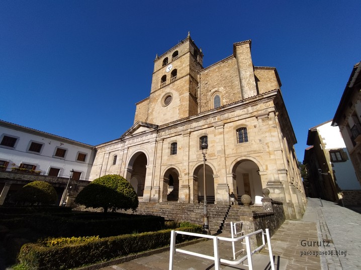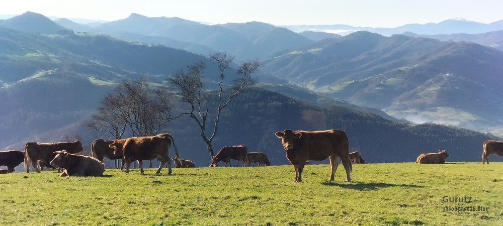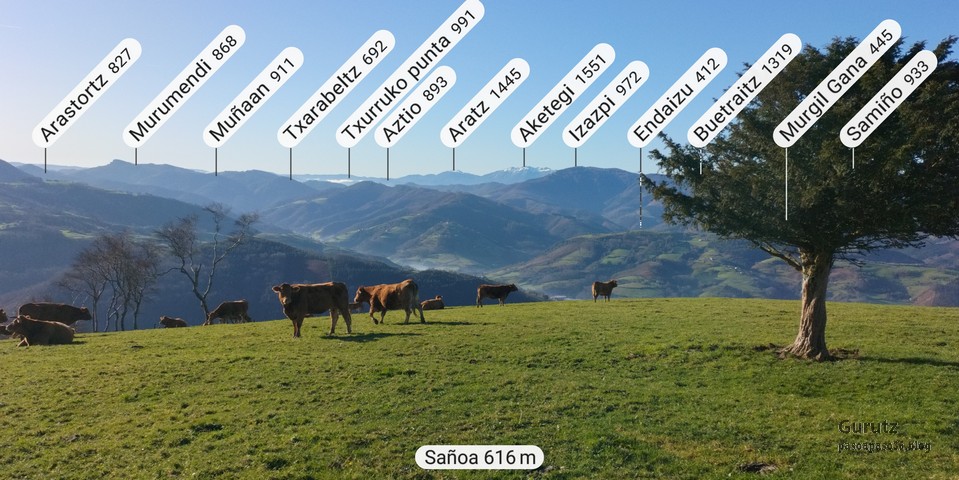 Foto de grupo en el paso elevado sobre el Museo del Ferrocarril de Azpeitia.Hay niebla pero a medida que ascendemos se va disipando.La pendiente es muy pronunciada pero nos nos importa, nos vemos con fuerza.Por lo menos no hay barro.En un momento salimos de la niebla y vemos que esta se queda en el valle. Podemos apreciar los montes Samiño (derecha) e Izazpi.Aparece la gran mole del macizo de Izarraitz que, a partir de ahora, presidirá todo nuestro recorrido.Admirando las vistas.Estos a lo suyo; nos vigilan cuando pasamos, por si acaso.Aquí podemos ver algunos montes que subimos el año pasado.Parece que la niebla se disipa también el el valle, y ya podemos ver la monumental plaza de toros de Azpeitia.La cruz no está en la cima; hay que seguir subiendo.Primera cima del día, Arauntza (En algún mapa aparece como Arroite)Foto de cumbre (Foto Fernando).Vistas desde Arauntza.Cazador cazado; Se puede apreciar el valle que desde Azpeitia lleva hasta Regil (foto Mikel)Seguimos adelante y poco después esta la cima de Sañoa. En un gran prado, con un solitario tejo, pasta un rebaño de vacas con unas vistas extraordinarias.Las vacas disfrutando de la hierba fresquita. Y estos de charleta.Seguimos adelante y llegamos a la cima de Mugarriluzeko Punta, aunque en la cruz indique Sañu. Aquí también la vista es extraordinaria.Foto de grupo en Mugarriluzeko Punta (Foto Fernando).Una vez hechas las tres cimas del día, comienza una bajada larga y tediosa por terrenos sin arbolado; parece que hace pocos años realizaron una tala y todavía no los han repoblado.Izarraitz sigue ahí, no nos pierde de vista.En un tramo del camino, a lo lejos, vemos la ermita de Santa Engracia (Foto Fede).y seguimos bajando. Es una bajada que nos lleva desde la cota de 600m hasta una altura de menos de 150m sobre el nivel del mar. Je, je, luego tendremos que subir un buen trecho de lo bajado ahora.Después de la larga bajada hemos llegado al valle que forma la regata Otola, con el caserío del mismo nombre (Foto Koldo).Hemos comenzado a remontar la altura perdida y el horizonte se ha abierto mostrándonos los montes de alrededor.Un gran valle, verde, verde.Flores de San José.No hay bares que den menú del día en Zestoa por lo que nos hemos tenido que conformar con comer un par de pinchos cada uno, eso si, de tamaño King Size. Despues de comer y de camino al bus hemos pasado por Foru emparantza con sus bonitos y cuidados edificios (Foto Koldo).En la misma plaza la parroquia de la Natividad (Foto Koldo).