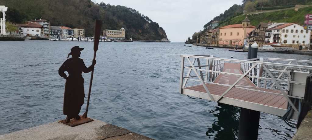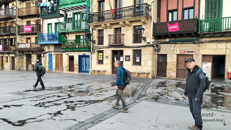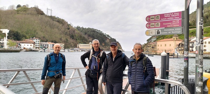 Embarcadero de Pasai Donibane para cruzar en barca a Pasai San Pedro; nosotros hemos venido en autobús. La vista hacia la bocana del puerto, con un distrito de Pasaia a cada lado, es preciosa (Foto Juanjo).Foto de grupo en el embarcadero. De izquierda a derecha Juanjo, Juan Cruz, Fernando y Javier.Cruzando la bella y muy fotografiada plaza de Donibane