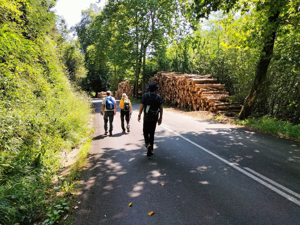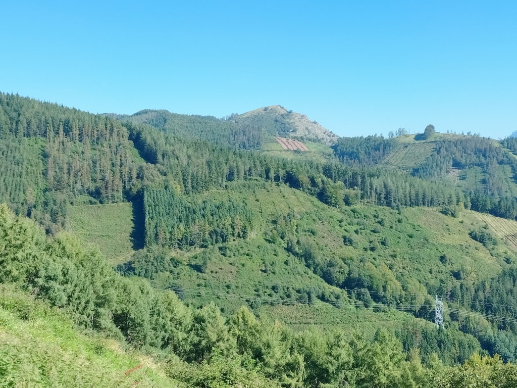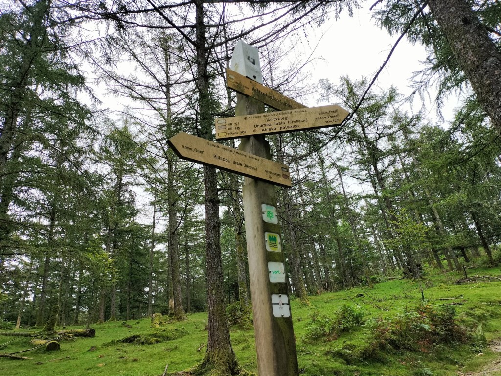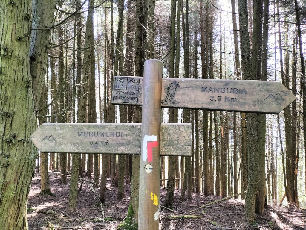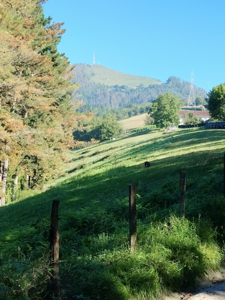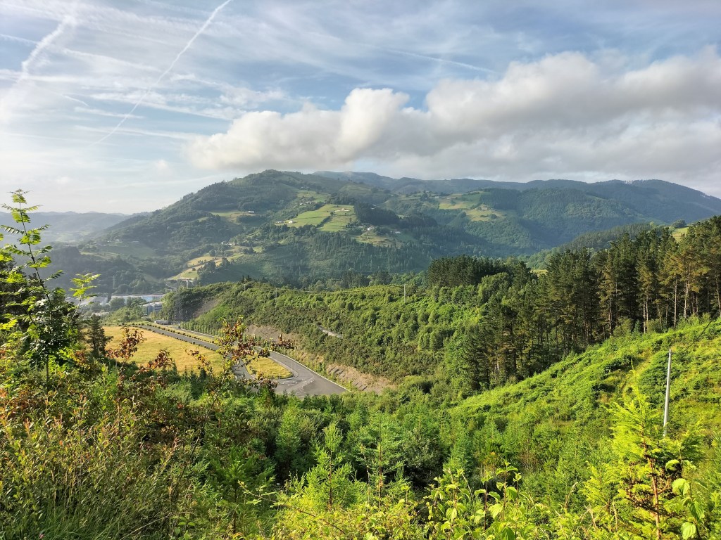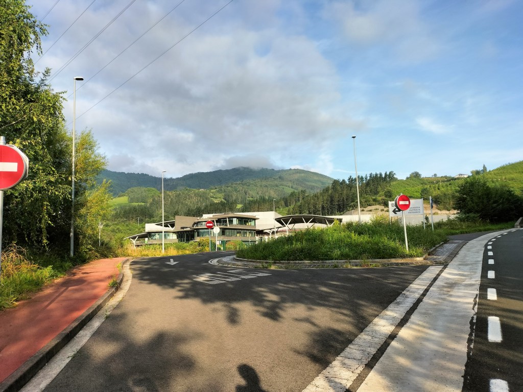 Aparcamos en el aparcamiento del Lidl y enseguida comenzamos a tirar para arriba siguiendo la carretera GI-3173 que va al barrio de Urrategi y más adelante. Son cuatro kilómetros de asfalto pero que a primera hora de la mañana con el fresquito no se hacen pesados. El tiempo bueno para andar, algunas nubes y una temperatura agradable. Es una travesía muy completa ya que atravesaremos bosques de pinos, hayas, eucaliptos y praderas.