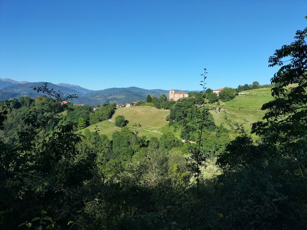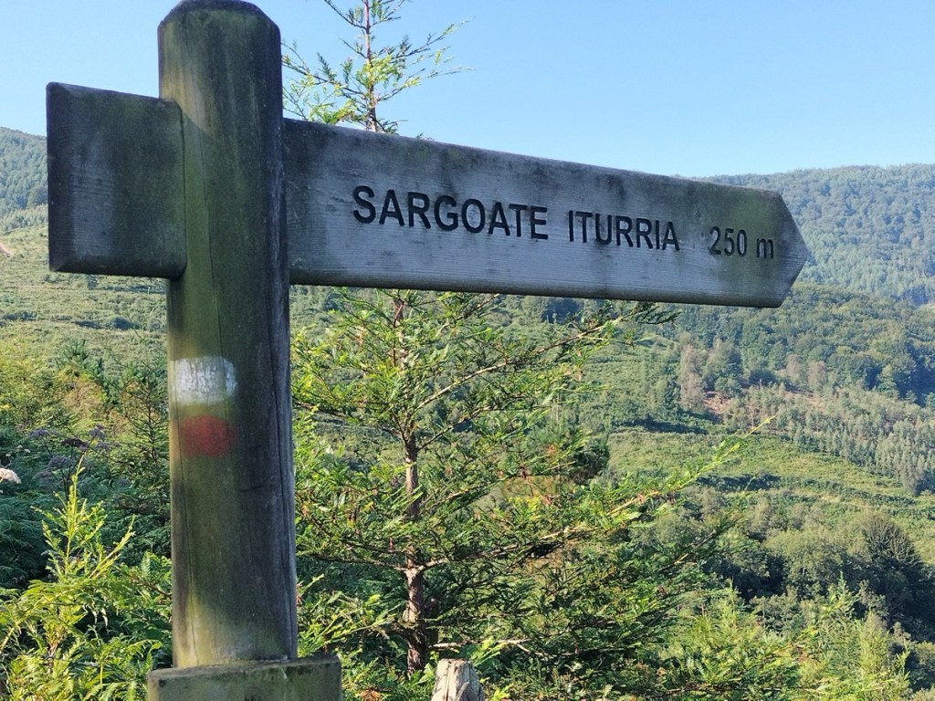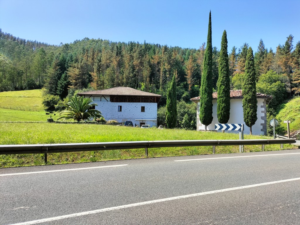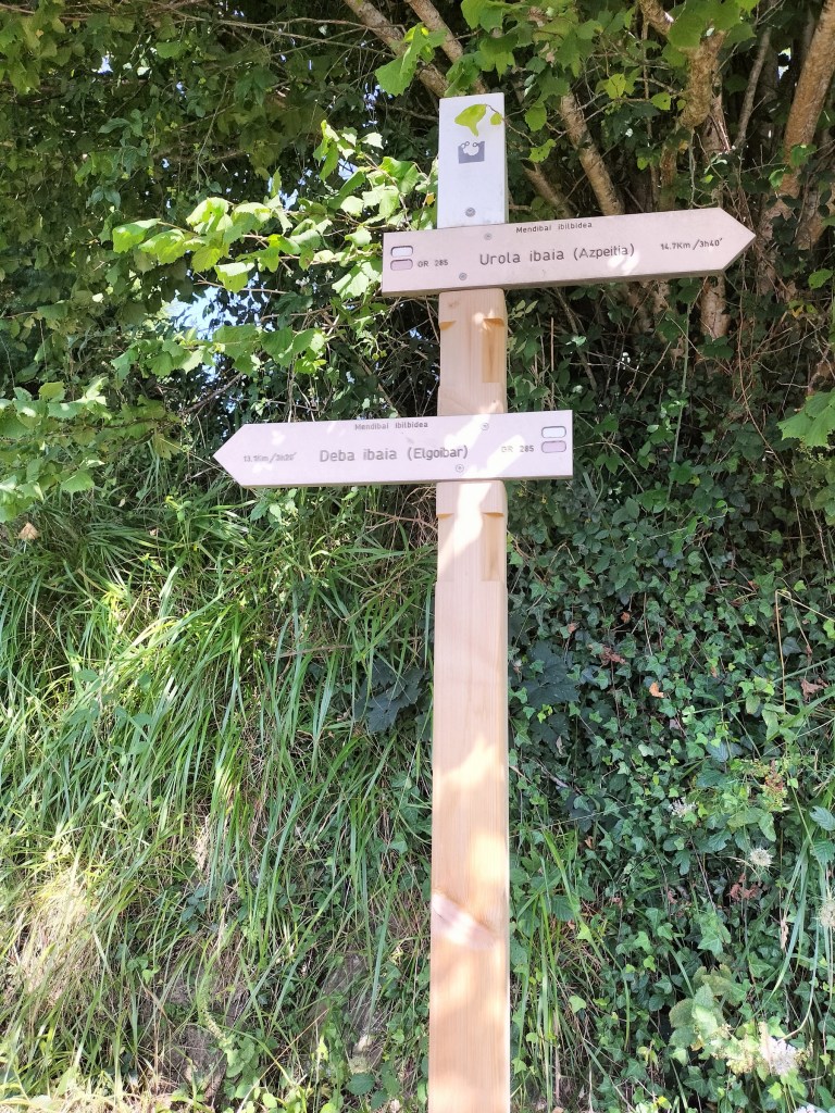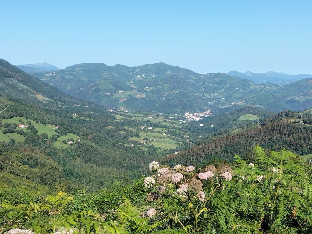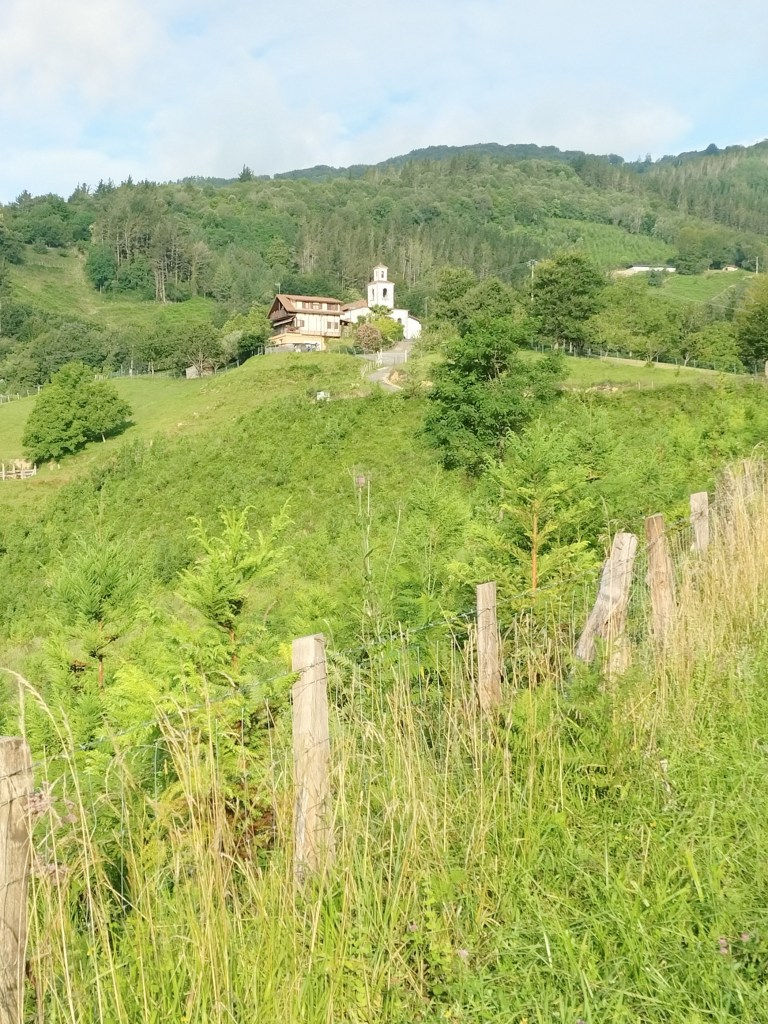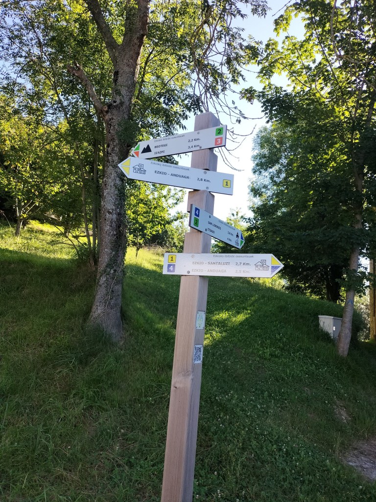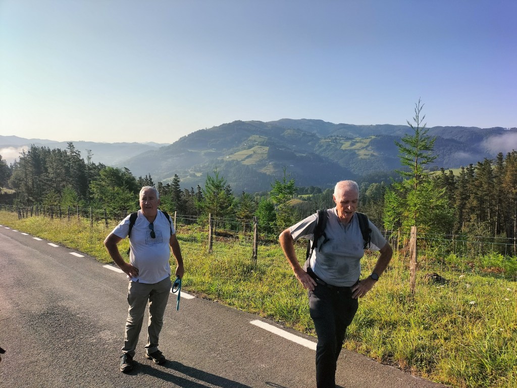 Aparcamos en el aparcamiento del Lidl y enseguida comenzamos a tirar para arriba siguiendo la carretera GI-3173 que va al barrio de Urrategi y más adelante. Son cuatro kilómetros de asfalto pero que a primera hora de la mañana con el fresquito no se hacen pesados. El tiempo bueno para andar, algunas nubes y una temperatura agradable. Es una travesía muy completa ya que atravesaremos bosques de pinos, hayas, eucaliptos y praderas.
