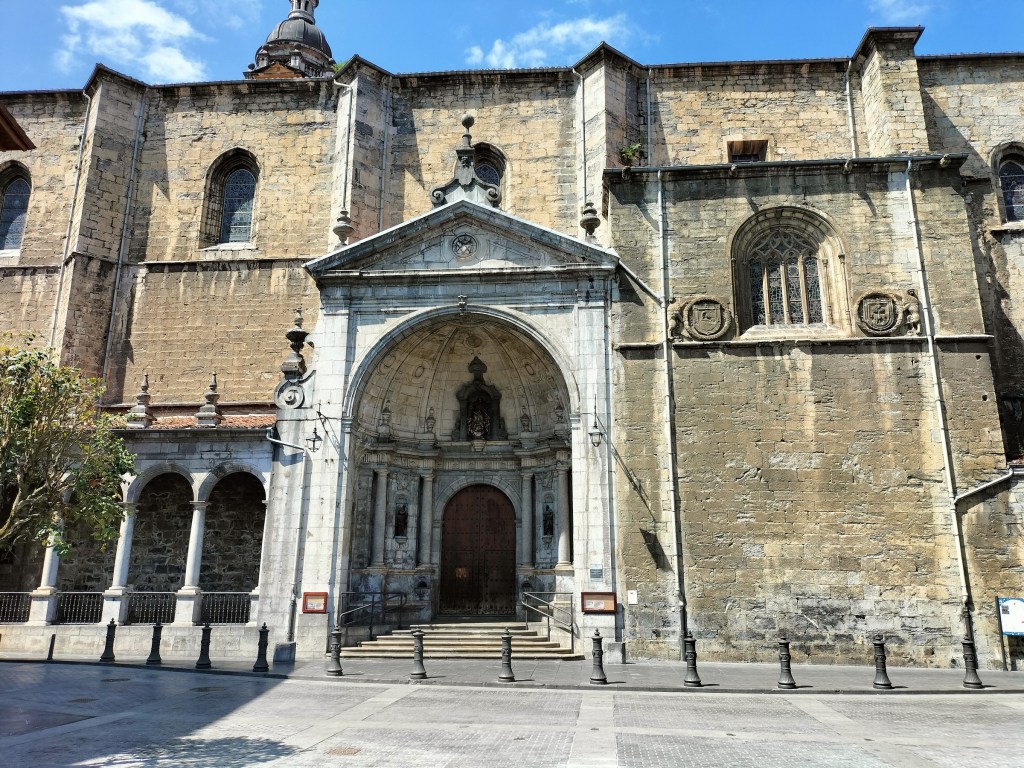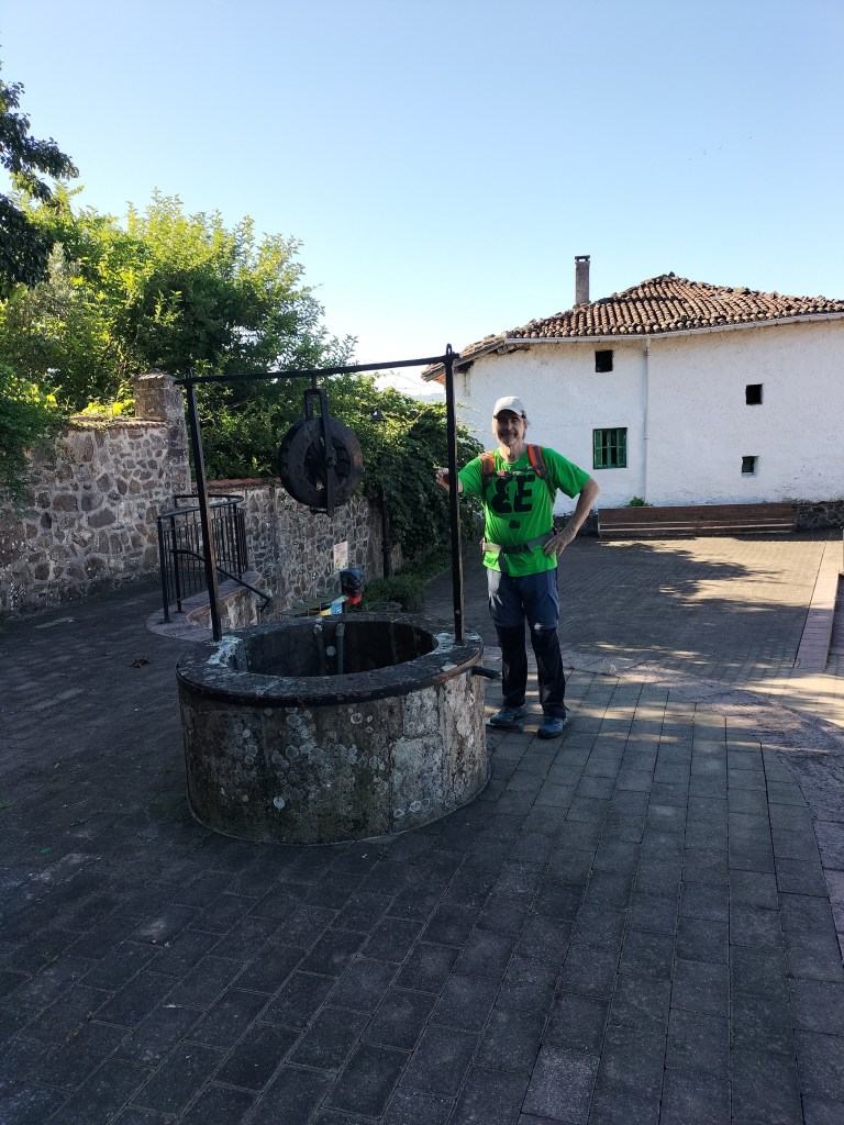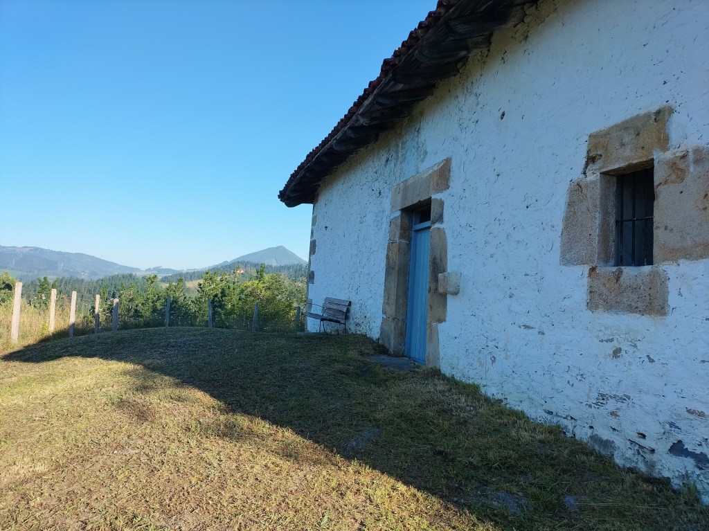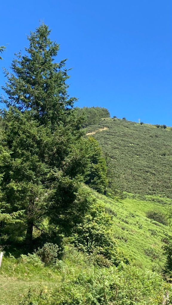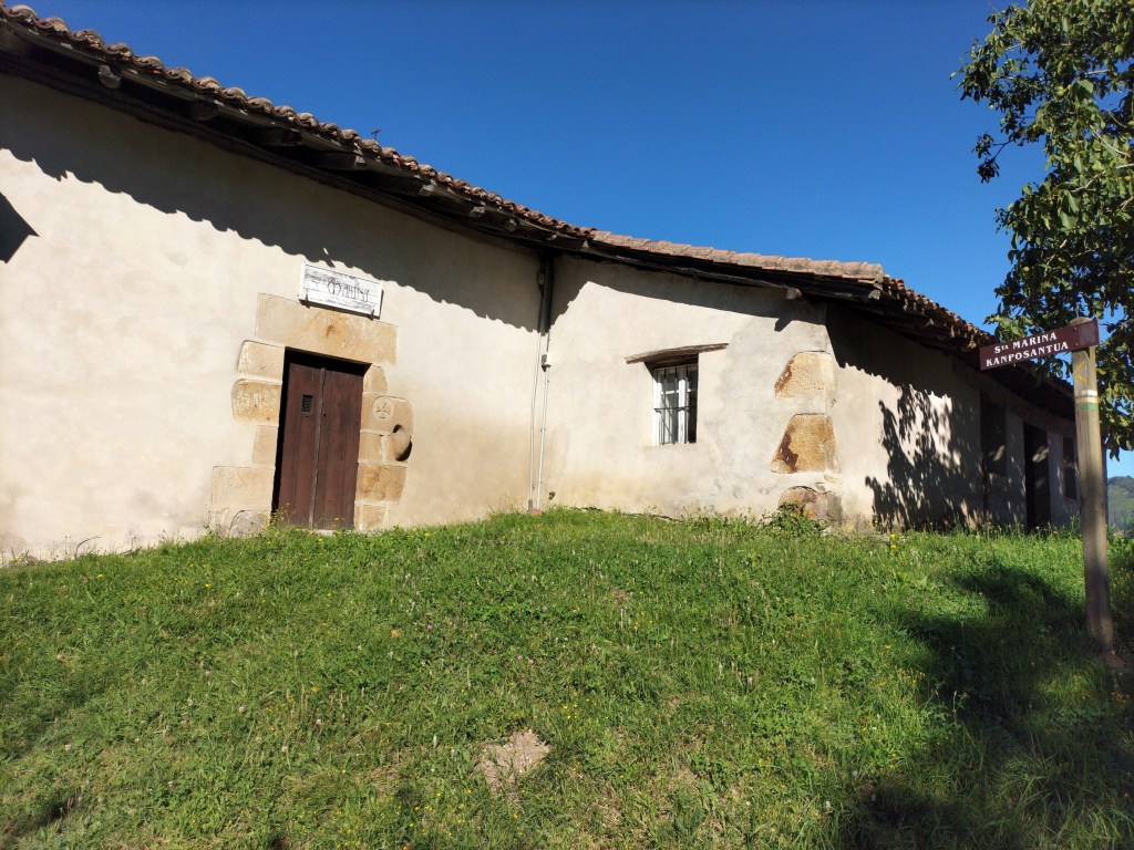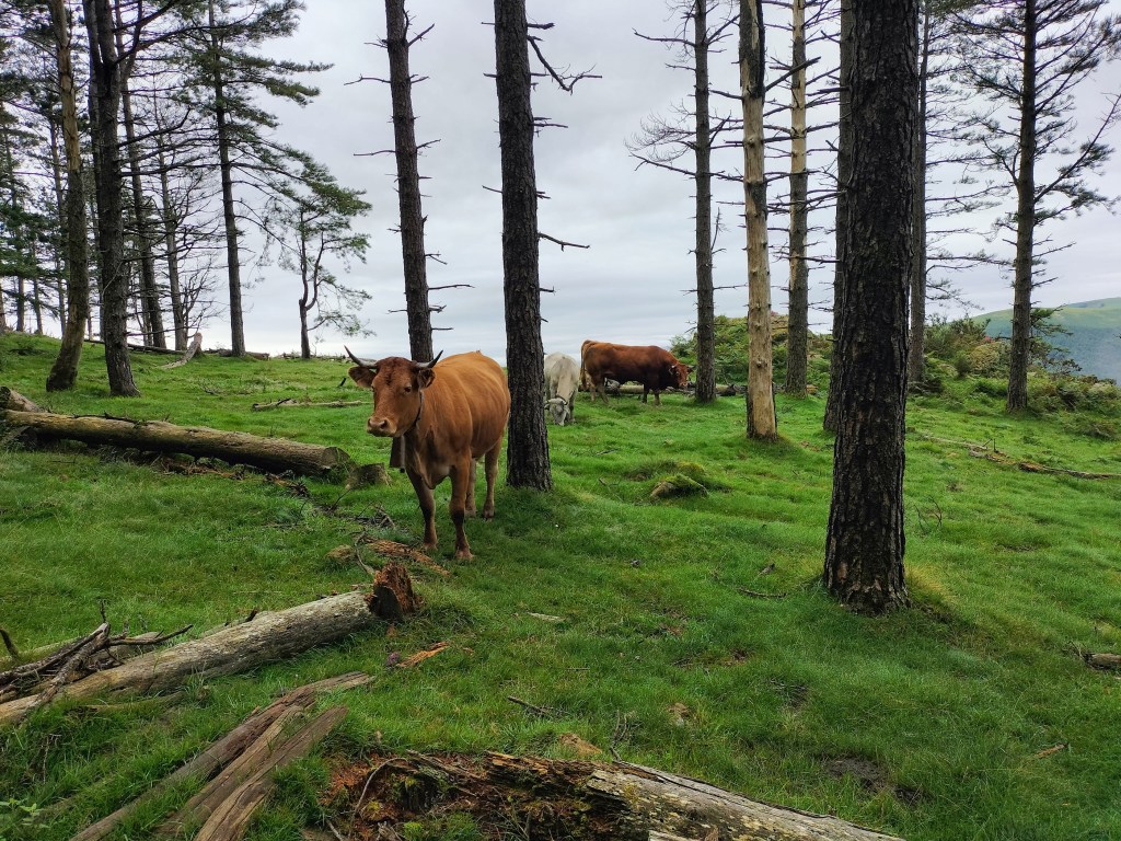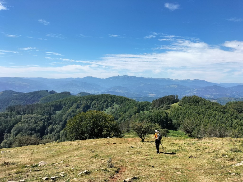 Aparcamos en el aparcamiento del Lidl y enseguida comenzamos a tirar para arriba siguiendo la carretera GI-3173 que va al barrio de Urrategi y más adelante. Son cuatro kilómetros de asfalto pero que a primera hora de la mañana con el fresquito no se hacen pesados. El tiempo bueno para andar, algunas nubes y una temperatura agradable. Es una travesía muy completa ya que atravesaremos bosques de pinos, hayas, eucaliptos y praderas.