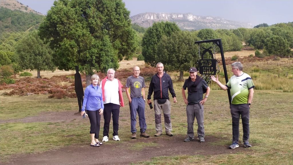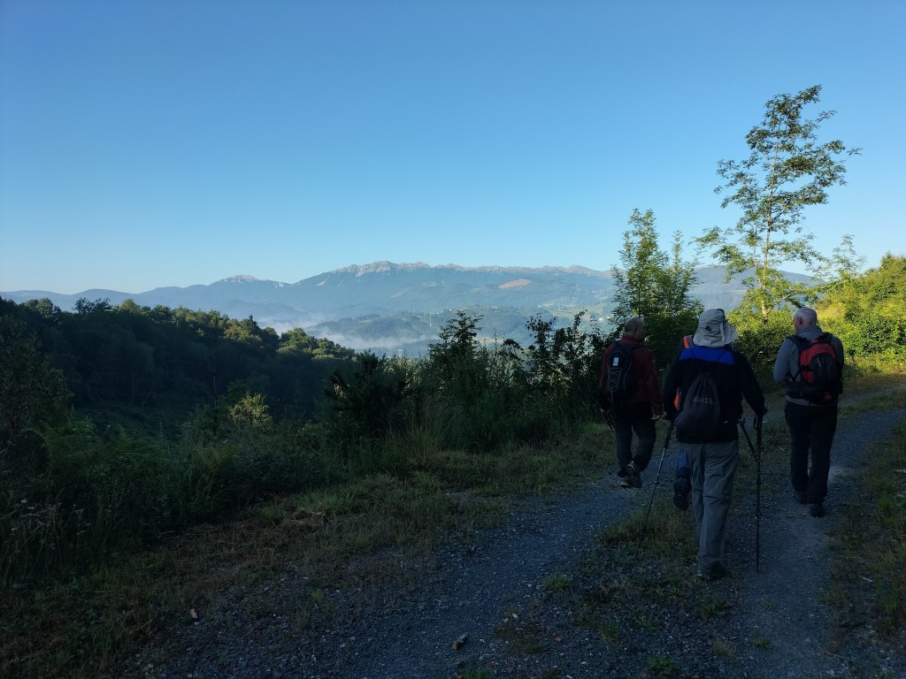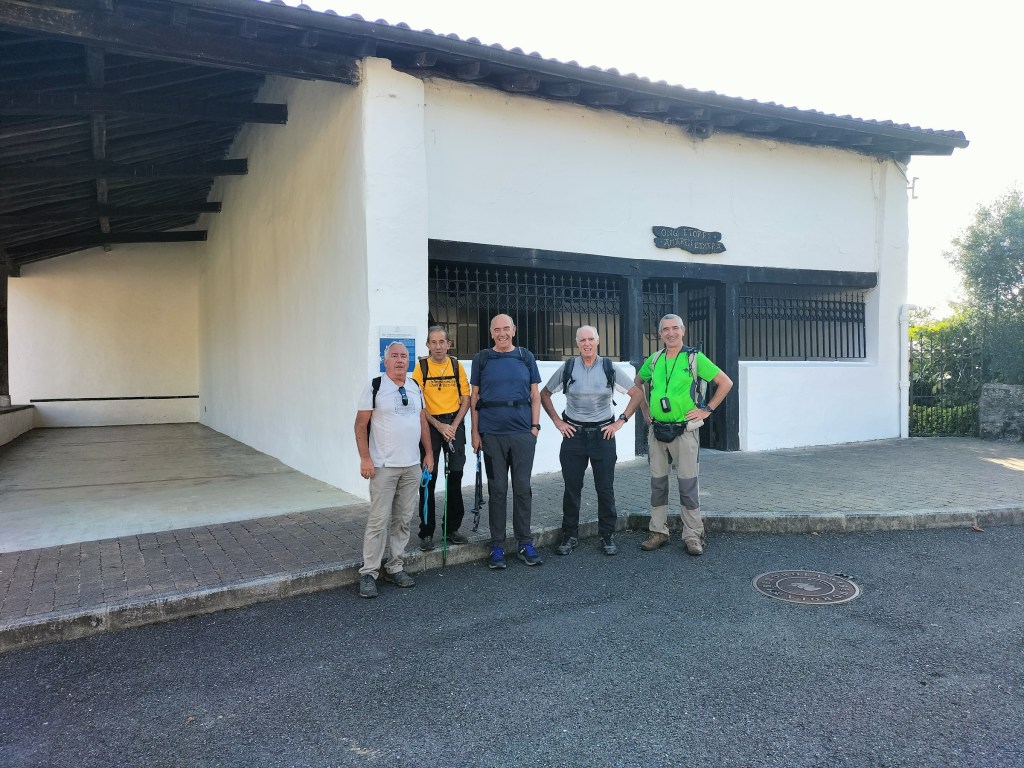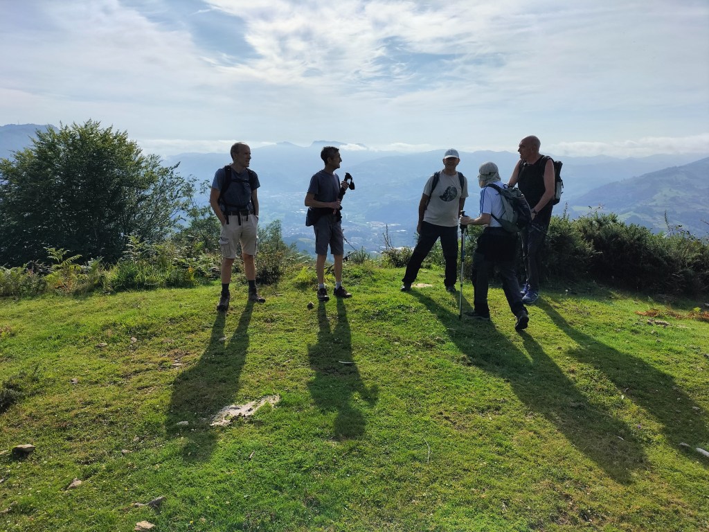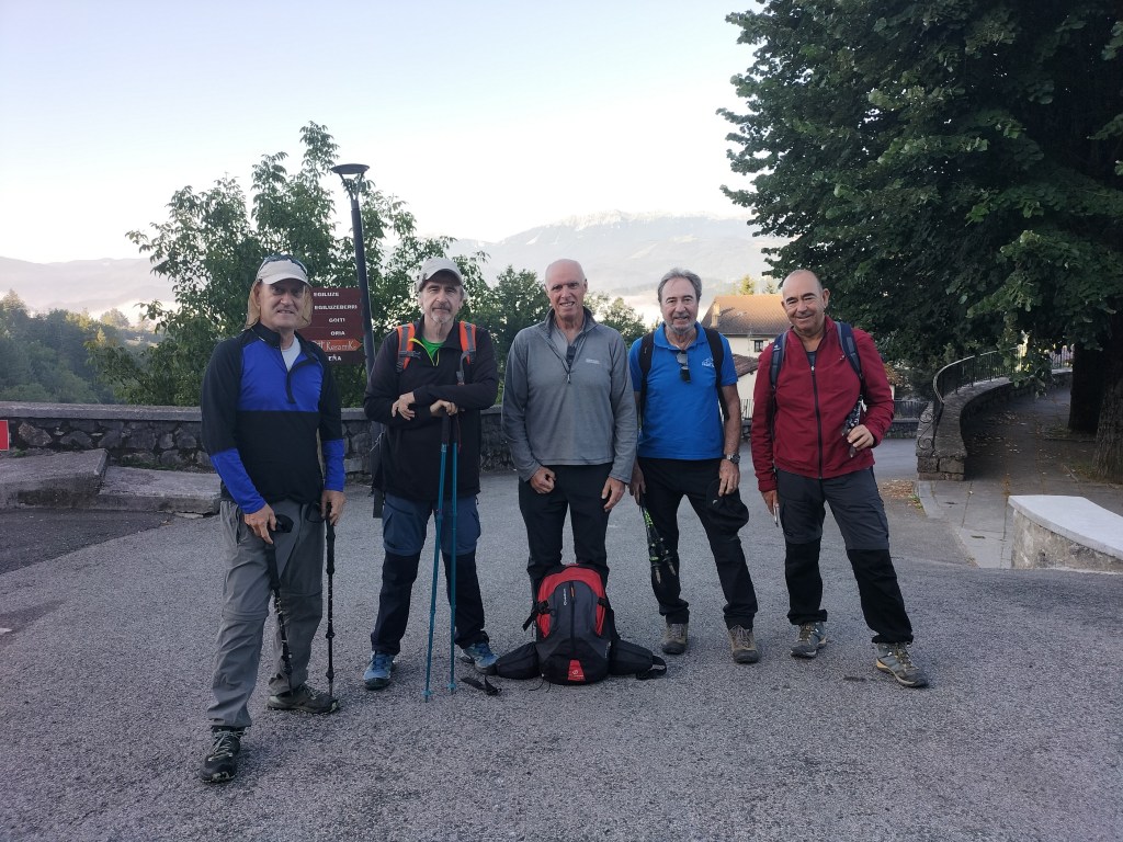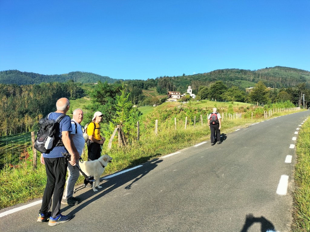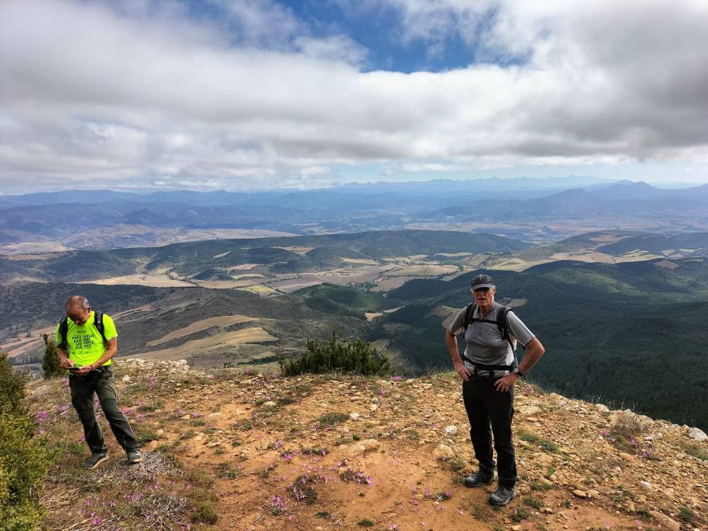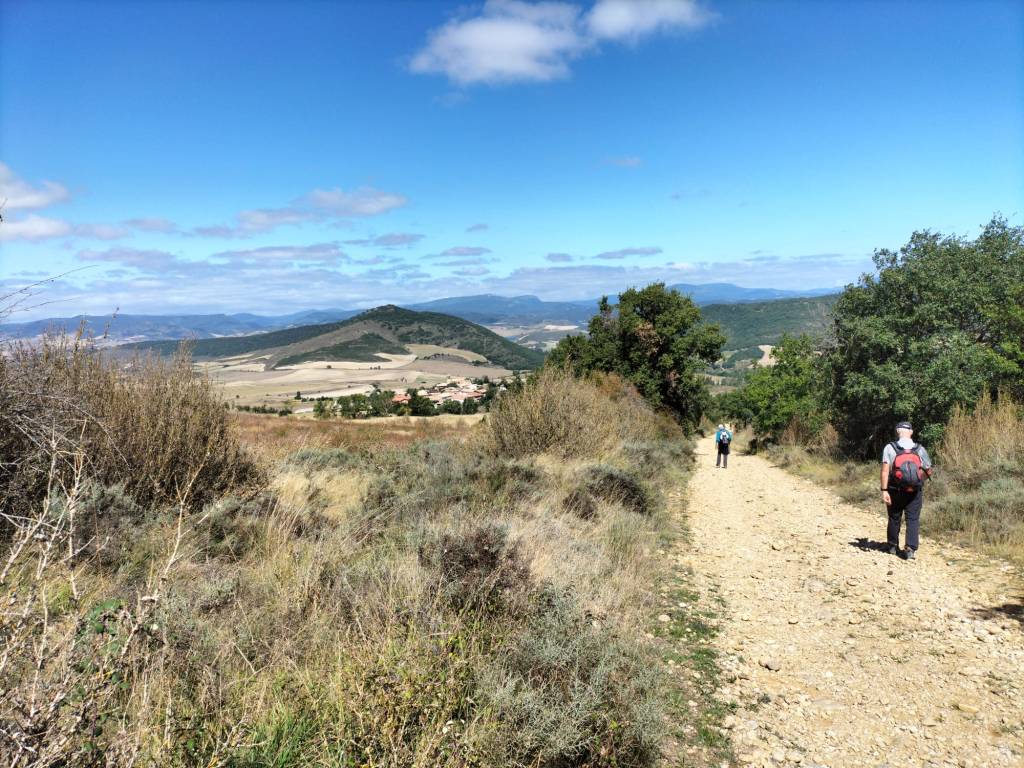 Ruta con un recorrido previsto de 21km y 1.000m de desnivel positivo acumulado. A pesar de que en la subida seguimos un atajo que nos hubiera supuesto recortar el desnivel unos 150m y la distancia en 2,2km, al final, ya en la bajada, nos pasamos un desvío y dimos un gran rodeo, con mucha carretera, que hizo que la etapa fuese de 22,8 km con 820 de desnivel positivo que hicimos en 6:16 horas. Día fresco al principio, agradable para andar, que se convirtió en un mediodía caluroso que nos hizo sudar la gota gorda. Nos juntamos Luis, Javier, Fede, Josean y su mascota Alai, Felipe, y Juan Cruz.