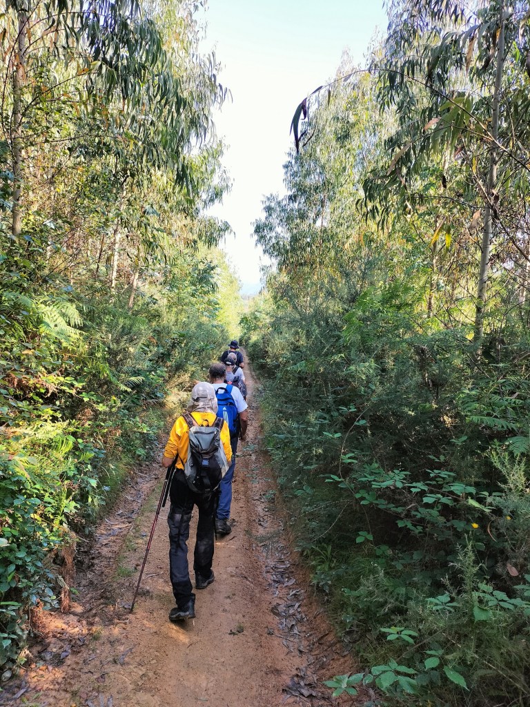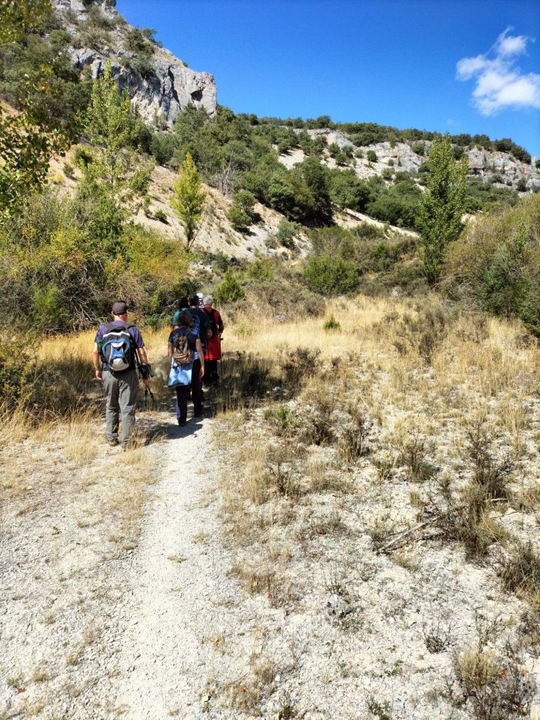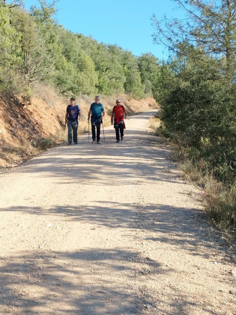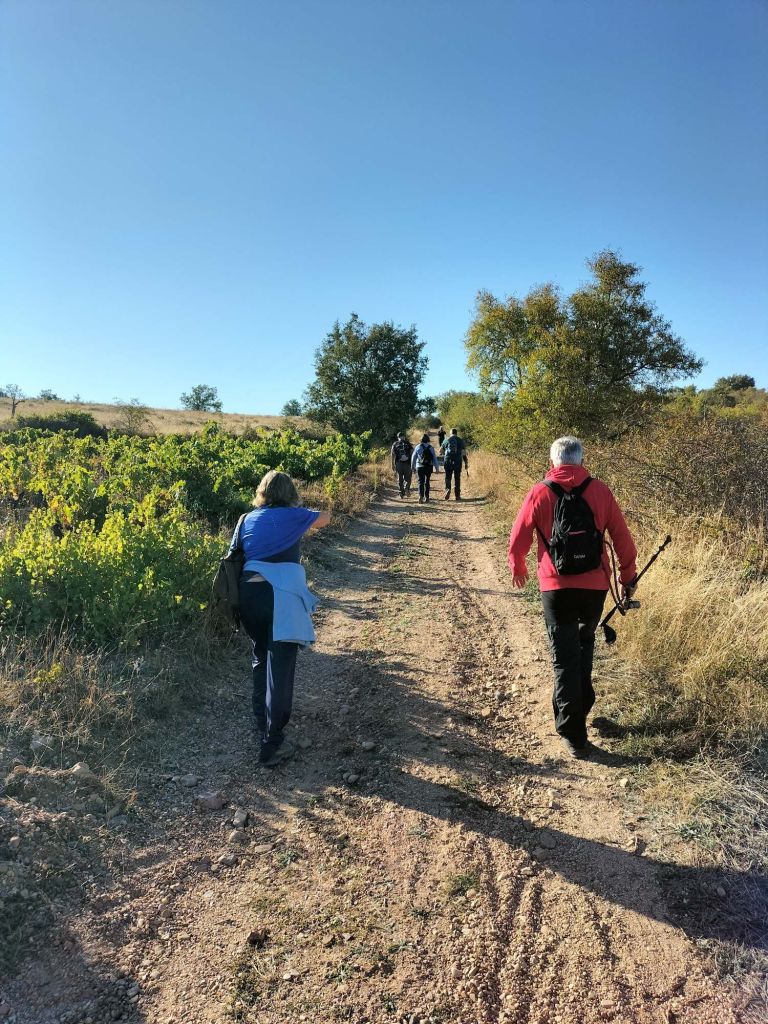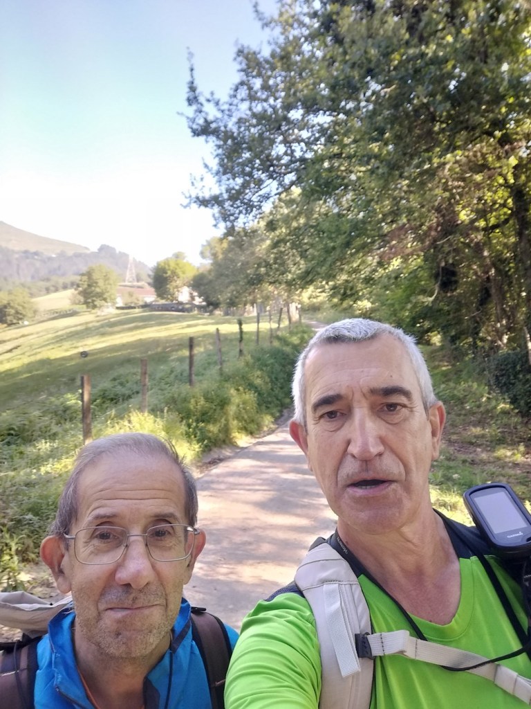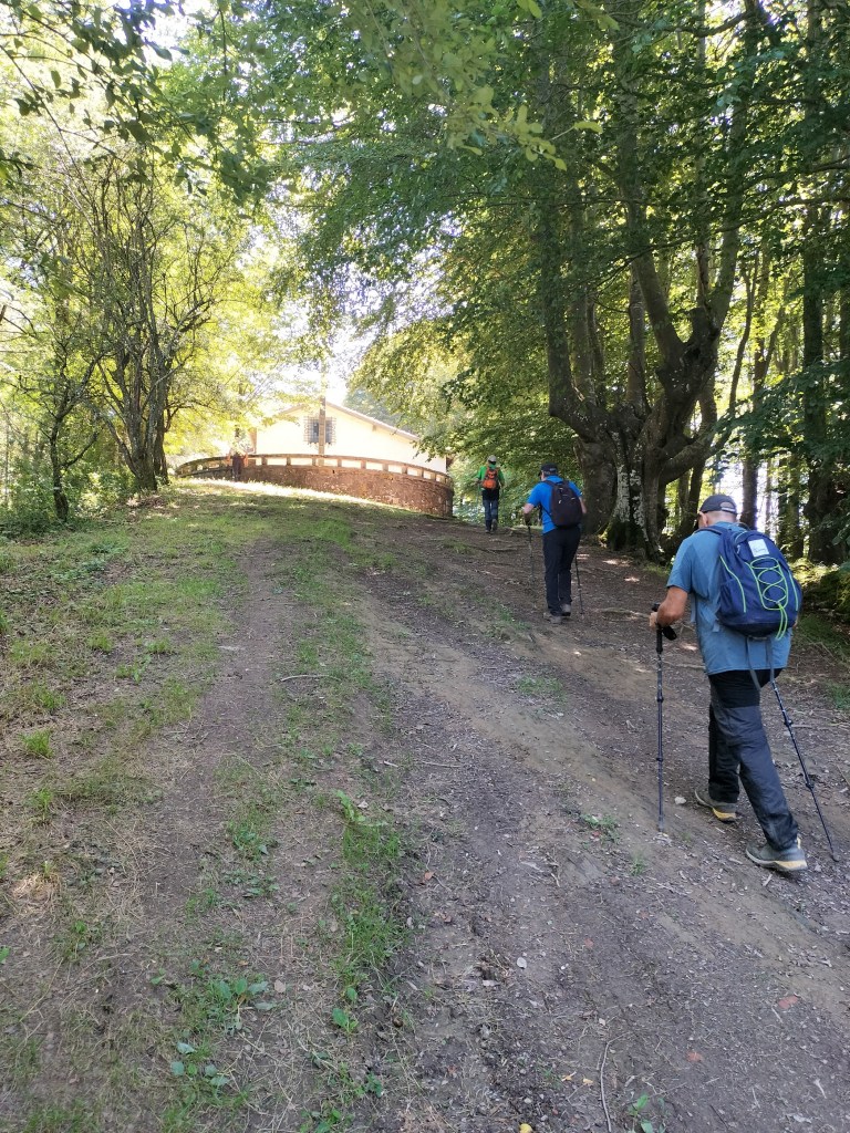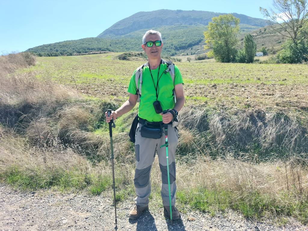 Ruta con un recorrido previsto de 21km y 1.000m de desnivel positivo acumulado. A pesar de que en la subida seguimos un atajo que nos hubiera supuesto recortar el desnivel unos 150m y la distancia en 2,2km, al final, ya en la bajada, nos pasamos un desvío y dimos un gran rodeo, con mucha carretera, que hizo que la etapa fuese de 22,8 km con 820 de desnivel positivo que hicimos en 6:16 horas. Día fresco al principio, agradable para andar, que se convirtió en un mediodía caluroso que nos hizo sudar la gota gorda. Nos juntamos Luis, Javier, Fede, Josean y su mascota Alai, Felipe, y Juan Cruz.