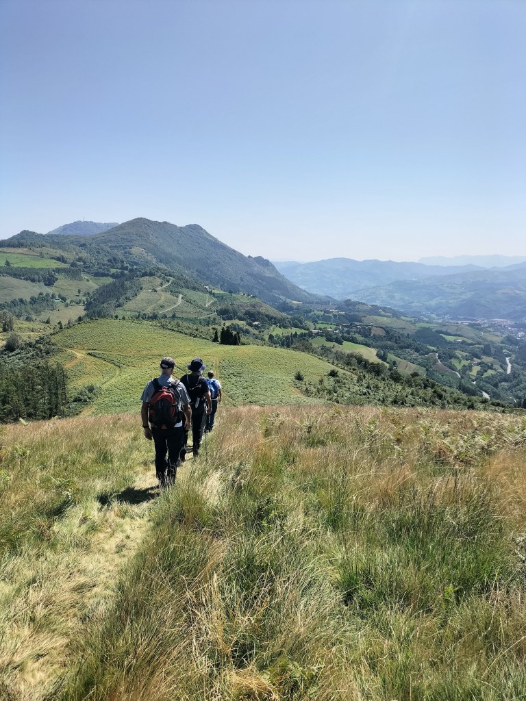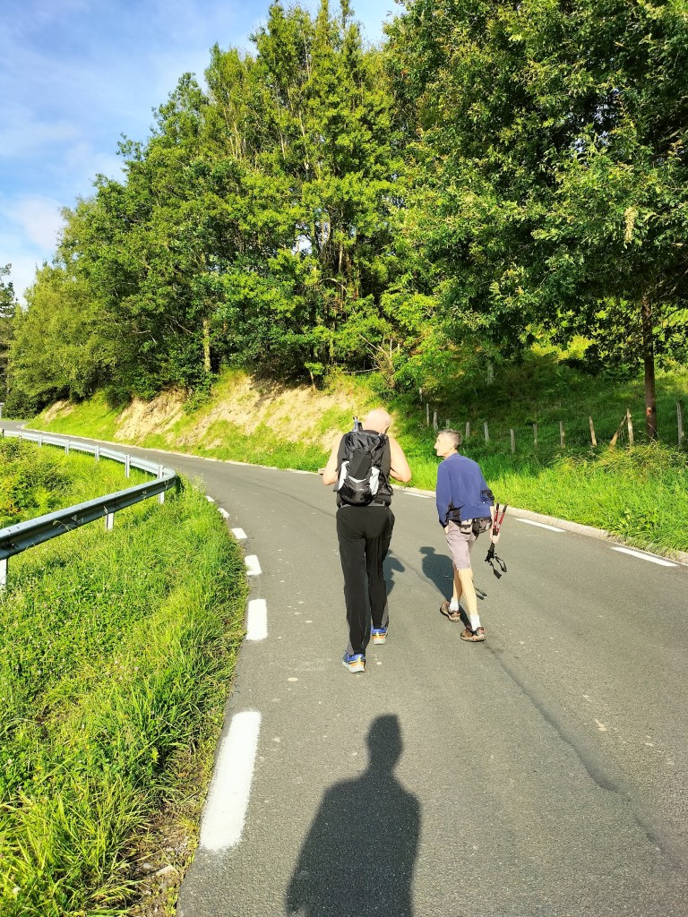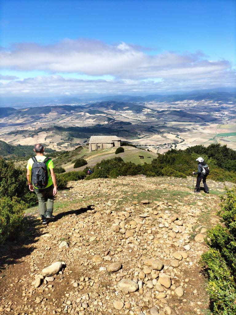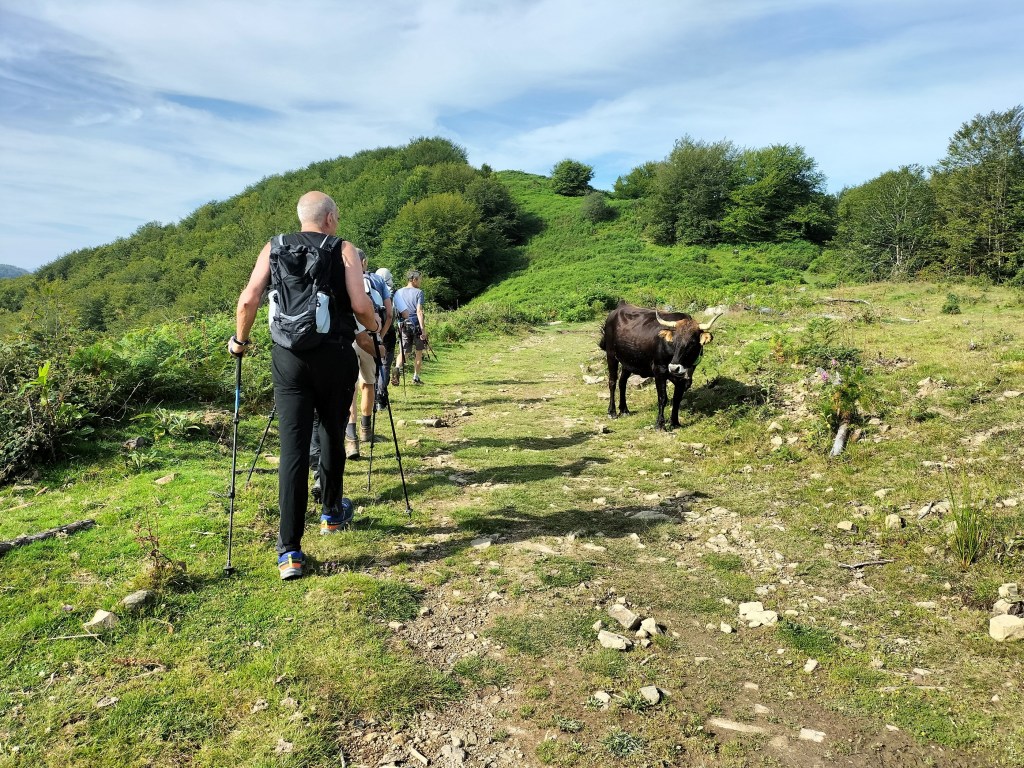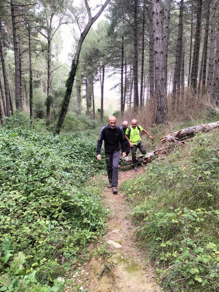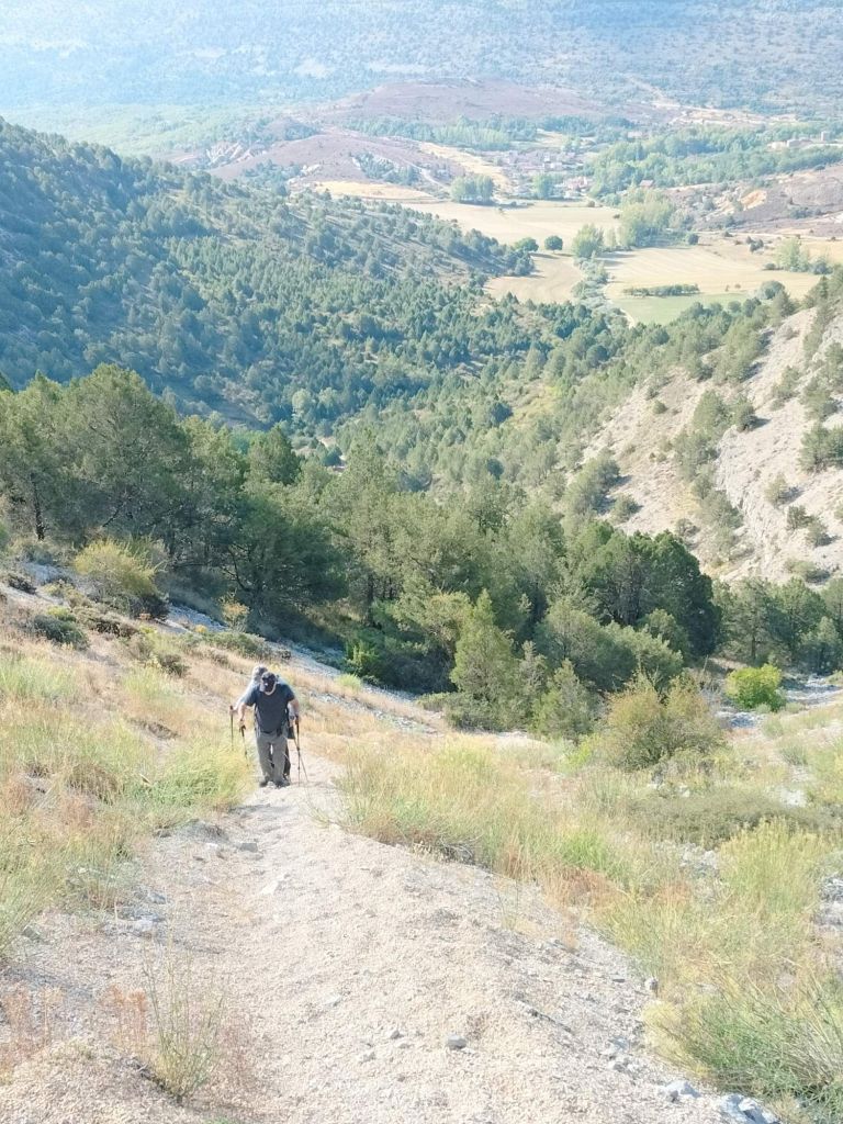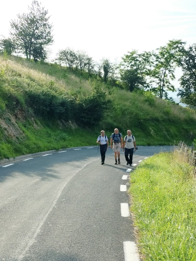Ruta con un recorrido previsto de 21km y 1.000m de desnivel positivo acumulado. A pesar de que en la subida seguimos un atajo que nos hubiera supuesto recortar el desnivel unos 150m y la distancia en 2,2km, al final, ya en la bajada, nos pasamos un desvío y dimos un gran rodeo, con mucha carretera, que hizo que la etapa fuese de 22,8 km con 820 de desnivel positivo que hicimos en 6:16 horas. Día fresco al principio, agradable para andar, que se convirtió en un mediodía caluroso que nos hizo sudar la gota gorda. Nos juntamos Luis, Javier, Fede, Josean y su mascota Alai, Felipe, y Juan Cruz.