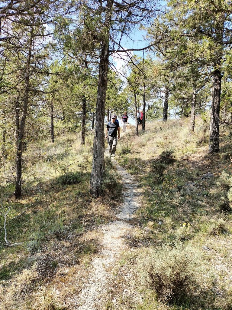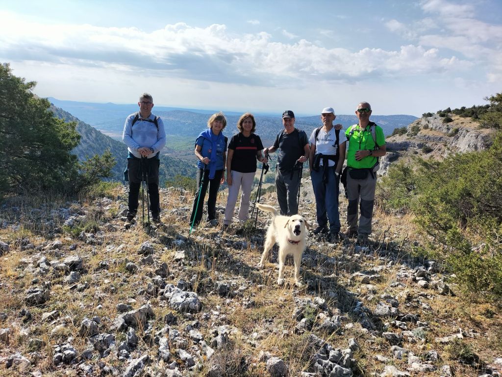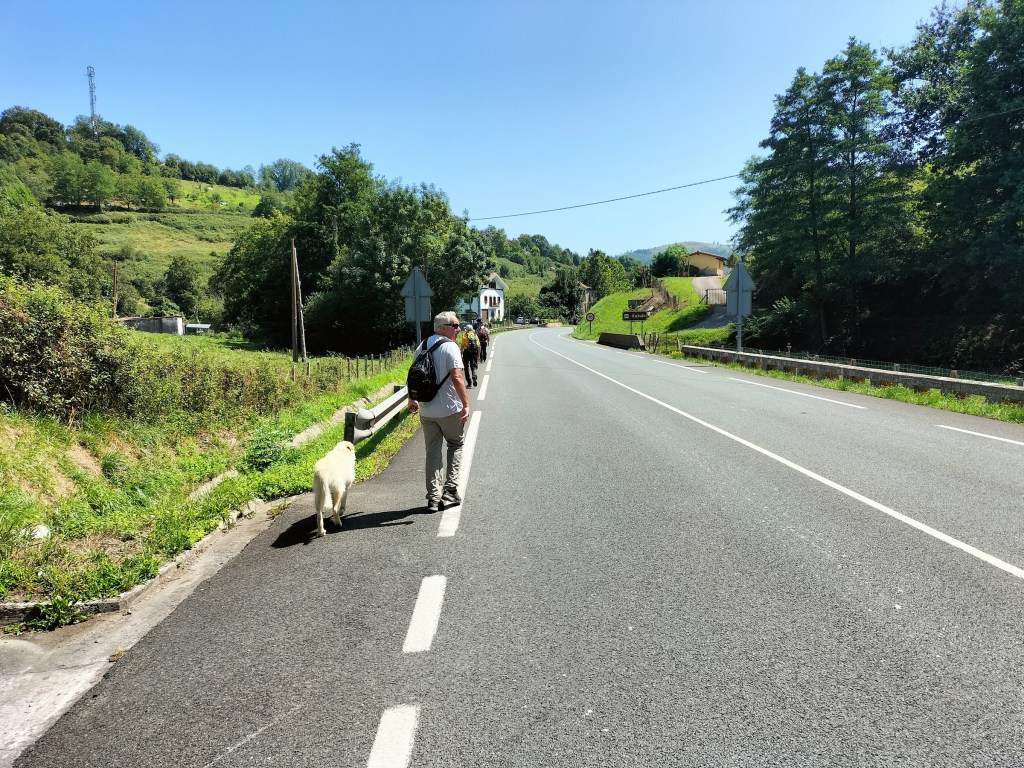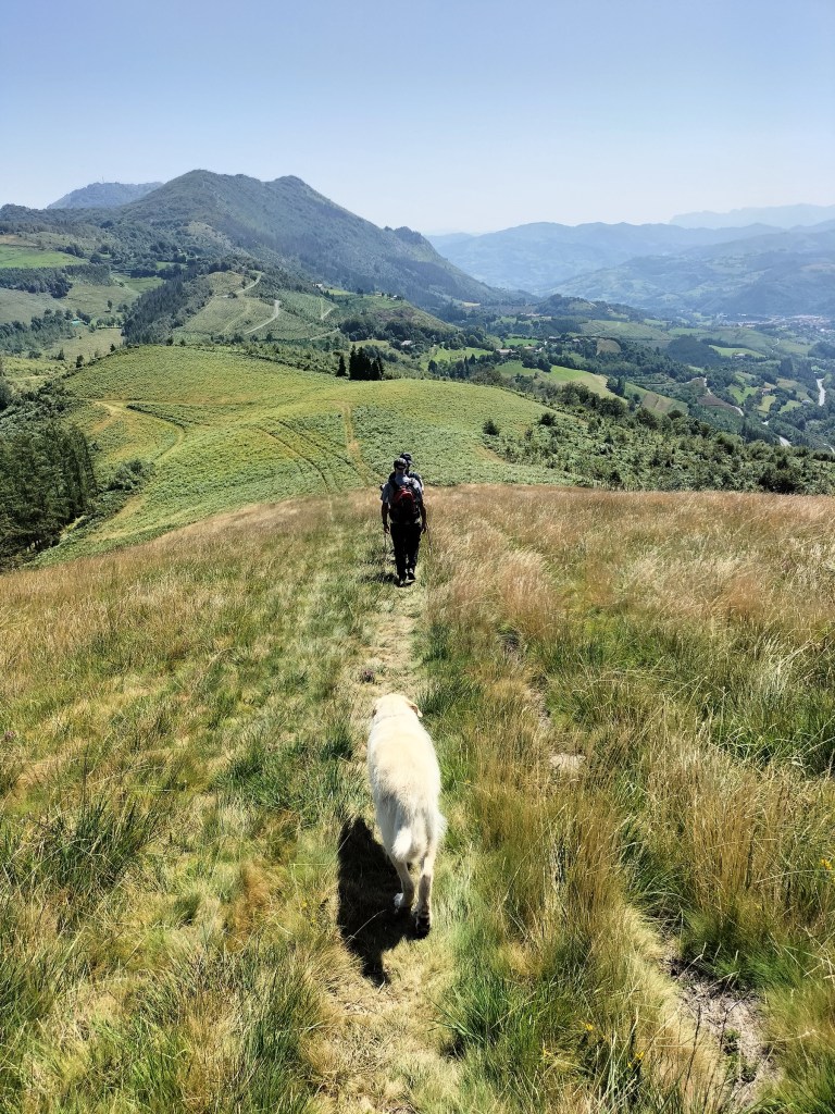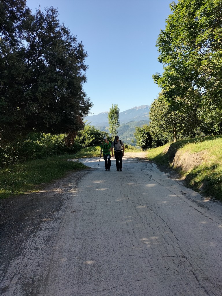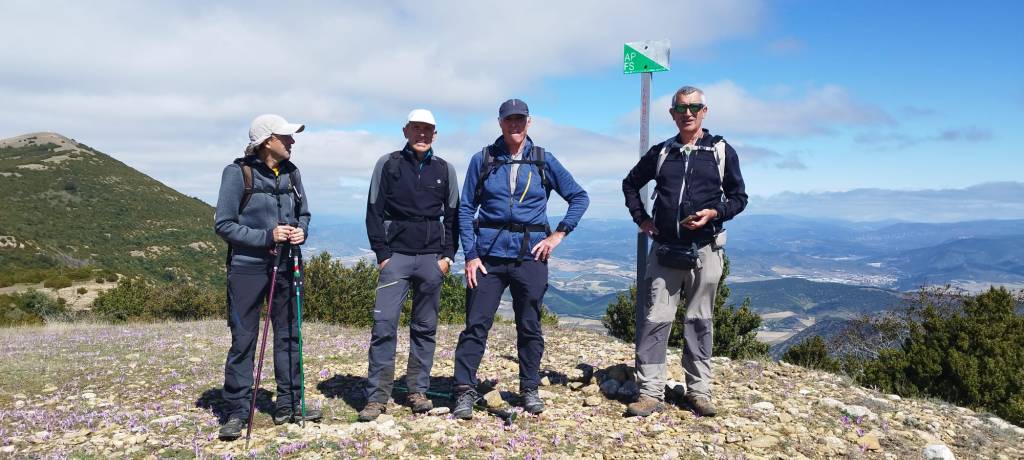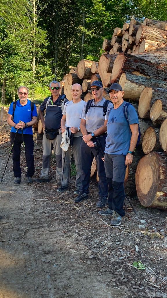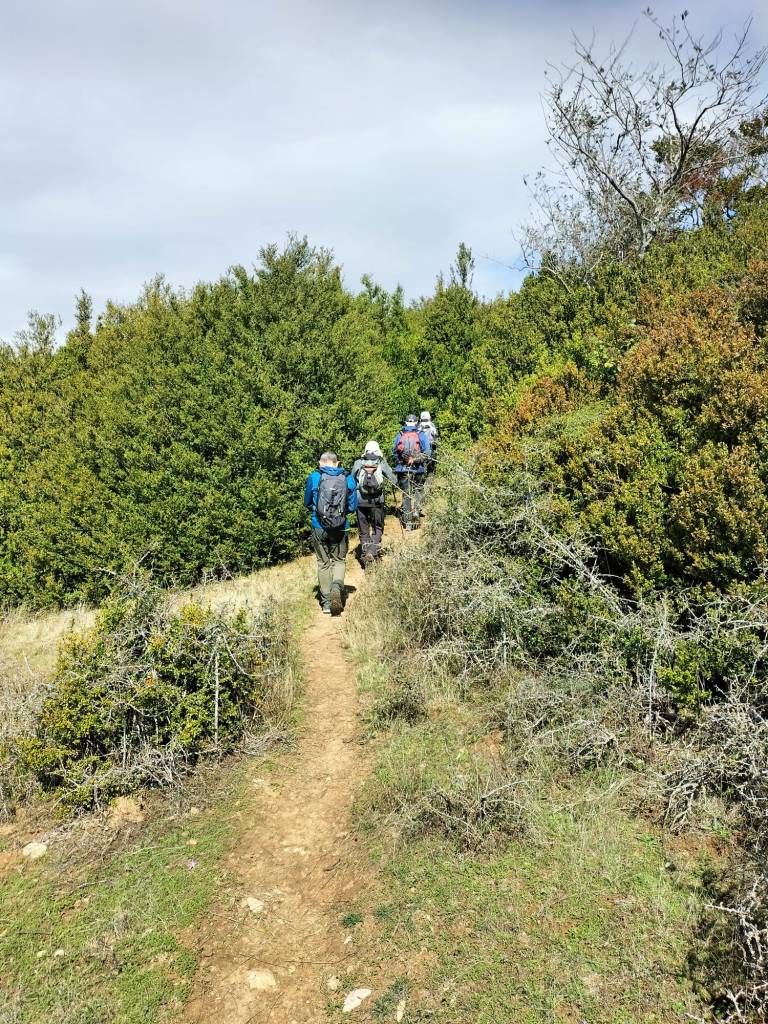 Ruta con un recorrido previsto de 21km y 1.000m de desnivel positivo acumulado. A pesar de que en la subida seguimos un atajo que nos hubiera supuesto recortar el desnivel unos 150m y la distancia en 2,2km, al final, ya en la bajada, nos pasamos un desvío y dimos un gran rodeo, con mucha carretera, que hizo que la etapa fuese de 22,8 km con 820 de desnivel positivo que hicimos en 6:16 horas. Día fresco al principio, agradable para andar, que se convirtió en un mediodía caluroso que nos hizo sudar la gota gorda. Nos juntamos Luis, Javier, Fede, Josean y su mascota Alai, Felipe, y Juan Cruz.