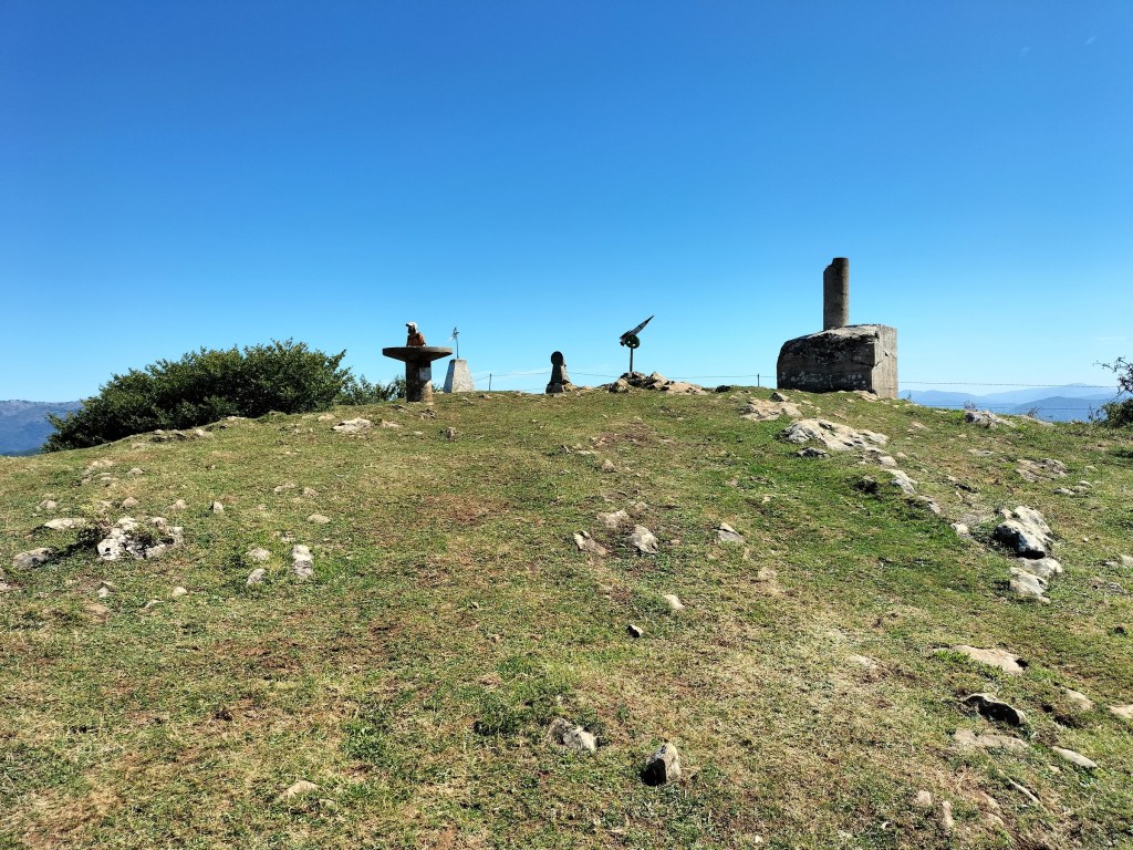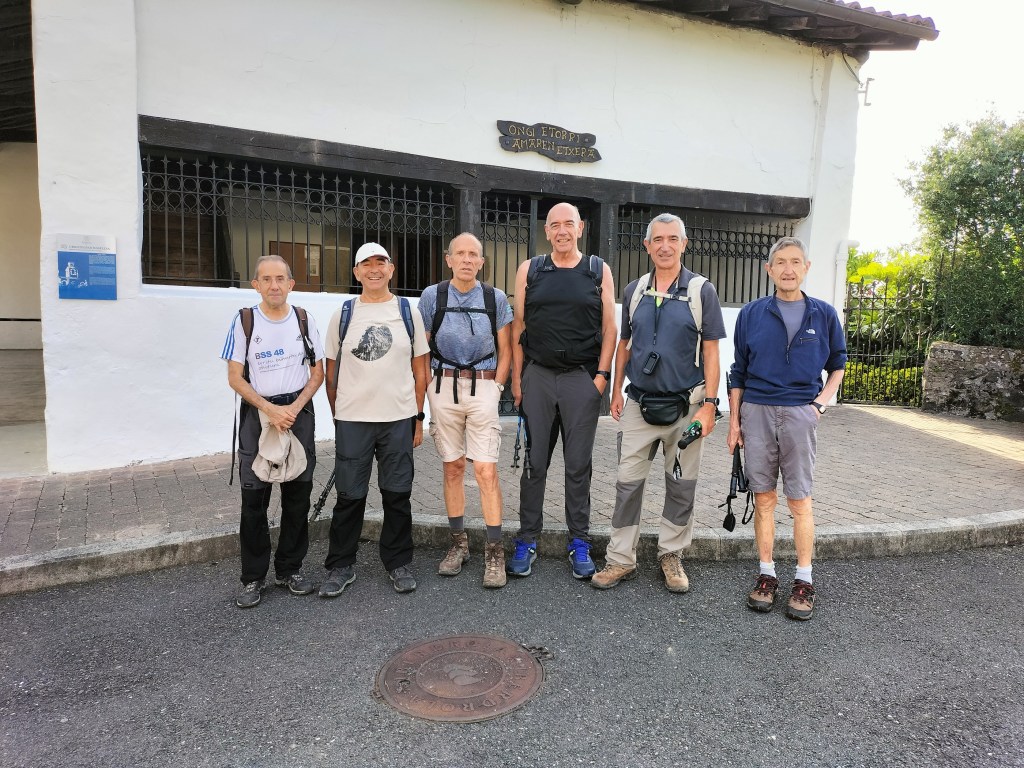 Una gran industria asentada en la zona y al fondo Irukurutzeta con algunas nubes.Vista hacia el otro lado, hacia la zona de Samiño.Vamos por la carretera en animada conversaciónYa vemos el Barrio de Urrategi.Estos de charleta, hablando de temas de herencias; más adelante, como no, se habló de la Real y sus fichajes.Ermita de la virgen de Urrategi.El interior de la ermita, muy txukunaFoto del equipo expedicionario.Al cabo de 4 km desde el inicio se acaba el asfalto y y a la altura del caserío Zabaleta (En construcción) cogemos una pista rodeada de nogales; nos comenta Ladis que los dos últimos años no se han podido coger nueces ya que están atacadas por un gusano que penetra en la nuez y la arruina aunque al árbol en si no le afecte. Algunas rampa de subida duraEstá todo verde, es una gozada andar por aquí.Seguimos por la empinada cuestaTenemos que hacer parada para admirar las vistas y, de paso, coger aireNos cruzamos con algún rebaño de ganado vacuno y aunque en el grupo hay gente de Azpeitia, quienes tienen fama de toreros, rodeamos al animal con precaución. ¿A que estamos? a hacer monte o a torear, pues eso, palante.Ya en la loma cimera nos vamos primero en dirección a Kurutzebakar y en el camino nos encontramos el menhir de ArribiribilletaHan colocado en la zona unas señalizaciones nuevas con información de los megalitos existentes y señalizando la Ruta de los Dólmenes. Aquí el equipo empapándose de sabiduría.Y para que nadie se quede sin saber aquí está el panel explicativo.Seguimos hacía Kurutzebakar, enfrente.Buzón de KurutzebakarY volvemos hacía Irukurutzeta. El cual tiene buzón, vértice geodésico y panel informativo de la Ruta de los Dólmenes y de los montes que se pueden divisar desde la cima.El panel informativoDesde ahí comienza una empinada bajada en la que vamos con cuidado; menos mal que no está mojadoY seguimos visitando monumentos megalíticos, en la foto el dólmen de Kerexetaegía Hegokoa.Pasamos por recientes plantaciones de eucaliptos; parece que en algunas zonas están sustituyendo a los pinos talados por estar afectados por la Banda Marrón.Ya estamos en el objetivo principal del día, Elosumendi. Mirad qué cara de satisfacción tenemos todos.Siguiente cima, Agerreburu, con el buzón cubierto de vegetación. En esta cima hay varias antenas y no tiene vistas.Cruzamos un bosque de hayas cubiertas completamente de musgoy visitamos el dolmen de Agerreburu el cual conserva la tapa y las piedras que la sustentan originales.Una vez ascendidas las cinco cimas del día nos vamos para abajo con la satisfacción de haber cumplido el objetivo. Al fondo hay vistas hacia el Duranguesado, y en la siguiente foto se pueden apreciar las cimas de la zona.Llegamos al Barrio de Elosua del cual una parte pertenece a Bergara y otra a Azkoitia. Aquí vemos la parte frontal de la iglesia.Y aquí la parte trasera desde al lado del cementerio. A partir de aquí nos cuesta encontrar el camino que está muy difuso y difícil de seguir. También atravesamos alguna zona con el camino invadido de zarzas y ortigas que vamos sorteando como podemos.Y por fin, tenemos Aizpurutxo a la vistaYa hemos llegado y podemos admirar el río Urola desde uno de los puentes existentes.
