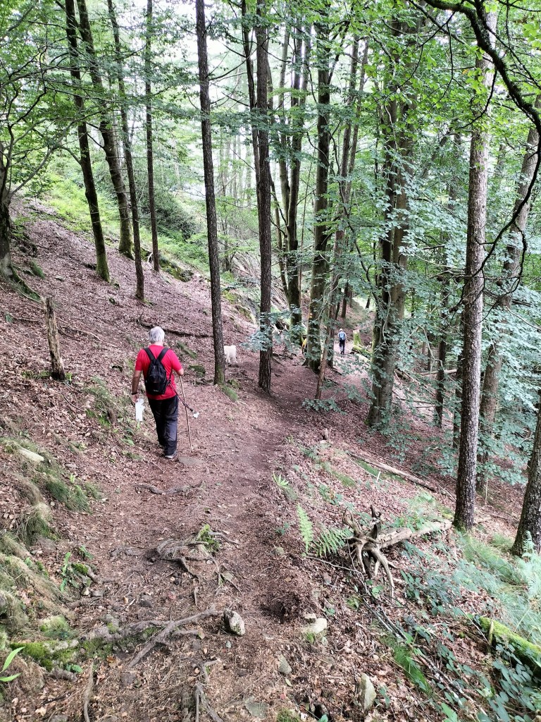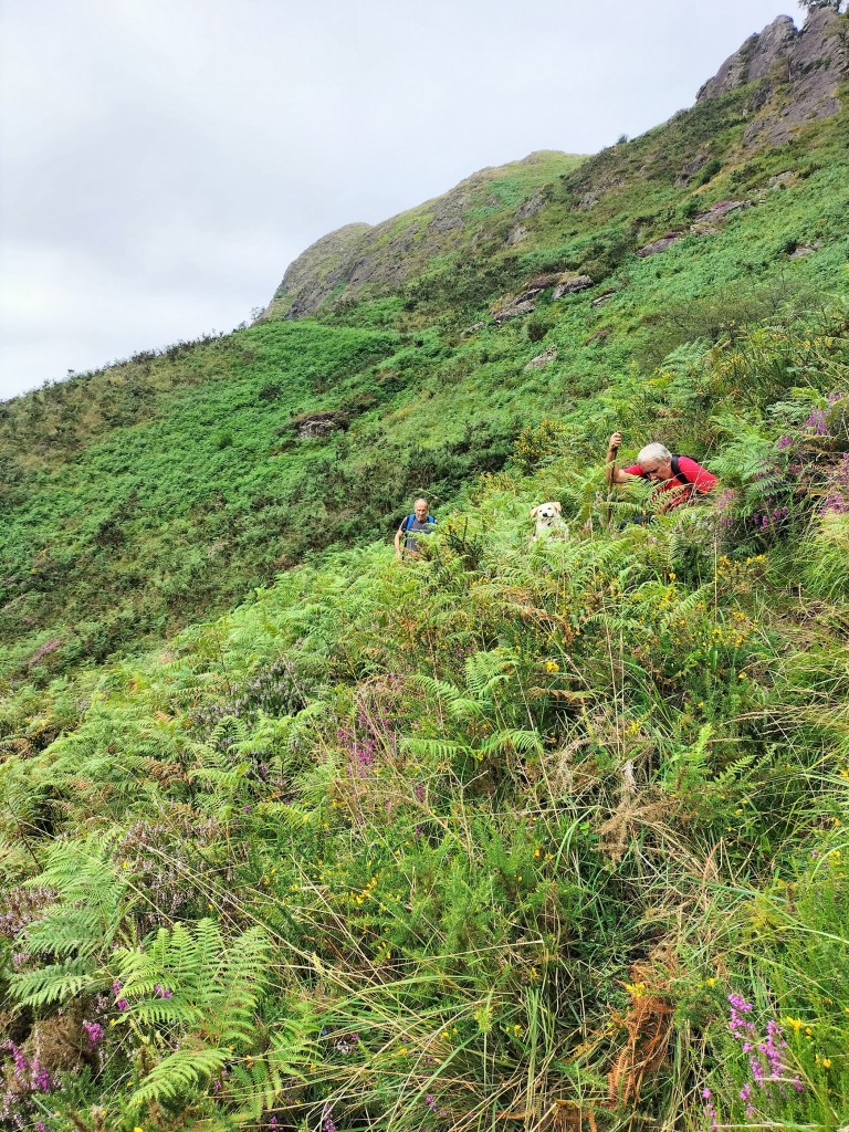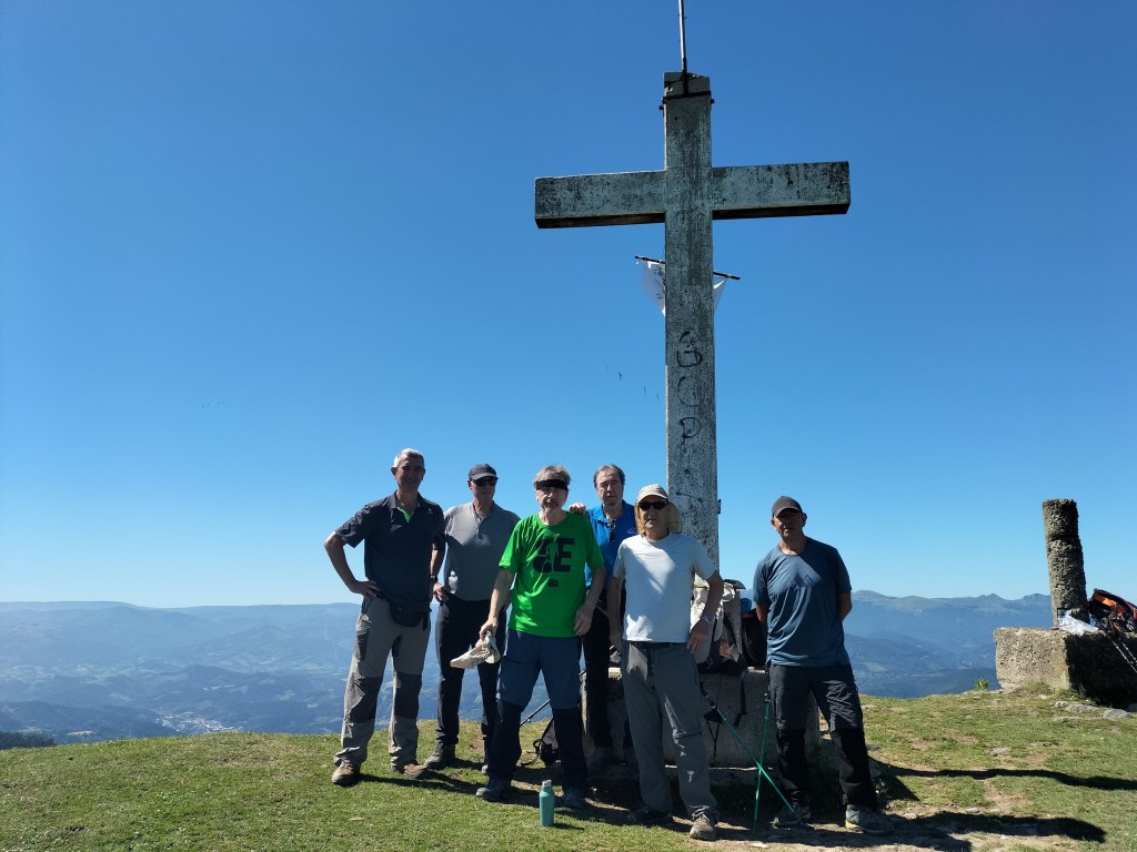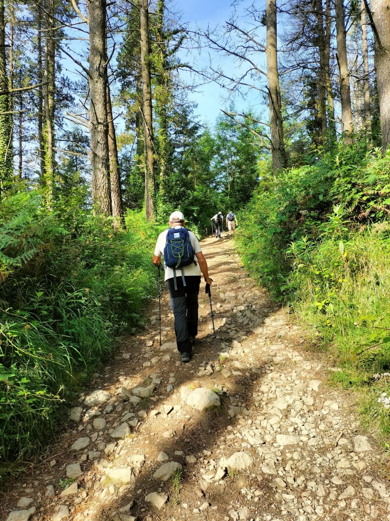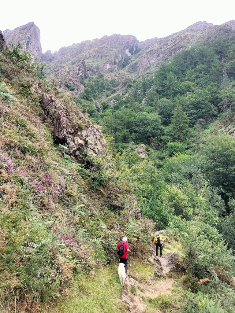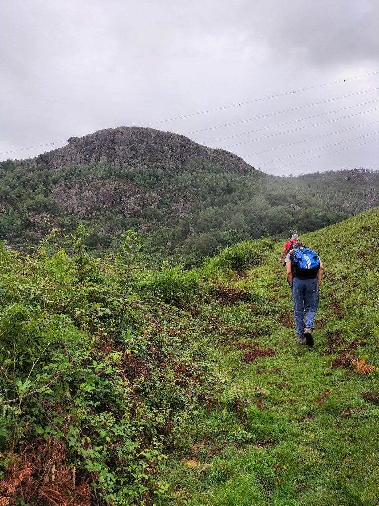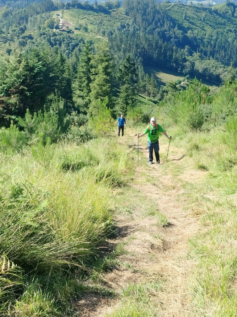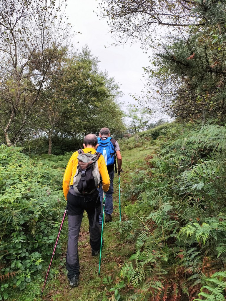 En la subida había zonas de roca en las que había que tener mucho cuidado y había que ayudarse con las manos; además hoy estaba mojado, no ha llovido desde ayer pero el cielo nublado de hoy no le ha dado tiempo a secarse. Daba miedito. Luego, en la bajada hemos seguido un camino que teóricamente era accesible pero tenía mucha pendiente, la hierba y los helechos estaban muy crecidos y costaba distinguir por donde transcurría, además estaba mojado lo que lo hacía peligroso y resbaladizo; todos nos hemos pegado alguna o varias culadas en ese trayecto que nos ha dejado agotados. Nos hemos cruzado con unos jóvenes de Irún que conocían el camino de antes y nos han dicho que ahora la hierba y los helechos están muy crecidos.