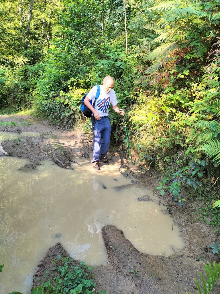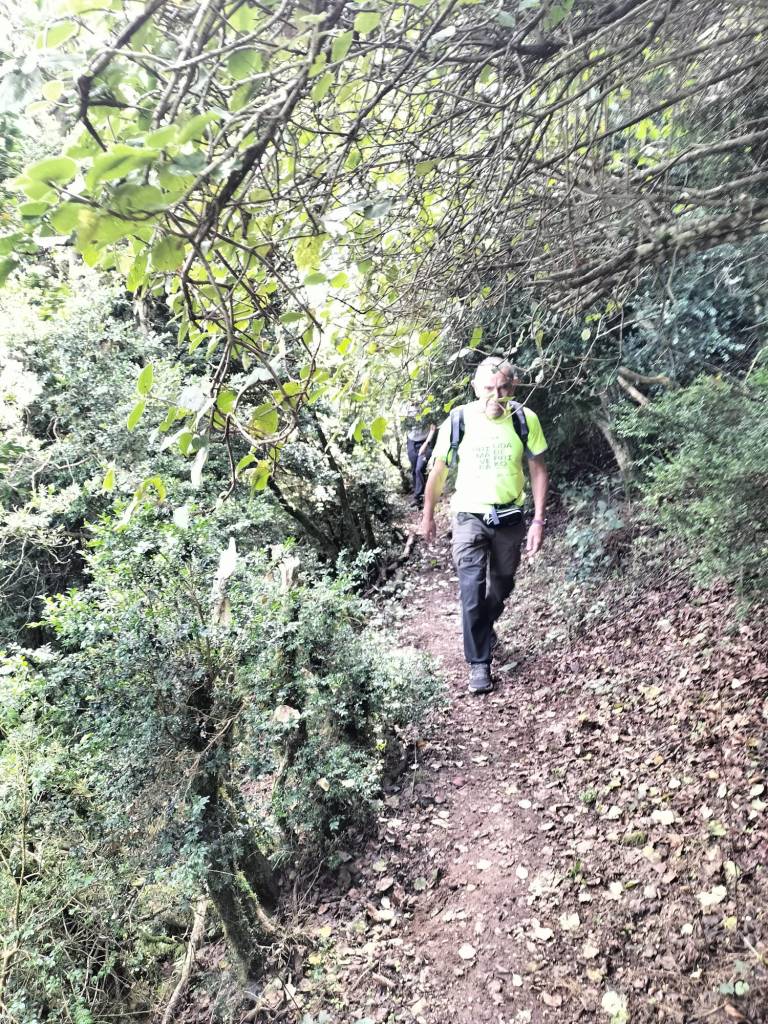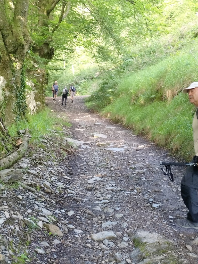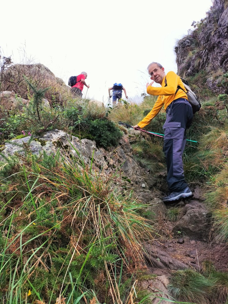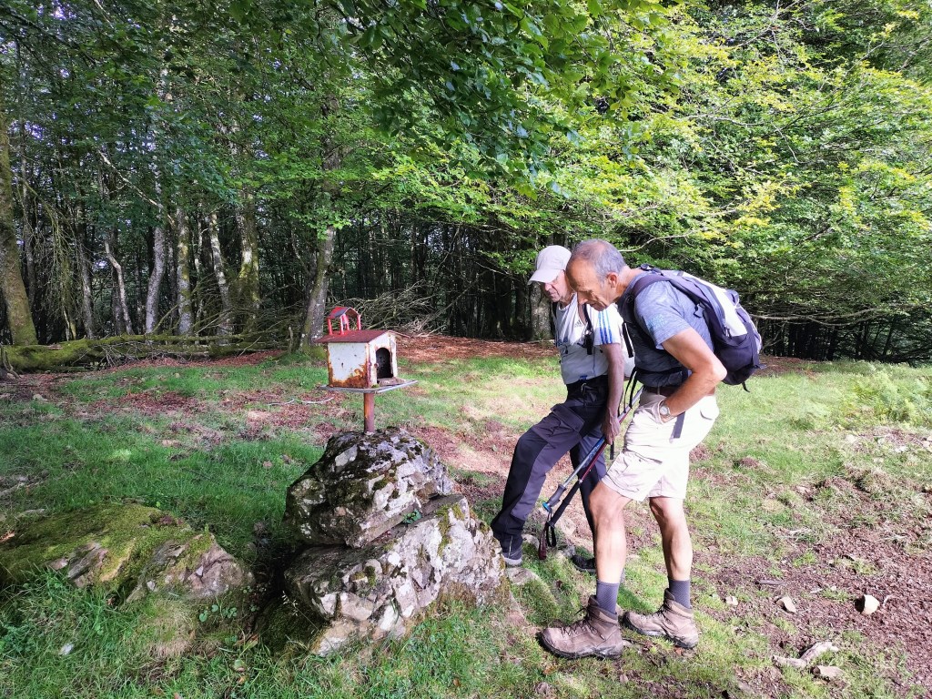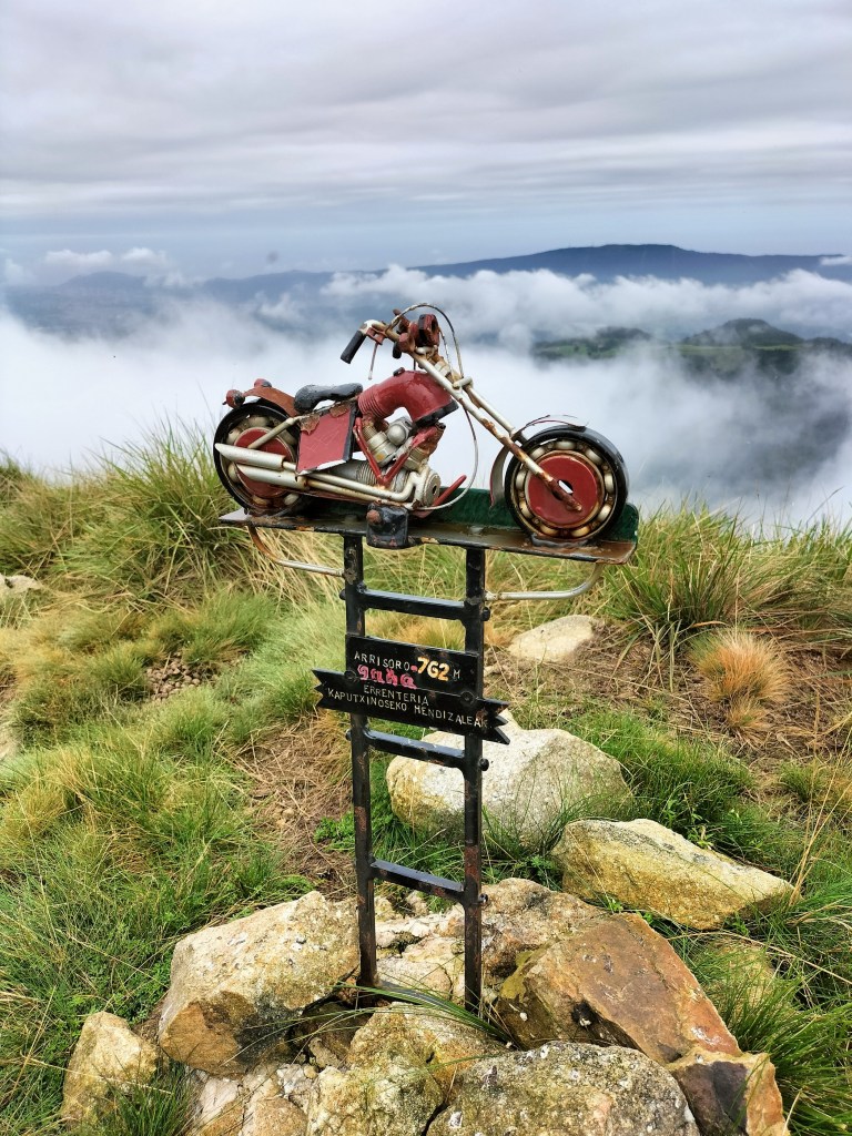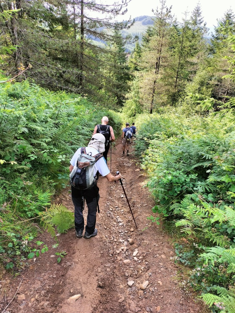 En la subida había zonas de roca en las que había que tener mucho cuidado y había que ayudarse con las manos; además hoy estaba mojado, no ha llovido desde ayer pero el cielo nublado de hoy no le ha dado tiempo a secarse. Daba miedito. Luego, en la bajada hemos seguido un camino que teóricamente era accesible pero tenía mucha pendiente, la hierba y los helechos estaban muy crecidos y costaba distinguir por donde transcurría, además estaba mojado lo que lo hacía peligroso y resbaladizo; todos nos hemos pegado alguna o varias culadas en ese trayecto que nos ha dejado agotados. Nos hemos cruzado con unos jóvenes de Irún que conocían el camino de antes y nos han dicho que ahora la hierba y los helechos están muy crecidos.
