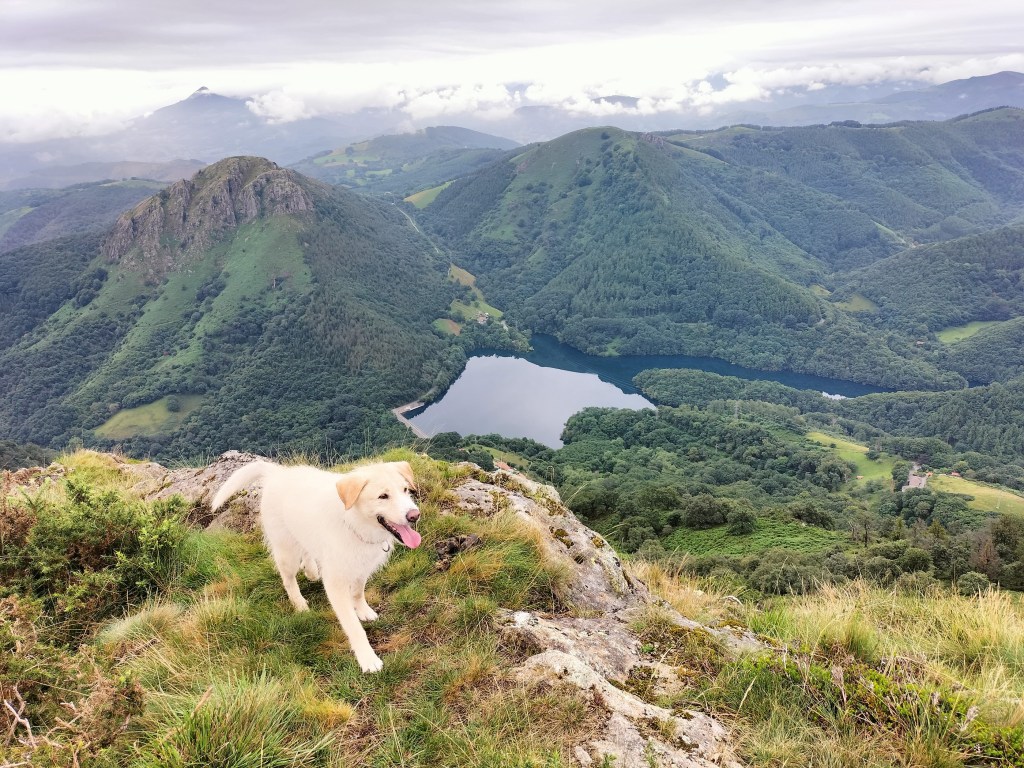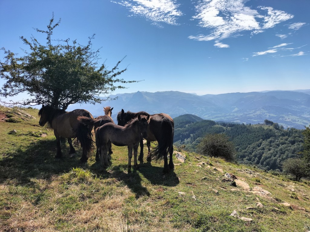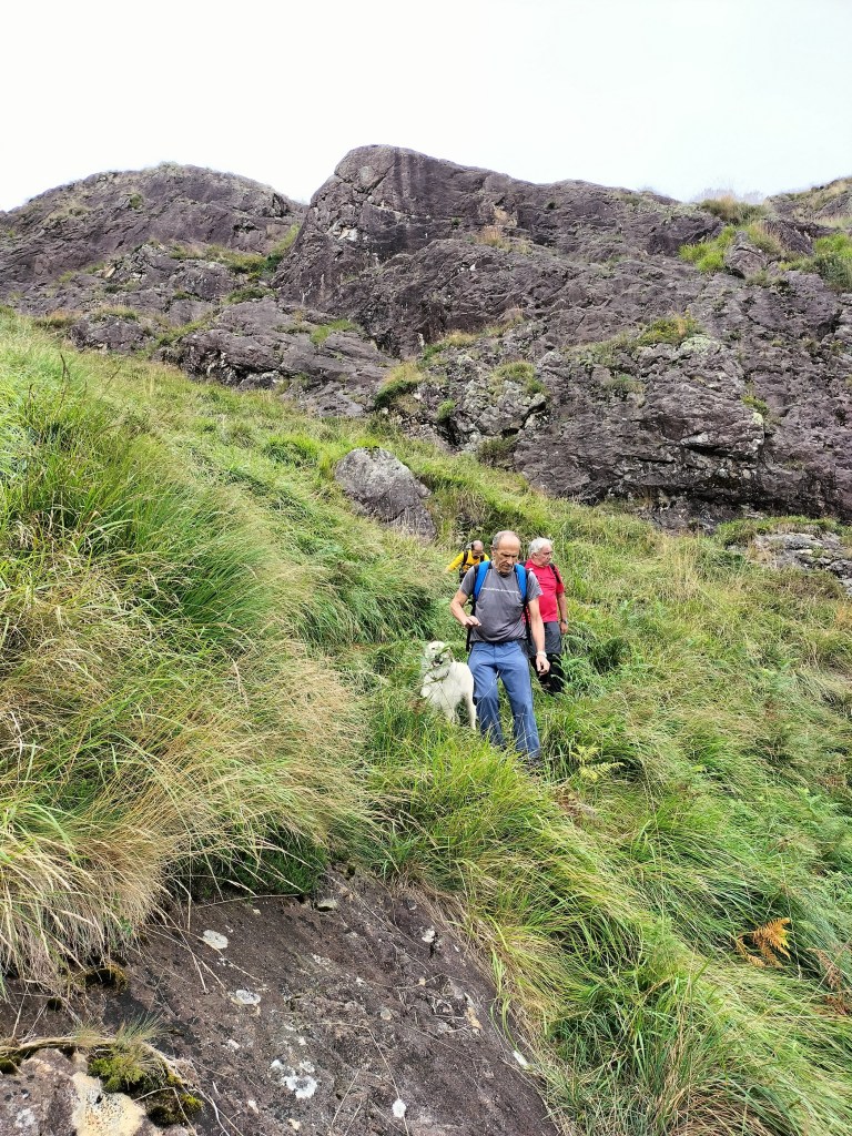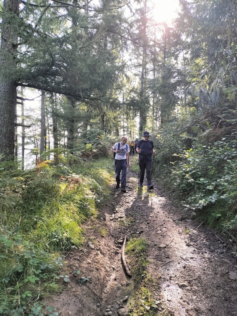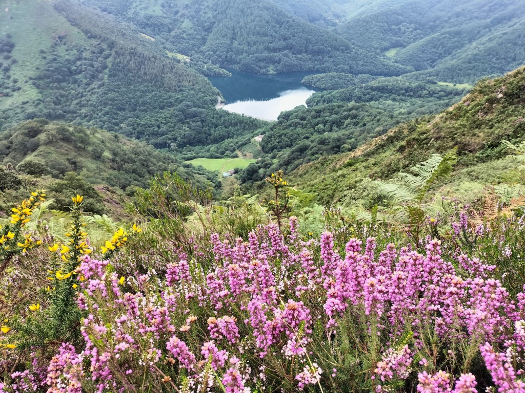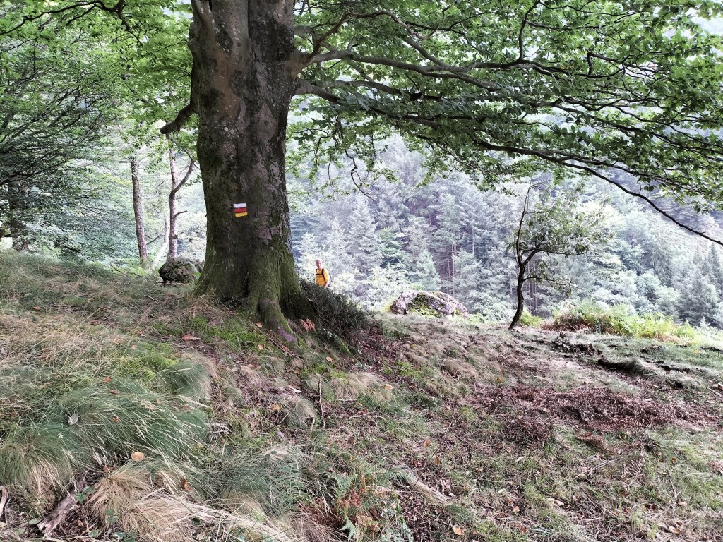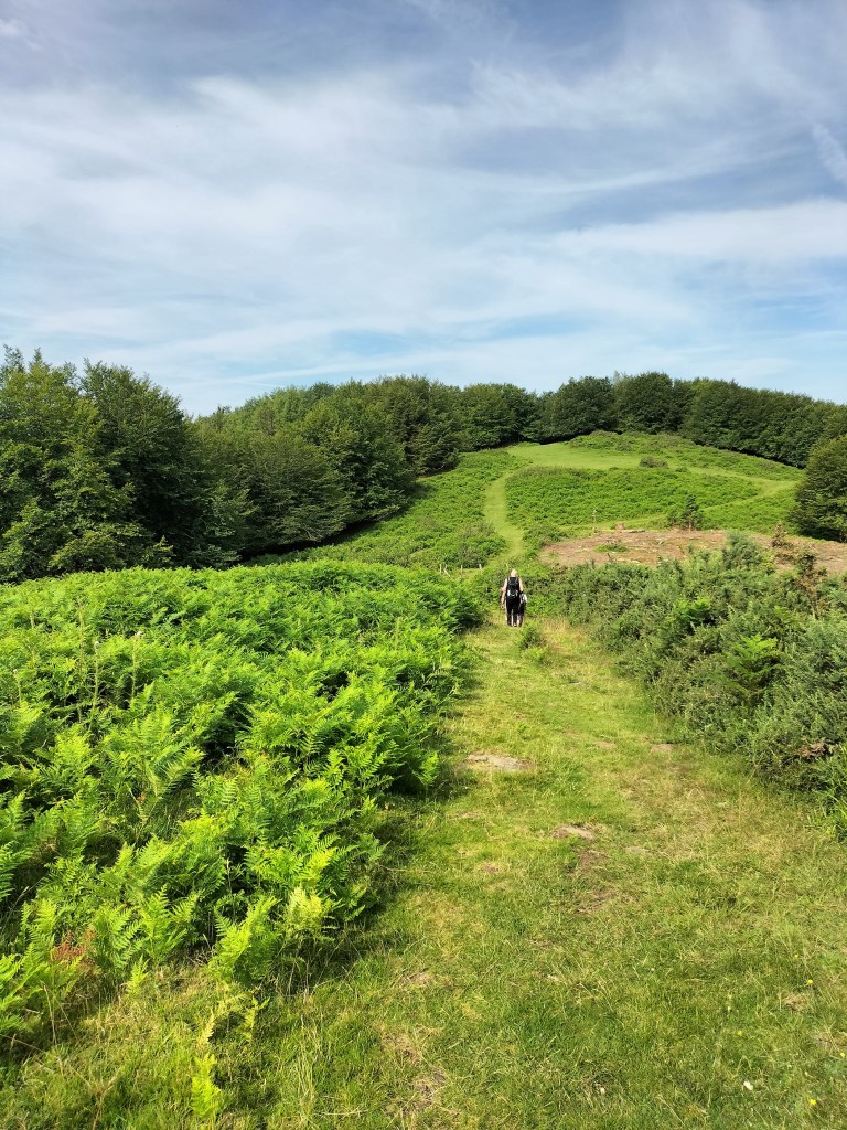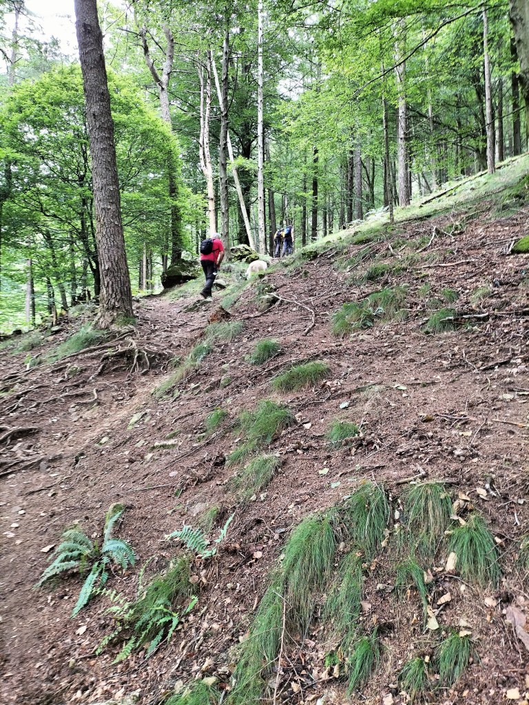 En la subida había zonas de roca en las que había que tener mucho cuidado y había que ayudarse con las manos; además hoy estaba mojado, no ha llovido desde ayer pero el cielo nublado de hoy no le ha dado tiempo a secarse. Daba miedito. Luego, en la bajada hemos seguido un camino que teóricamente era accesible pero tenía mucha pendiente, la hierba y los helechos estaban muy crecidos y costaba distinguir por donde transcurría, además estaba mojado lo que lo hacía peligroso y resbaladizo; todos nos hemos pegado alguna o varias culadas en ese trayecto que nos ha dejado agotados. Nos hemos cruzado con unos jóvenes de Irún que conocían el camino de antes y nos han dicho que ahora la hierba y los helechos están muy crecidos.