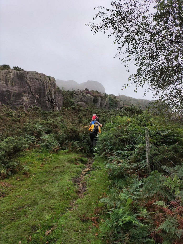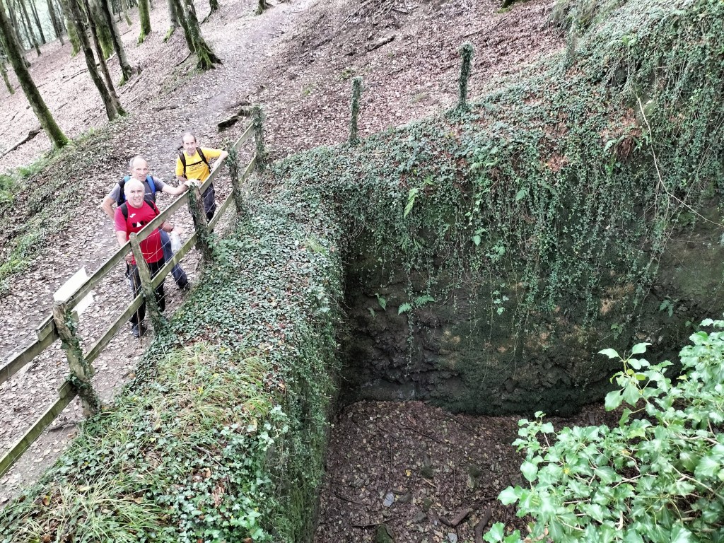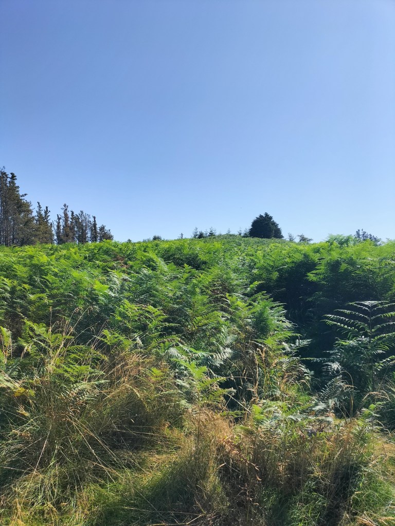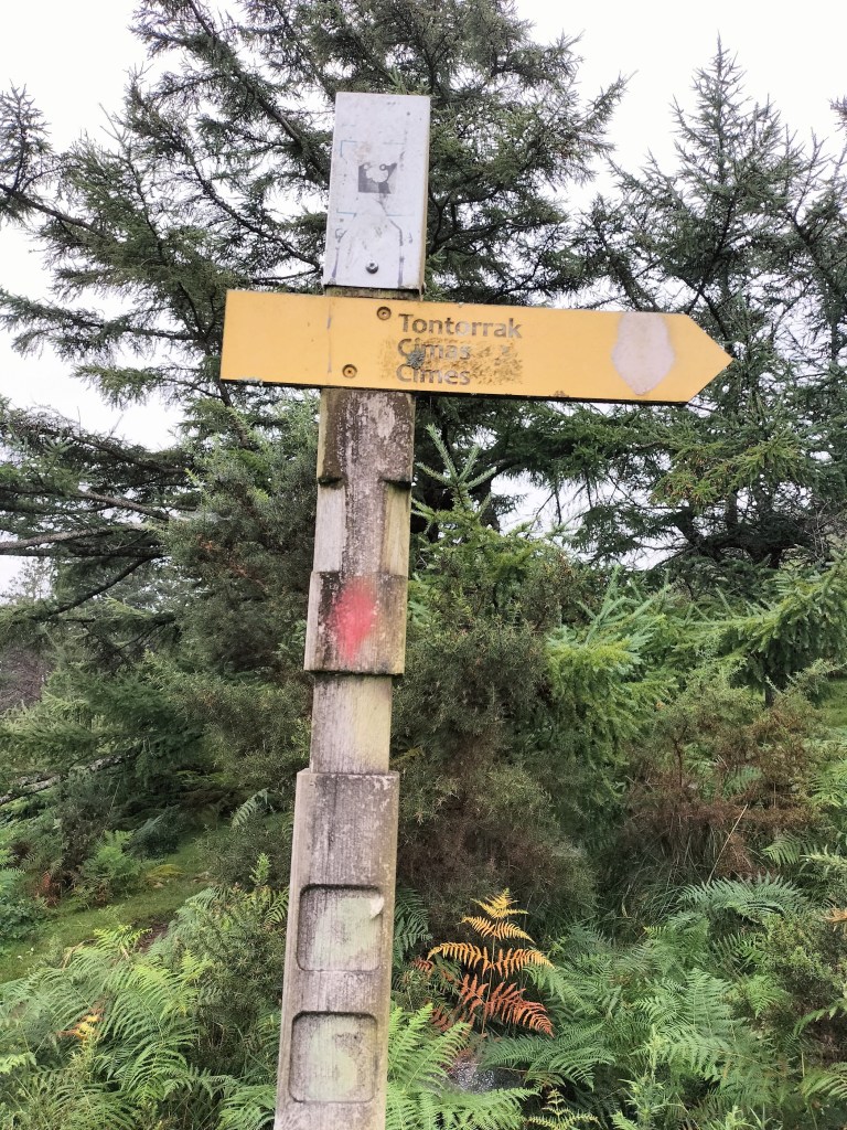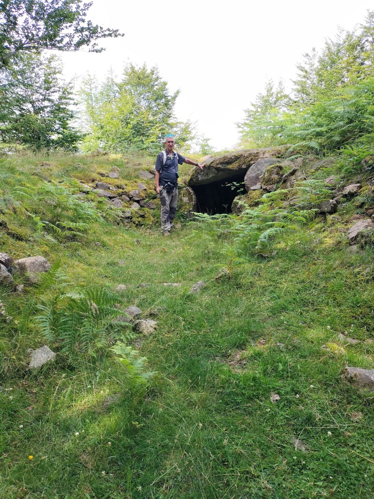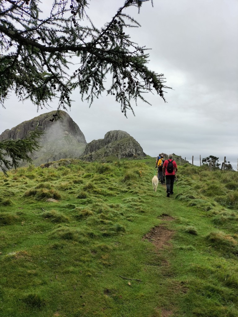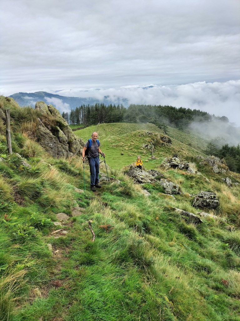 En la subida había zonas de roca en las que había que tener mucho cuidado y había que ayudarse con las manos; además hoy estaba mojado, no ha llovido desde ayer pero el cielo nublado de hoy no le ha dado tiempo a secarse. Daba miedito. Luego, en la bajada hemos seguido un camino que teóricamente era accesible pero tenía mucha pendiente, la hierba y los helechos estaban muy crecidos y costaba distinguir por donde transcurría, además estaba mojado lo que lo hacía peligroso y resbaladizo; todos nos hemos pegado alguna o varias culadas en ese trayecto que nos ha dejado agotados. Nos hemos cruzado con unos jóvenes de Irún que conocían el camino de antes y nos han dicho que ahora la hierba y los helechos están muy crecidos.