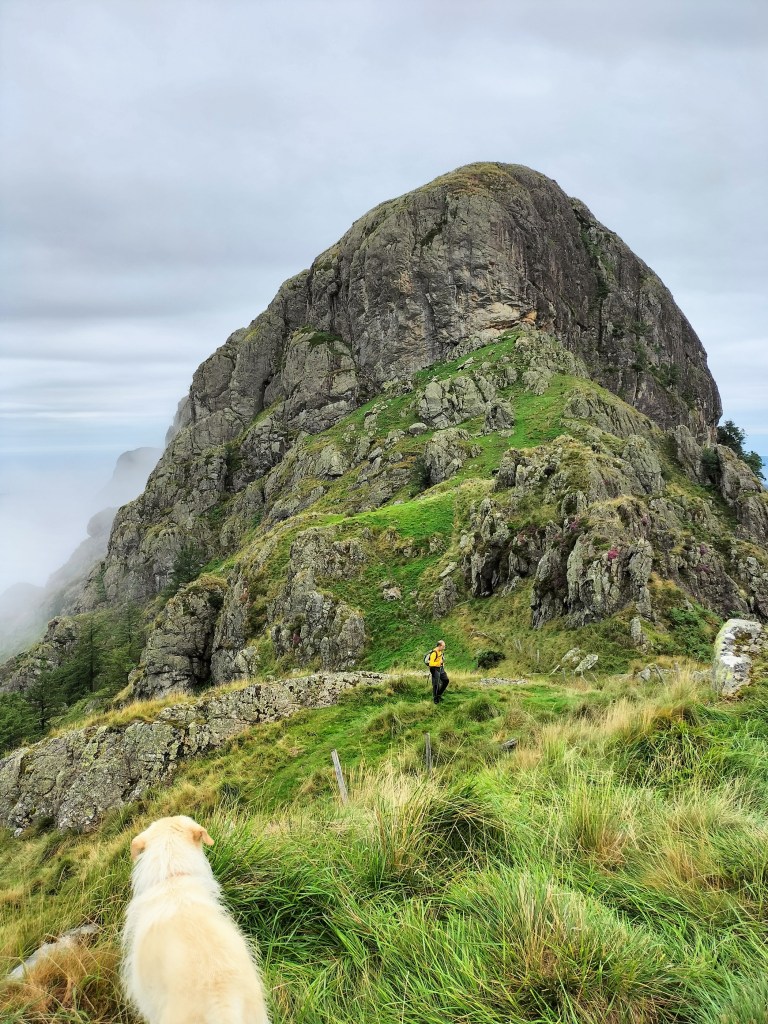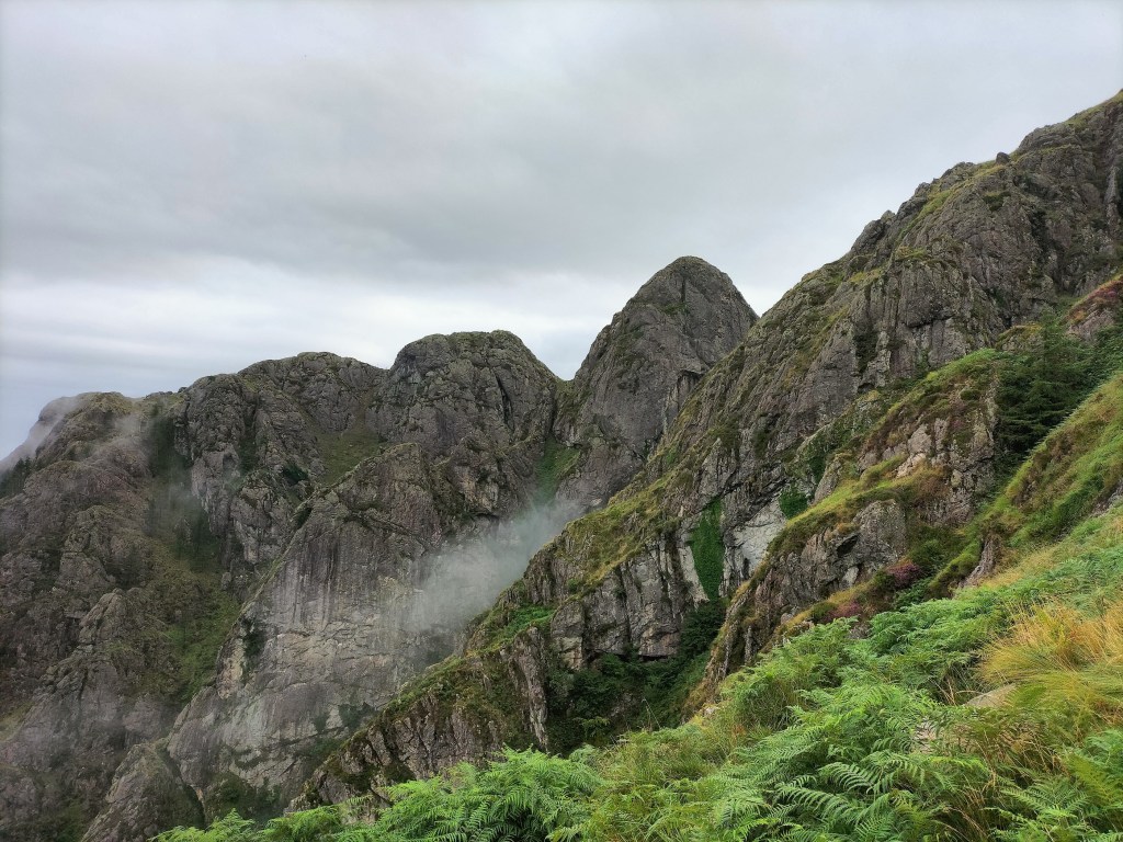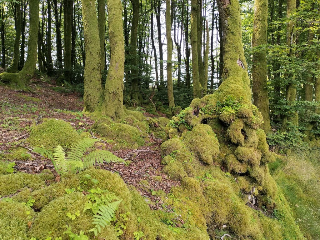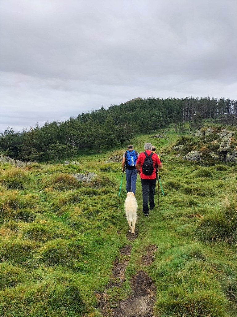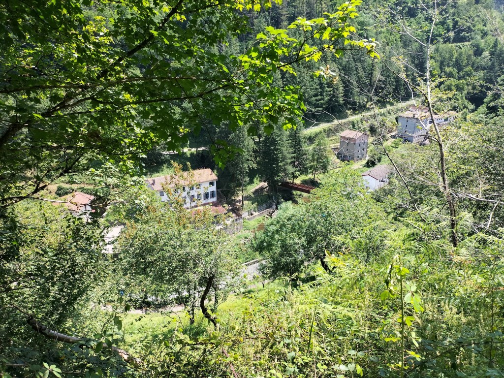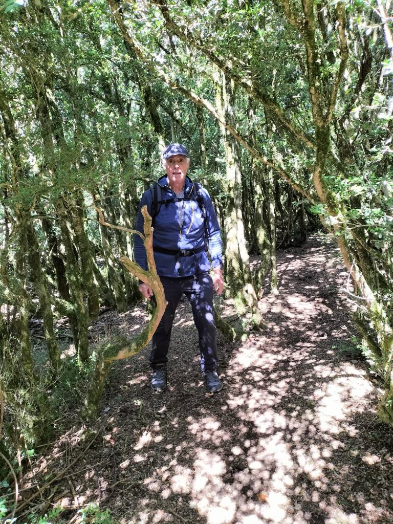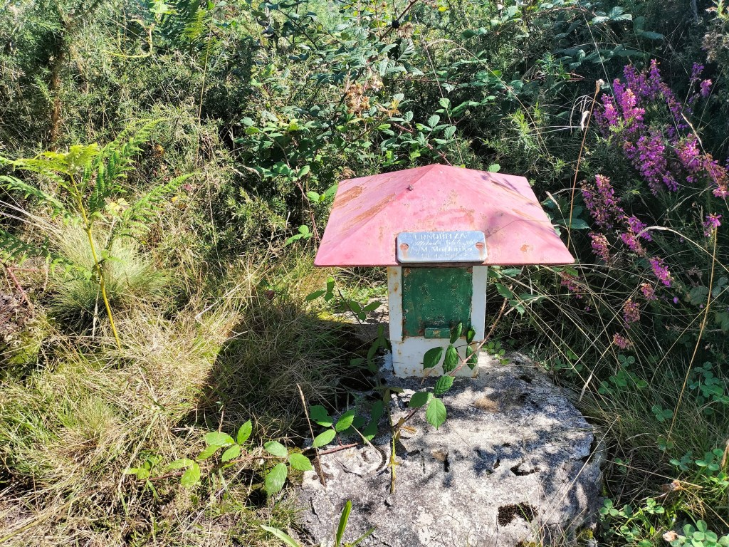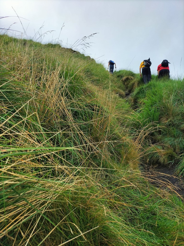 En la subida había zonas de roca en las que había que tener mucho cuidado y había que ayudarse con las manos; además hoy estaba mojado, no ha llovido desde ayer pero el cielo nublado de hoy no le ha dado tiempo a secarse. Daba miedito. Luego, en la bajada hemos seguido un camino que teóricamente era accesible pero tenía mucha pendiente, la hierba y los helechos estaban muy crecidos y costaba distinguir por donde transcurría, además estaba mojado lo que lo hacía peligroso y resbaladizo; todos nos hemos pegado alguna o varias culadas en ese trayecto que nos ha dejado agotados. Nos hemos cruzado con unos jóvenes de Irún que conocían el camino de antes y nos han dicho que ahora la hierba y los helechos están muy crecidos.