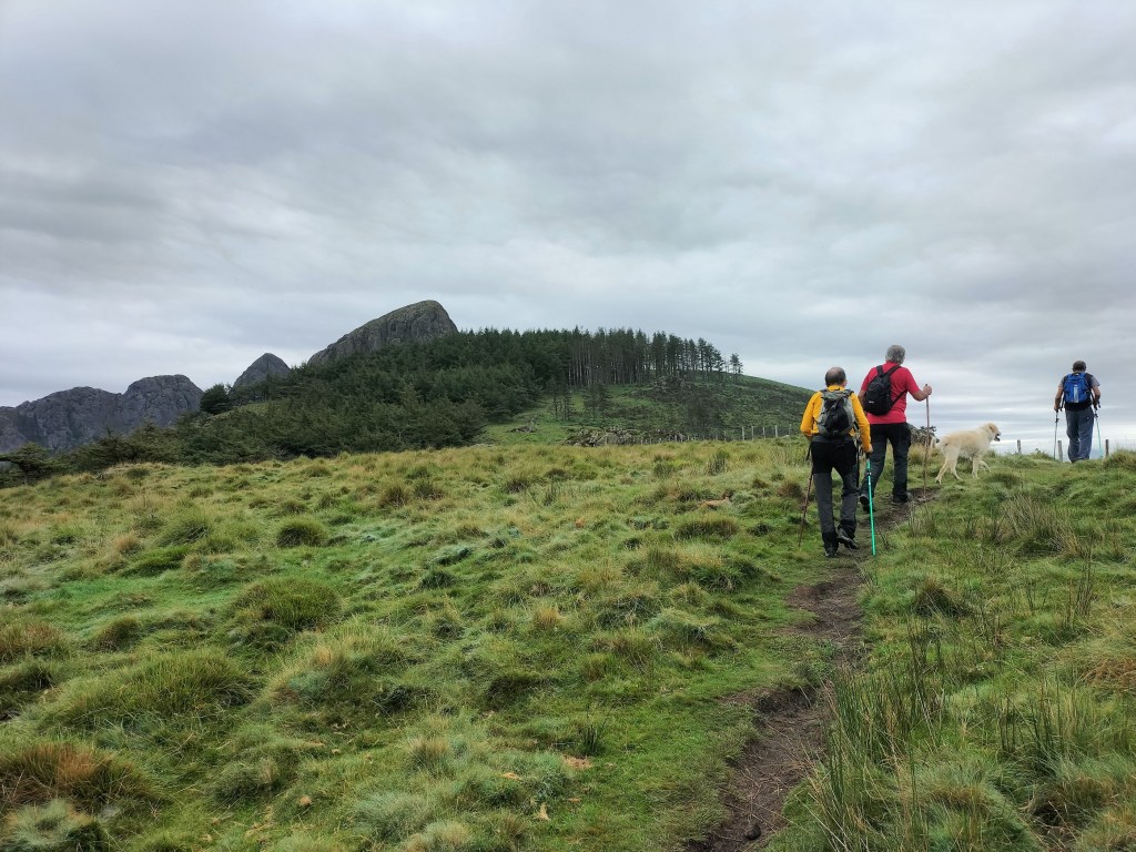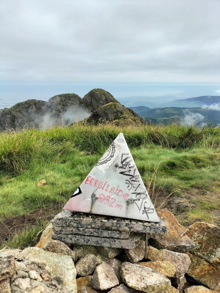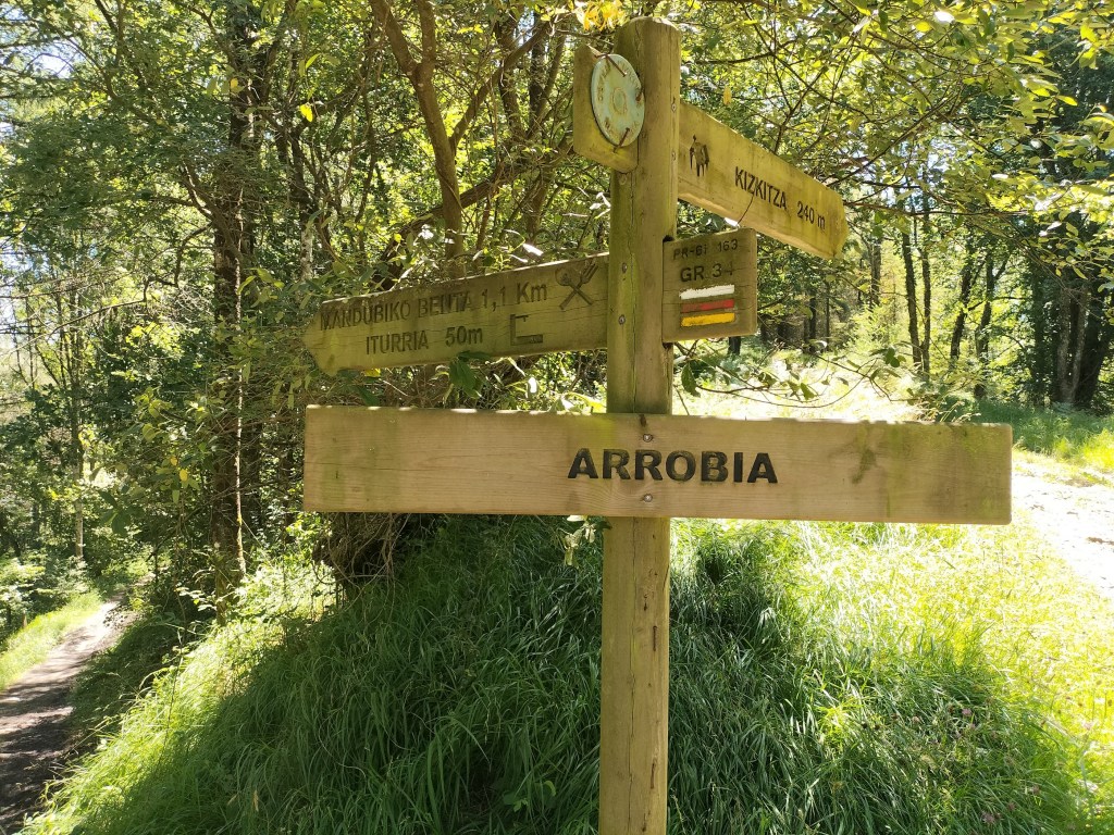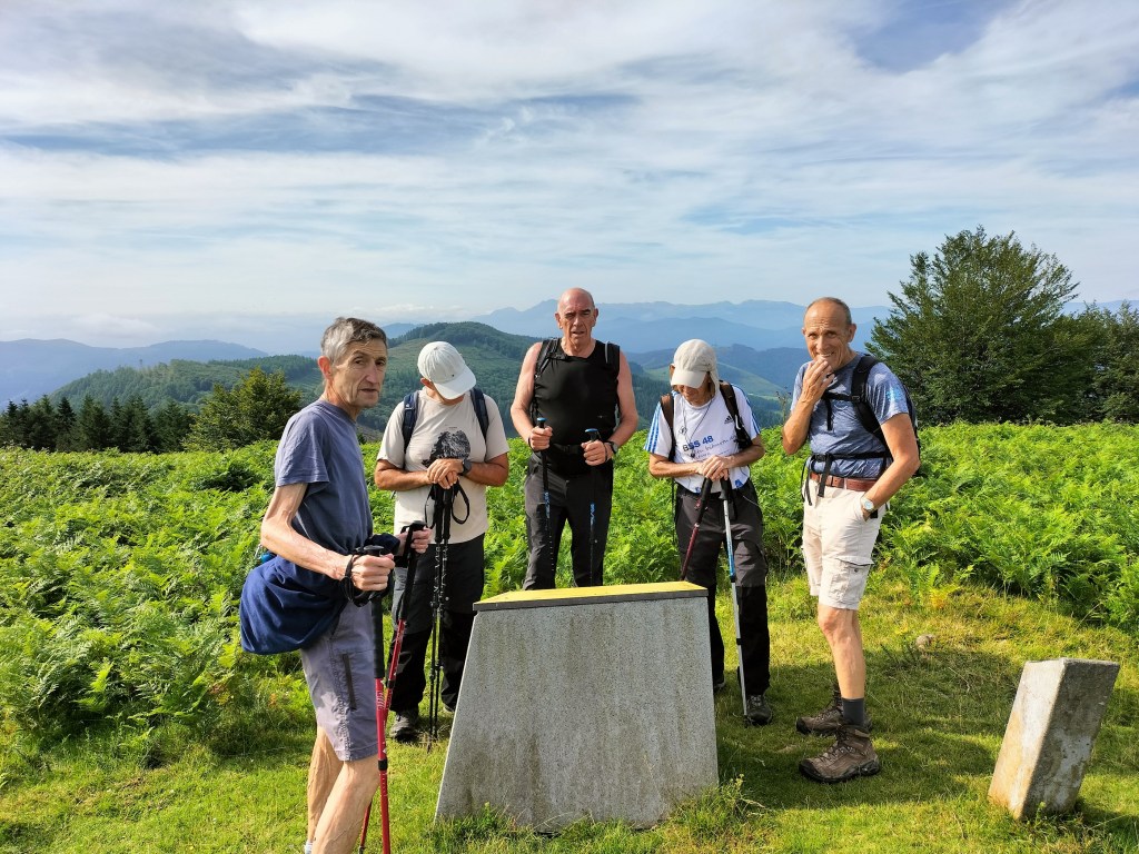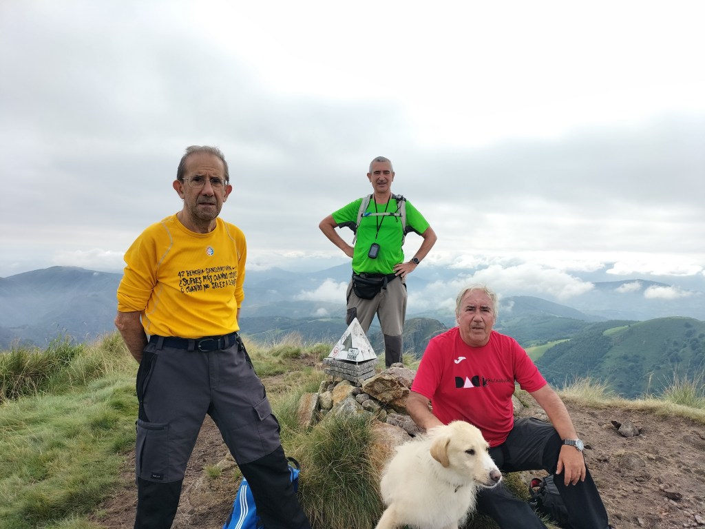 Parte del equipo. Alai todavía estaba contento porque después de mucho tiempo volvía al monte.Primeras cuestas, todavía con las manos en los bolsillos, je, je.El camino, a pesar de ser un GR, en la primera parte está bastante invadido por la vegetación.Seguimos adelante por el GRHasta que llegamos a la señal que indica que hay que abandonar el GR y dirigirse hacia las cimas.El camino se vuelve más difícil y estrechoHay que salvar algunos obstáculos todavía fáciles.para salir a una zona herbosa y despejada desde donde podemos contemplar los objetivos del díaAtravesamos la zona herbosahasta llegar a un bosque de alercesdonde a un lado de la valla estábamos nosotros y un grupo de caballos, y al otro lado un rebaño de ganado vacuno con su gran toro, al cual se le puede apreciar al fondo.Muga con la O de Oiartzun, detrás tenía la L de LesakaSalimos del bosque y nos acercamos a nuestros objetivos pensando «por donde c… se subirá ahí»La pendiente se agudiza y, aunque en algún punto hay que echar las manos, llegamos al primer objetivo Primer objetivo del día, Arrisoro (762m), con un buzón muy llamativo, completamente diferente a los que estamos acostumbrados.Descendemos Arrisoro y nos encaminamos a Erroilbide sin distinguir por donde se podía subir; de frente ni hablar, habrá que rodearlo por alguno de sus lados.Bonitas vistas, Alai con el embalse de Endara y los montes Kopakoarri y Agiña detrás.Parece que hay que rodear la gran roca por su izquierda y, efectivamente, hay un camino que nos permite rodearlasiguiendo el caminollegamos a un circo donde se ven el resto de montañas del macizo de peñas de Aia (Txurrumurru, Irumugarrieta y Muganix). A partir de aquí empiezan las dificultades principales de la ascensión, con paredes casi verticales que había que ir subiendo con muchísimo cuidado, por lo que no hay fotos de este tramo; ¡estaba yo como para sacar el móvil!Último tramo de subida, mucha pendiente pero herbosa; ya hemos dejado atrás las paredes verticales de roca.Foto de cima con Javier, Juan Cruz, Josean y Alai. Hemos tardado 2:05 horas en hacer 3,6kmFoto de cima con Felipe y Josean.Buzón de Erroilbide, detrás las peñas que no vamos a subir, por lo que pensábamos que nuestras penalidades se habían terminado. Já.Nos acercamos hasta la pared de Txurrumurru y comenzamos a bajar por un camino que se intuye debajo de la hierba. Está mojado y resbala.El camino va tapándose más y más por la hierba y los helechosEl paisaje es muy bonito, aunque nosotros no estamos en condiciones de apreciarlo.Seguimos bajando y soltando juramentos; de vez en cuando una culada.Por fin, tras muchas penalidades, llegamos a una zona de bosque donde ya se podía caminar. Desde la cima hasta aquí hemos recorrido 1,9km y hemos tardado 2:01 horas en hacerlo (con un frugal amaiketako por medio)Llegamos a terreno conocido, estamos en la zona de Elurretxe y del Castillo del Inglés, ya solo tenemos que seguir las marcas del GREl camino es cómodo de andar y al principio bastante llano.Caminamos cómodamente, al menos por un rato.ElurzuloSeguimos las marcas del GR y poco a poco el camino se va empinandoAtravesamos un gran bosque mixto de hayas y pinosA ratos bajamos para, a continuación, tener que volver a subir lo bajado.Dando los últimos pasos por camino empinado, ya estamos cerca del alberque.