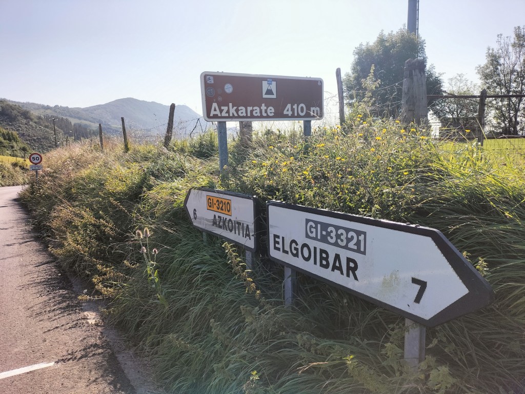 Iniciamos el recorrido muy cerca de la biblioteca municipal que ocupa la antigua estación del ferrocarril Zumarraga-ZumaiaEnfrente la parroquia de Santa María La Real.Al principio vamos subiendo por asfalto; más adelante se ve el Barrio de UrrategiEs temprano pero ya estamos sudando por el esfuerzo. Al fondo el monte Samiño.Foto de grupo junto a la ermita de Andra Mari de UrrategiDejamos el asfalto y continuamos por pista, cómoda de andar.El atajo que tomamos también era cómodo salvo en algún tramo encharcado, que unos evitamos por el borde y otro lo hizo en plan anfibioSeguimos por camino cómodo, cruzando plantaciones de eucaliptos. Nos las prometíamos felices por el ahorro de desnivel y de distancia por el atajo tomado. Já, al final …Cambiamos de vertiente y vemos ElgoibarPasamos cerca de la fuente de Sargoate.Y llegamos al alto de Azkarate donde dos pottokas salieron a saludarnos.Señales en el alto de AzkaratePoco después del alto de Azkarate tomamos un desvío señalizado como el GR 285; lo seguiremos durante un buen trecho.Seguimos caminando por terreno cómodo si no fuese por la pendiente.y tras bordear el monte Azkarate, al que luego volveremos, cogemos un desvío y nos vamos hacia Urnobitza hasta que nos encontramos con una muralla de helechos. Damos un rodeo bordeando un pinar hasta que llegamos a Urnobitza (644)Foto de cima, toda invadida por la vegetación. No vimos ningún buzón. volvemos por donde hemos venido y tras un durísimo repecho llegamos al monte Azkarate.Aquí si hay buzón, pero…El buzón marca Urnobitza ¿?. Estamos seguros de que es Azkarate, por la altitud y porque tiene un vértice geodésico casi destruido.Foto de grupo en Azkarate (664)Y nos vamos para abajo, al principio entre pastizales y helechalesSeguimos bajando en dirección al barrio de Madarixaen cuya fuente aprovechamos para refrescarnos y rellenar las cantimploras ya que hace bastante calorCartel indicador de donde estamos. Poco más adelante nos pasamos un desvío que hizo que, desde entonces, fuésemos fuera de ruta, ¡Pero no perdidos, eh!Bonito baserri con una gran parra cuya propietaria nos dio indicaciones para llegar a la carretera para ir a AzkoitiaYa estamos en la carretera; se hace un poco penoso andar por el asfalto, el calor y ,una vez que llegamos a la carretera nueva del Alto de Azkarate, por el tráfico.Casa Egurbideola y ermita del Angel de la GuardaSeguimos por carretera; ya queda pocoy Llegamos a Azkoitia que este año celebra el 700 aniversario de su fundación con el nombre de San Martín de Iraurgi. En la foto la casa consistorial (S. XVIII)Puerta lateral de la parroquia de Santa María La RealParroquia de Santa María La Real (S. XVI)Torre de Idiakez (Etxe Beltz)Curiosa fuente ornamental.