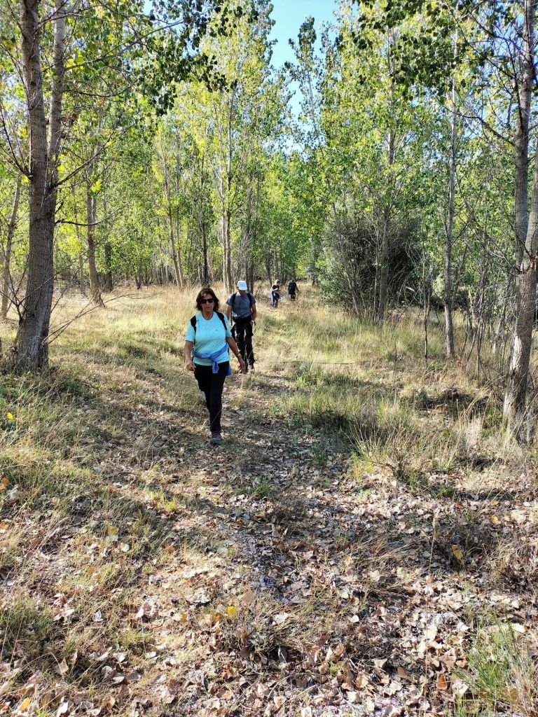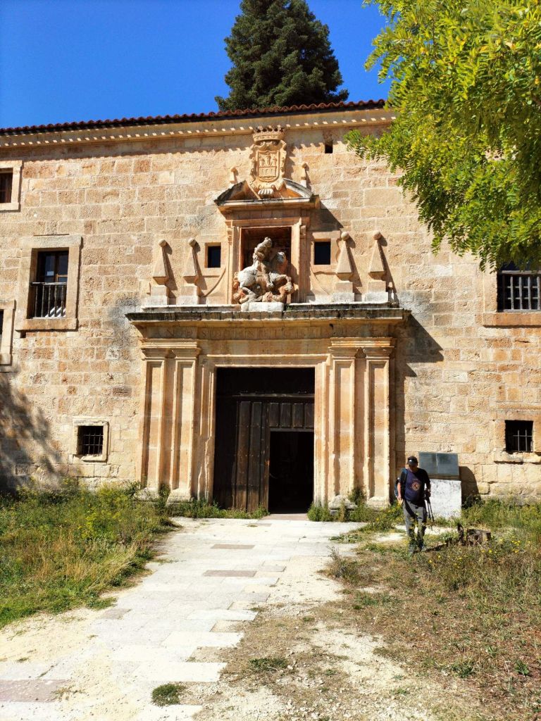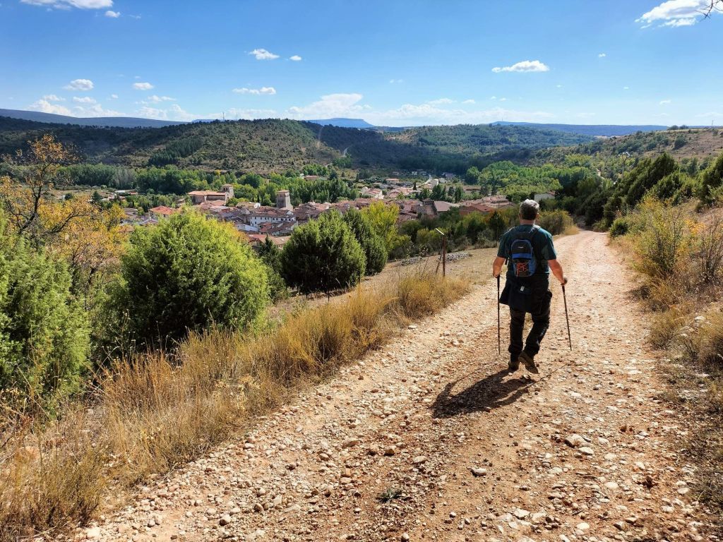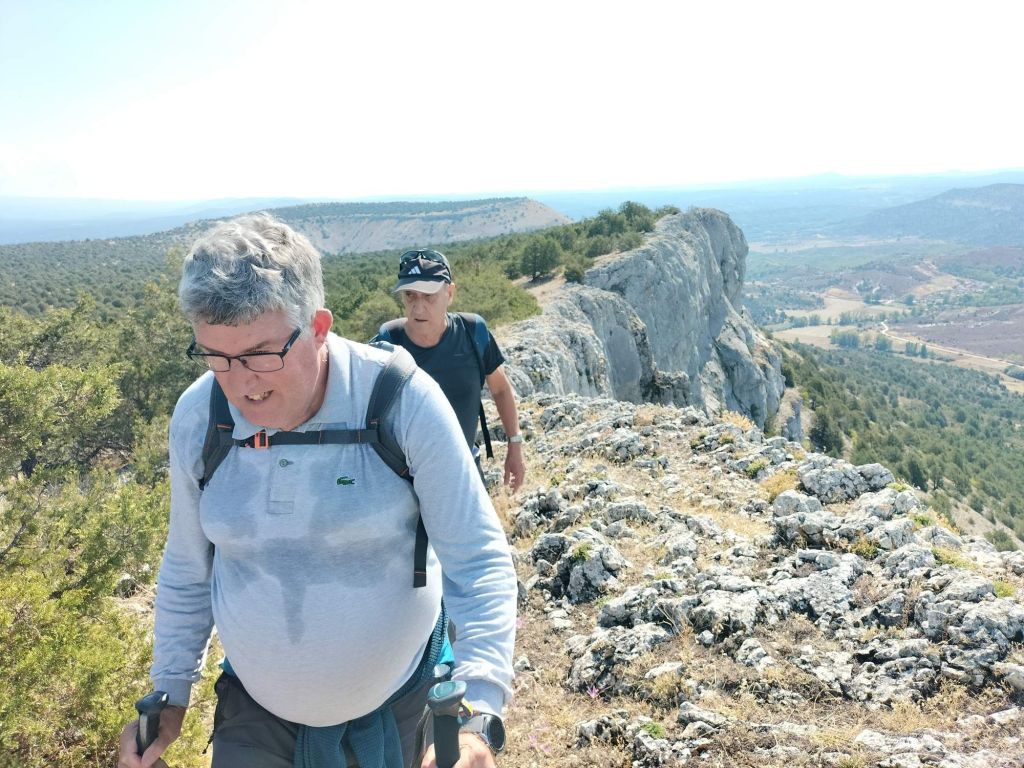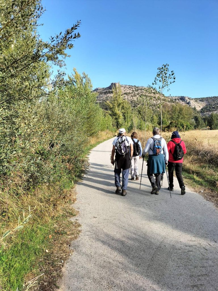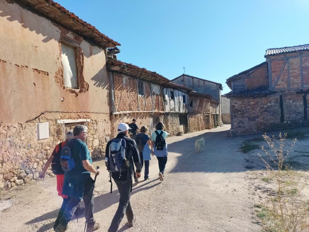 Inicio de la etapa, entrando al núcleo histórico de Covarrubias.Al poco de iniciar la marcha pasamos junto a una plantación de vides. La denominación de origen del vino de la zona es «Ribera del Arlanza» (rasposillo). Al principio el camino va cuesta arriba hasta llegar a …… Un alto que nos da vista a otro valle, donde está Retuerta. Al fondo se ve Peña Carazo, nuestro objetivo de mañana.Vista del valle donde está Retuerta y por donde discurre el río Arlanza.Ya vamos bajando hacia Retuerta. En la foto «el bueno, el feo y el malo», protagonistas de la celebre película de Sergio Leone. Adivinad que papel hace cada uno de ellos.A la entrada de Retuerta nos sorprende el estado de algunas casas.Pero nosotros seguimos adelante.Pareja de jubilados de la Muni disfrutando de un banco patrocinado por la !Caja de Ahorros Municipal!.A la salida de Retuerta seguimos un camino paralelo al río que se ve que ha servido para la prueba de ciclismo «Colina triste». En esta zona todo va de «Sad Hill», celebre cementerio de la película «El bueno, el feo y el malo». Habéis adivinado quien hace cada papel?, a qué estáis esperando!Seguimos por una senda que va al borde del río.Por aquí pasan varias rutas. Esta no es la nuestra.Fernando admirando está curiosa formación rocosa.Seguimos por el borde del río por una chopera. Poco después nos metemos en un marrón por no haber seguido el track y haber ido por la carretera.Río ArlanzaDesvío hacia la ermita de San PelayoErmita de San Pelayo. Más información en https://www.turismocastillayleon.com/es/patrimonio-cultura/iglesias-ermitas/ermita-san-pelayoVista del monasterio desde la ermitaVista había el rio Arlanza desde la ermitaDe repente nos ha aparecido en una ventana el guardián de la ermita. Menos mal que nos ha dejado marchar sin castigarnos por haber perturbado su descanso.Entrada al monasterio de San Pedro de Arlanza. Siglo X. Más información en https://es.wikipedia.org/wiki/Monasterio_de_San_Pedro_de_ArlanzaUno de sus claustrosZona de la iglesia, parcialmente derruidaVista del ábside de la iglesiaOtro claustroY a la salida del monasterio nos equivocamos al elegir el camino y seguimos uno que añade algo más de 2 km al recorrido y unos 120m de desnivel positivo. Lo peor no son la distancia, ni el desnivel añadido, ni tan siquiera el calor que ya calienta fuerte, sino el seguir adelante sin saber si en cada cruce elegíamos el camino correcto para llegar a donde queríamos ir.Aún así disfrutamos de la experiencia, atravesando un profundo y bonito valleCon curiosas formaciones rocosasDe vez en cuando el camino se empinaba mucho.Hasta que por fin llegamos a un punto en el que conectamos con la ruta prevista.A partir de ahí todo será coser y cantar; lo de cantar no es una frase hecha, con tanto corista!Por aquí también pasa el «Camino de San Olav» . Más información en https://caminodesanolav.es/es/contenido/?idsec=577Ya todo hacia abajoUna plantación de lavanda. Una pena que ya la hubiesen recolectado. Al fondo la Peña Carazo.Ya tenemos Covarrubias a la vista.Una foto del equipo casi completoLa misma foto con el miembro que faltaba.
