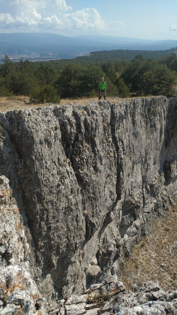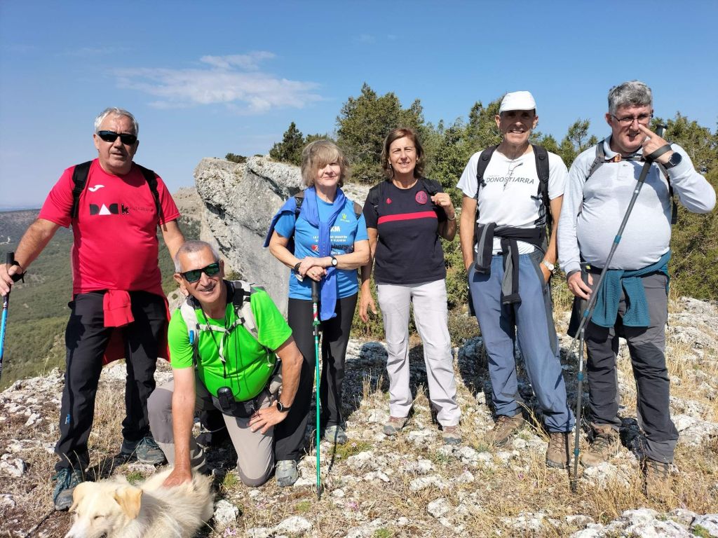 Foto del grupo al inicio en CarazoAl principio caminamos cómodamente por pista. Al fondo nuestro objetivo, la.peña del Carazo.Poco a poco el camino se va estrechandoY empinando, además el suelo es de gravilla y resbala mucho. Hay que ir con cuidado.Vamos subiendo con dificultad entre sabinas.Se puede apreciar el suelo de gravilla, menos mal que de vez en cuando se suaviza la pendiente.Seguimos subiendo por la pestosa gravilla.Ya casi estamos, un penúltimo esfuerzo.Ya estamos en la meseta superior en la que caminamos con cuidado entre rocas y sabinas.Foto de grupo en un mirador de la meseta superior. Pensábamos que se acababan las dificultades, pero no, ahora tendremos que caminar entre piedras y sabinas por el borde del precipicio.Josean se va para arribaY sigue por el borde del precipicioParece que solo dos se atreven a asomarse a este balcón.Pero al final vamos todos.Seguimos bordeando los imponentes cortadosMikel en pleno esfuerzoOtra foto de grupo al borde del abismo.Aquí solo se atreve unoPero, más tarde, nos asomamos todosEl fotógrafo de la foto anterior cazado ( foto Josean)Cima!!! Por fin. Foto de grupo.Alaj está cansado.Alegremente, pensando que se habían acabado nuestras penalidades, nos vamos hacia abajo. Ja! Inocentes, no sabemos lo que nos espera.Primero un paso estrecho, chupado!Poco a poco, sin problema, atravesamos el canalY salimos a un camino de grava pestosa que se va inclinando por momentos. Resbala mucho y hay quien más tarde declara que ha pasado miedo.Poco a poco vamos a avanzandoParece que el firme mejora algoY por fin entramos en un bosque de sabinas que nos lleva hasta casi el pueblo de Carazo.Después vamos a comer y más tarde nos vamos de turisteo al celebre cementerio de Sad Hill, lugar donde se rodó la escena final de la película «El bueno, el feo y el malo» de Sergio Leone, y en donde podemos ver una figura del personaje que interpretaba Clint Eastwood y un montón de cruces sobre aparentes tumbas.No se puede ver Sad Hill sin oír su banda sonora.Una foto de grupo en Sad Hill (foto Reyes)