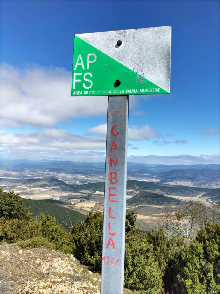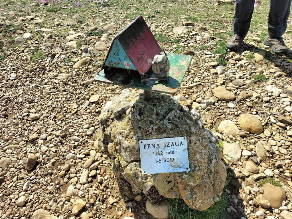 Aparcamos junto a una fuente de la que manaba un buen chorro de agua, la cual aprovecharemos para asearnos y refrescarnos al terminar el recorrido.4 integrantes de la expedición, el quinto haciendo la foto.Empezamos a andar y, aunque la señal nos indicaba ir por otro lado, nosotros seguimos por la pista; vamos a hacer una circular más larga y, en mi opinión, más bonita; luego volveremos por donde indica la flecha.Ahí está nuestro objetivo principal del día, Peña Izaga, todavía cubierta de nubes.Seguimos por pista, cómodamente.Después de andar un kilómetro dejamos la pista y comenzamos a subir, primero por campo y después por bosque, teniendo que salvar algún obstáculo, pero nada puede con nuestro espíritu montañero.Había muchas moras y aprovechamos para comer algunas; estaban ricas.Fede recolectando.A veces vamos por pistay a veces por caminos empinados. Poco a poco vamos ganando altura.En este punto hay un mirador desde el que se pueden admirar los PirineosEl camino asciende pegado a la pared de la montaña entre bosquecillos de boj.Hasta que llegamos a la loma cimera de Peña Izaga, cubierta de Robameriendas (Colchicum sp). A un lado vemos la cima de Peña Izaga y …al otro lado la ermita de San Miguel, con un grupo de montañeros almorzando refugiados en su portada. Su visita la dejaremos para la vuelta.Más Robameriendas, estaba lleno.Y llegamos a nuestro primer objetivo, Peña Izaga (1362m)Foto de grupo en la cima. Una simpática chica nos hace la foto y así salimos los cinco (Foto Juanjo)Para ir y volver (pasaremos otra vez por Peña Izaga a la vuelta) hay que atravesar espesos bosquecillos de boj.Ya estamos en la cima de Ganbella (1256m)Foto de grupo. Aquí no había nade para sacarnos la foto así que falta uno, ¿adivina quién? (Foto Juanjo)Las vistas son extraordinarias hacia los Pirineos. La foto no hace justicia a la vista.Vamos volviendo a Peña Izaga atravesando los bosquecillo de boj.Eran espesos aunque se atravesaban sin problema.Ya hemos coronado otra vez Peña Izaga y nos vamos hacia abajo, directos a la ermita de San Miguel. Al fondo se puede ver Pamplona.Hacia otro lado podemos ver Monreal y su Higa y al otro el famoso embalse de ItoizUn par de equinos, madre e hija (supongo), cuyo rastro habíamos visto frecuentemente a lo largo del recorridoJuanjo haciéndole una carantoña a la peque; no se asustó.la Ermita de San Miguel estaba cerrada, y a través del ventanuco de la puerta no se veía nada.Vamos bajando y encontramos un cartel indicador de diferentes caminos para poder ir a otros pueblos cercanos.