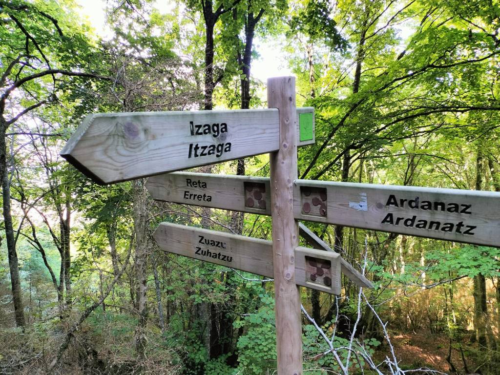 Nos juntamos Fede, Felipe, Javier, Juanjo y Juan Cruz y, para evitar la lluvia de Donosti, nos vamos Ardanaz de Izagaondoa, después de hacer un interesante recorrido por las rotondas de Pamplona y alrededores. Hacemos una ruta circular que nos lleva a Peña Izaga (1354m) y Ganbella (1260)m. Son 15,22 km con un desnivel positivo acumulado de 988m que completamos en 4:57 horas. Comenzamos a andar con 15º de temperatura y terminamos con 21º. A primera hora el cielo nublado para ir, poco a poco, despejando. En la parte alta, sin protección del bosque, soplaba un aire frio que nos obligó a ponernos los cortavientos.